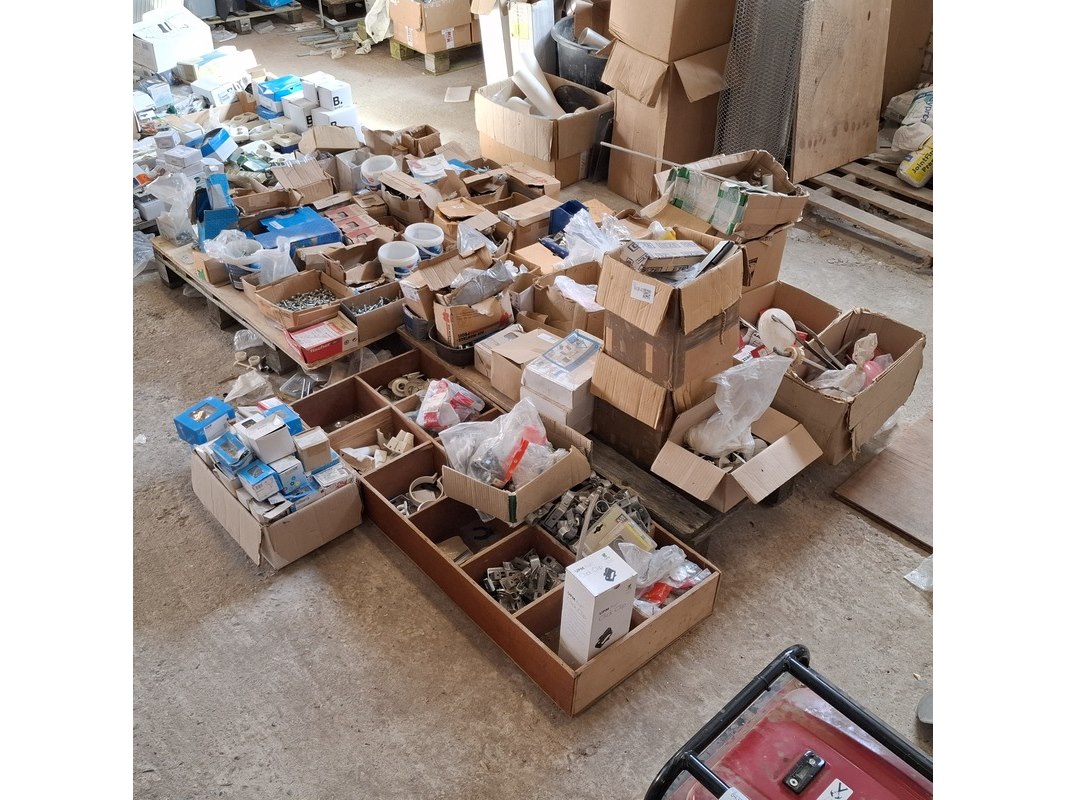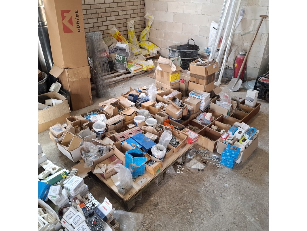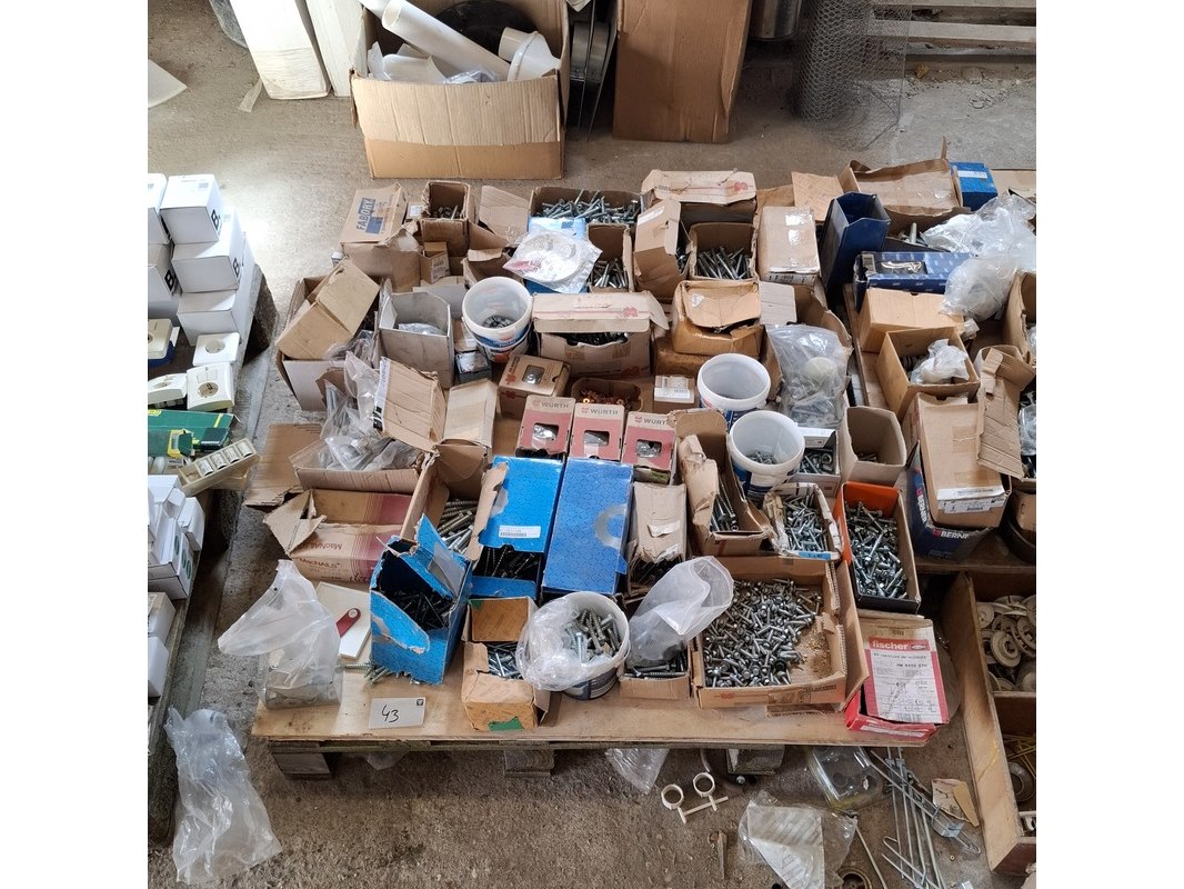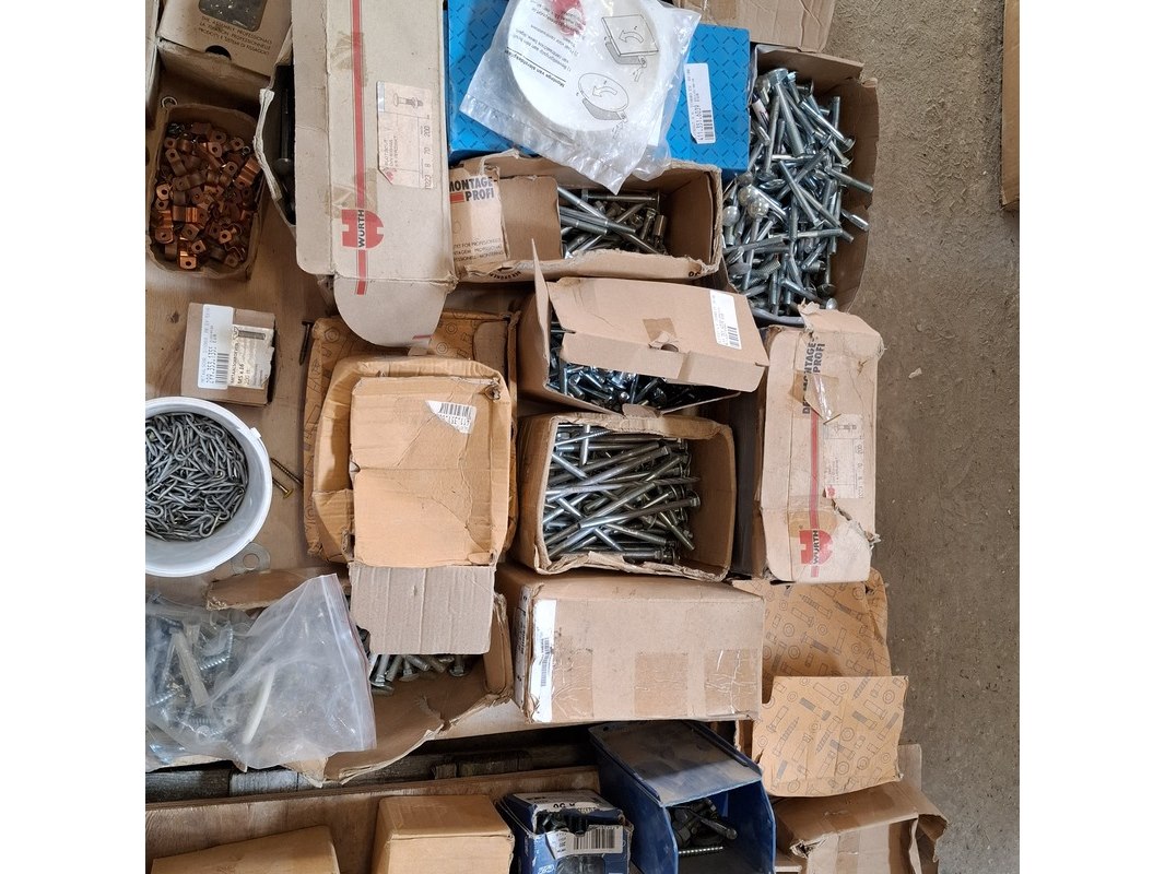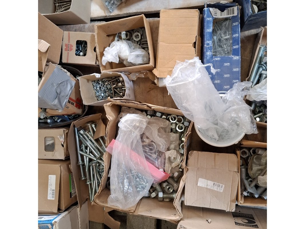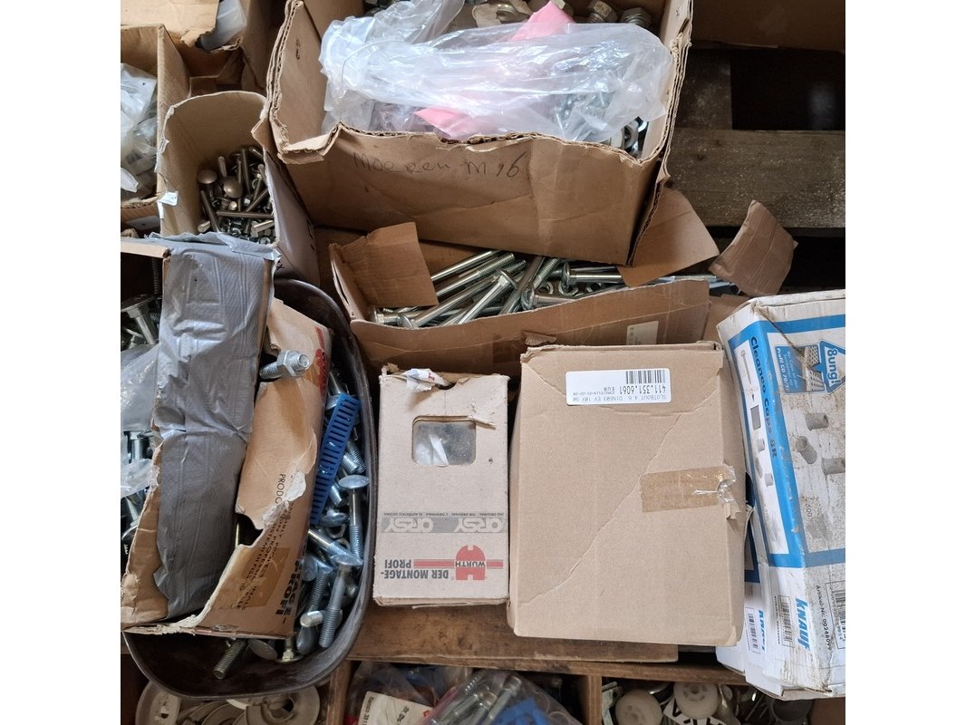 Product: Assortiment ijzerwaar Specificaties: bestaande uit o.a. : rvs trespa schroeven, bouten, moeren, houtdraadbouten, slotbouten, thermostaatknoppen etc.