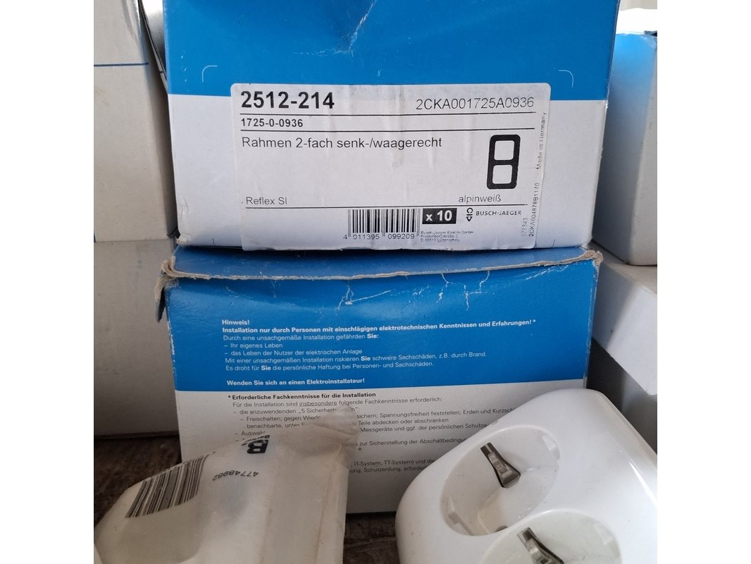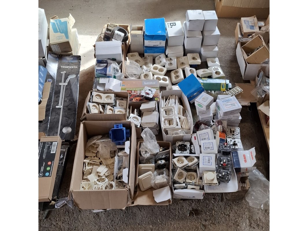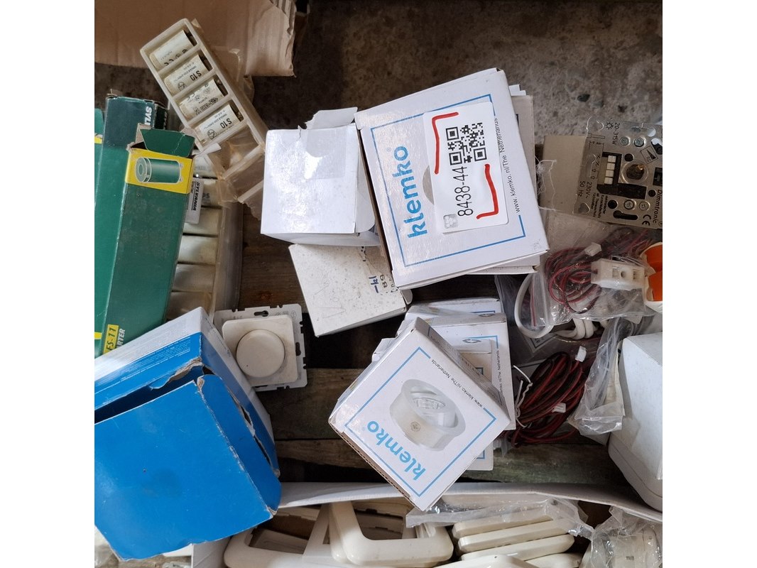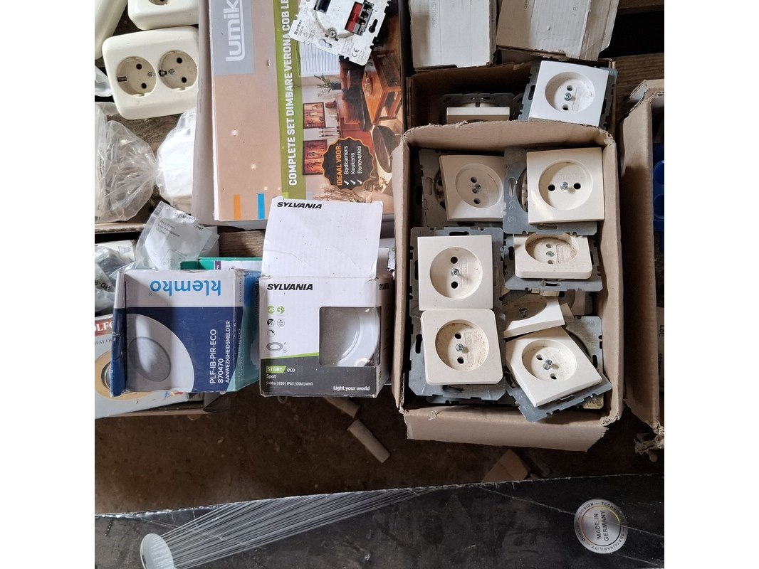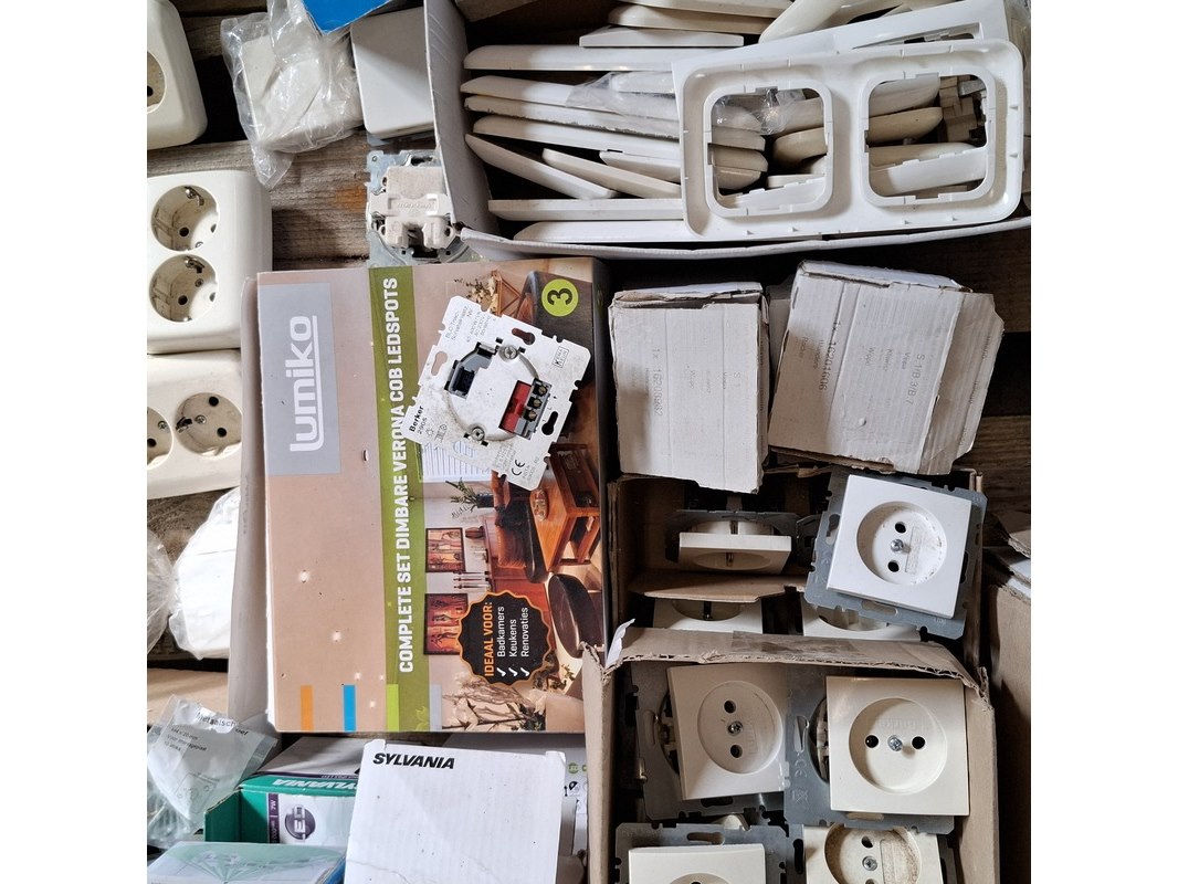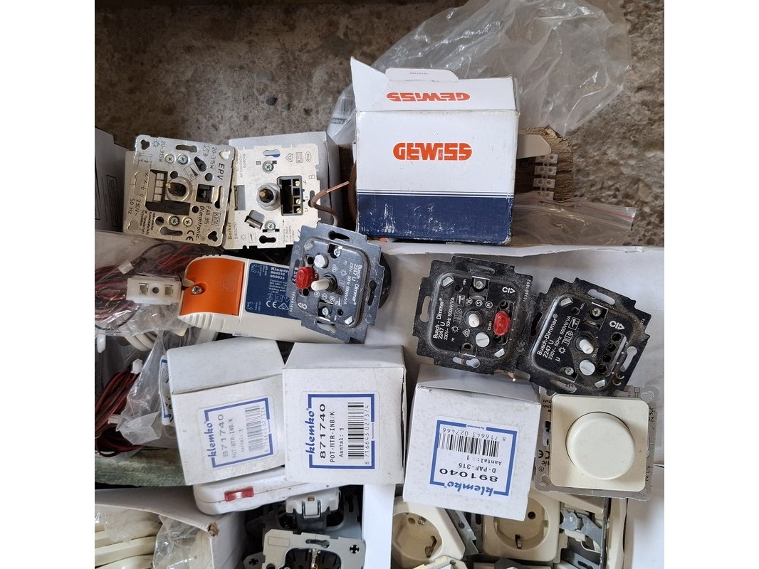 Merk: o.a. Busch en Jaeger, Berker Product: Assortiment schakelmateriaal Specificaties: bestaande uit o.a. : dimmers, WCD's, installatie automaten, afdekplaten, led inbouwspotjes, etc.