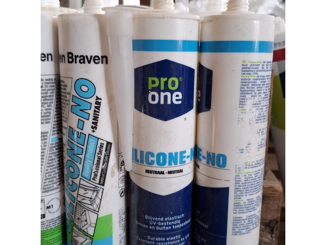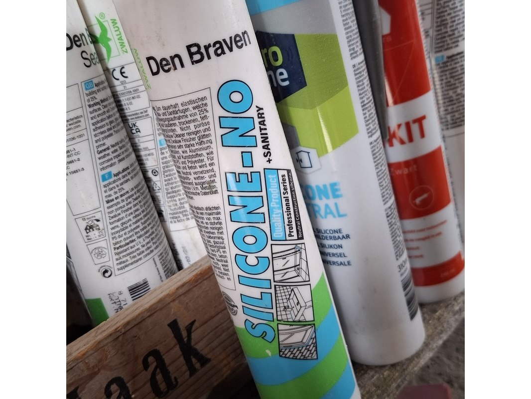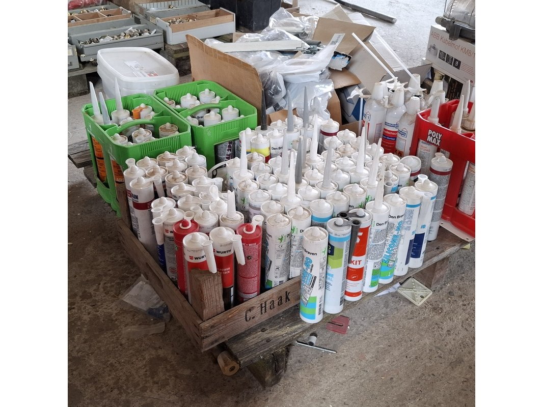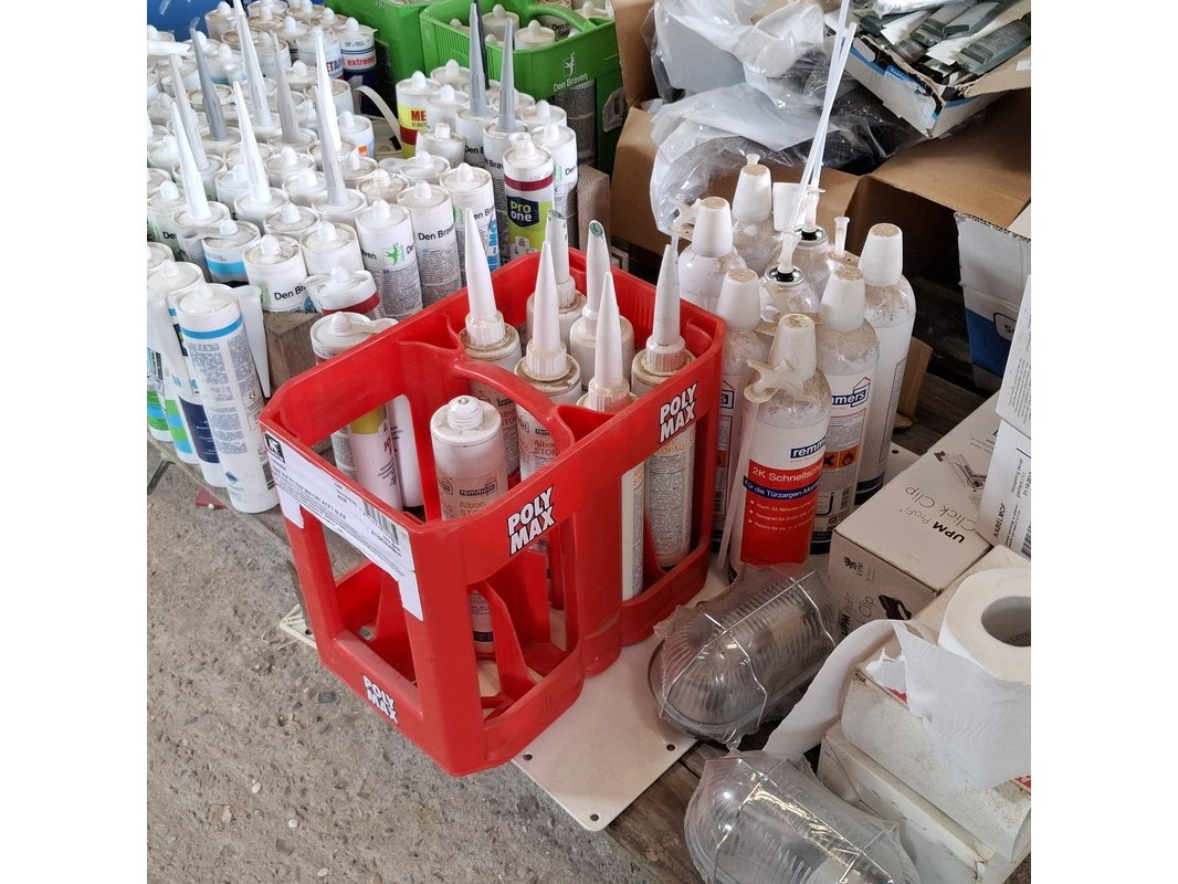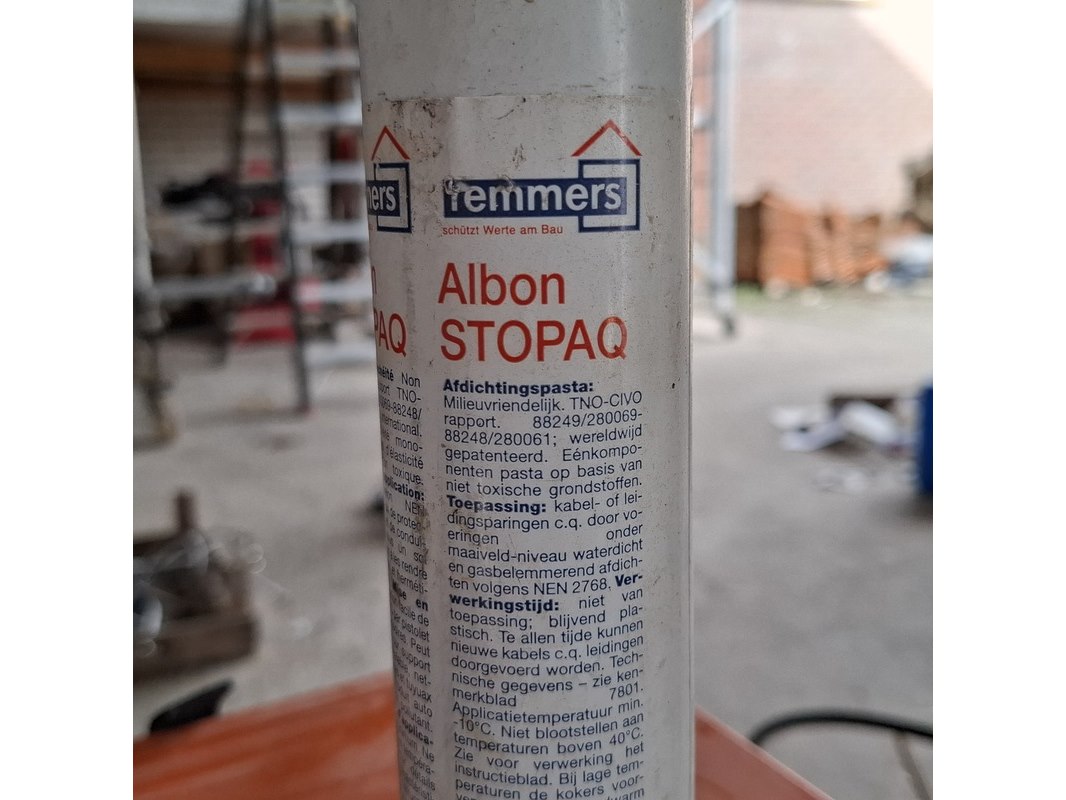 Product: Partij bouwbenodigdheden Specificaties: o.a. : diverse kitten, glasblokjes, kabelmoffen, uitvulplaatjes, aqua stop etc.