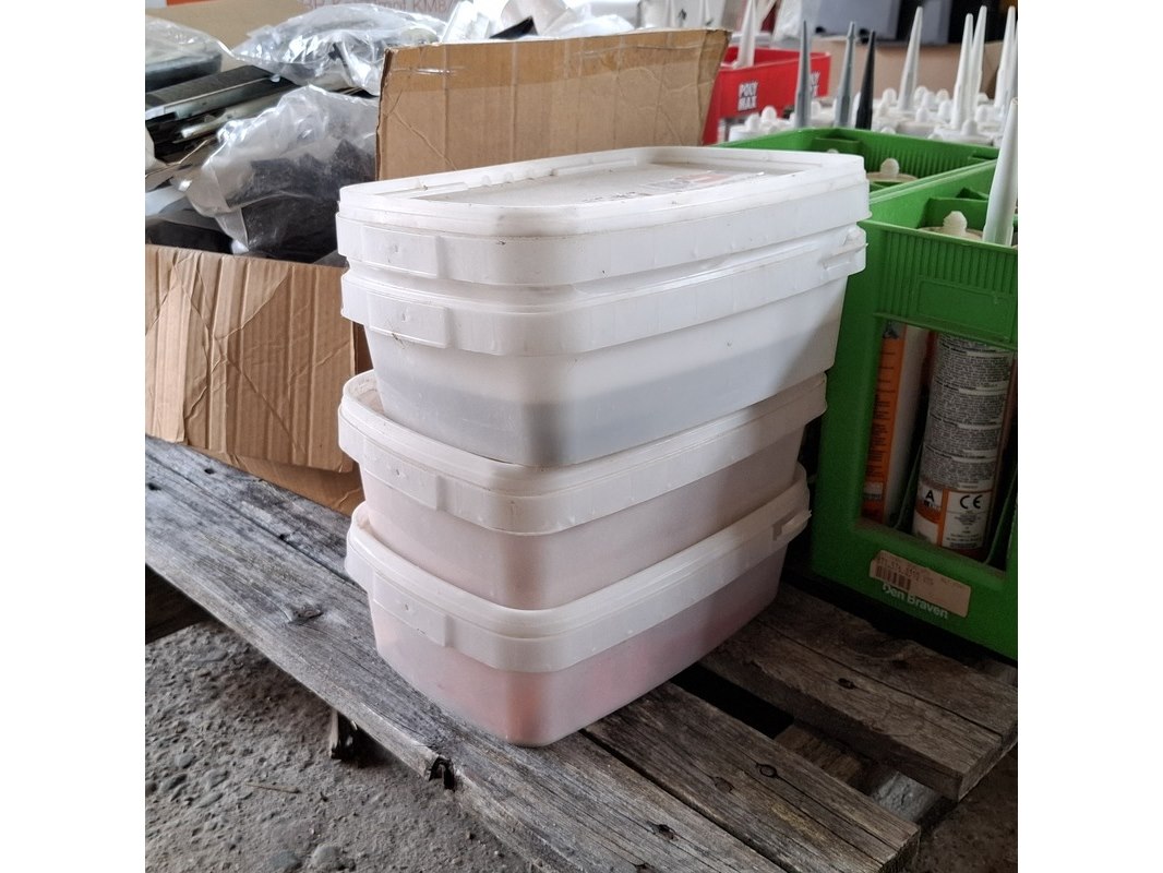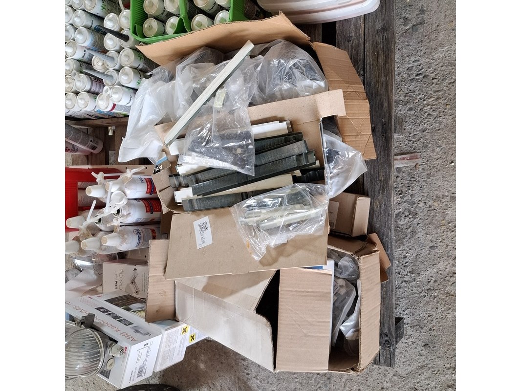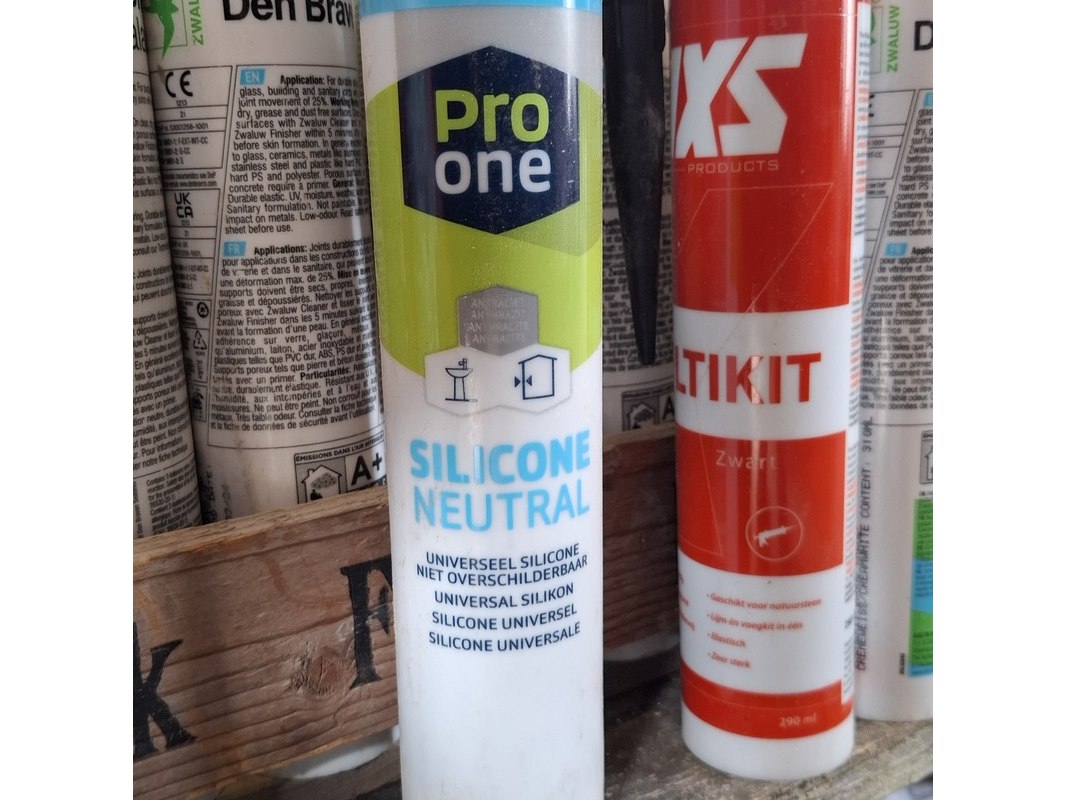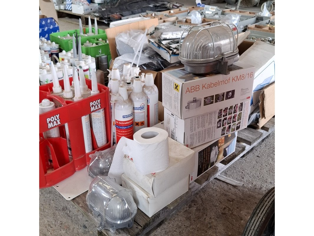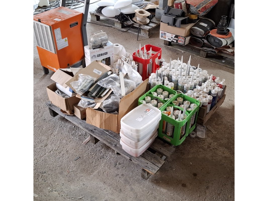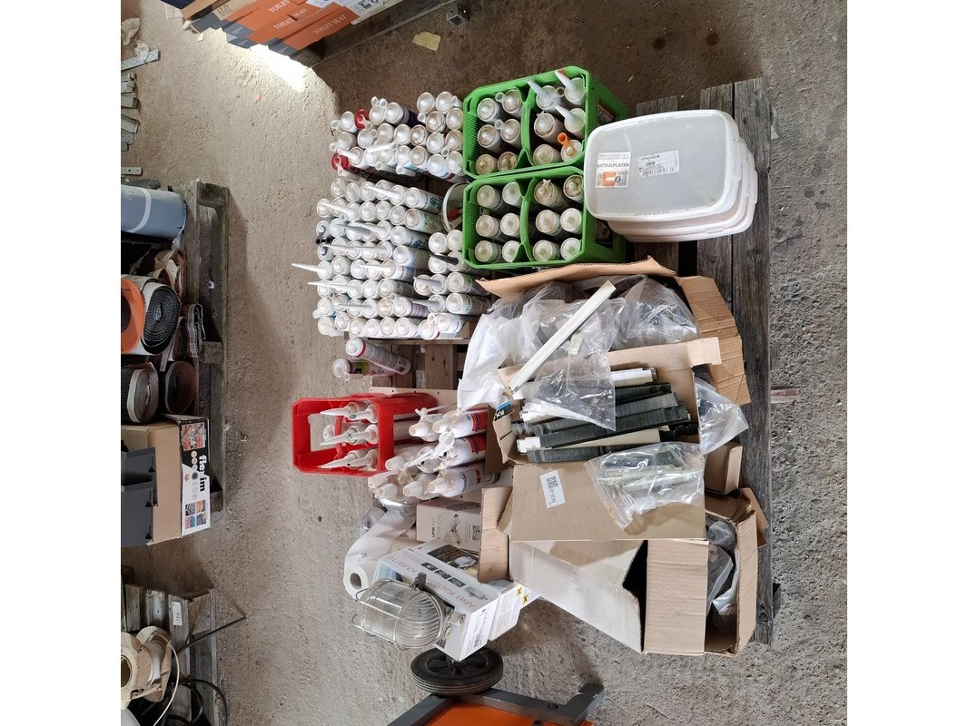Product: Partij bouwbenodigdheden Specificaties: o.a. : diverse kitten, glasblokjes, kabelmoffen, uitvulplaatjes, aqua stop etc.