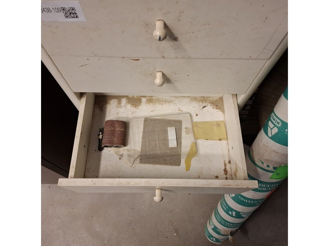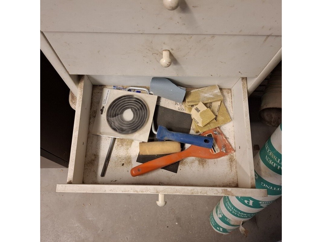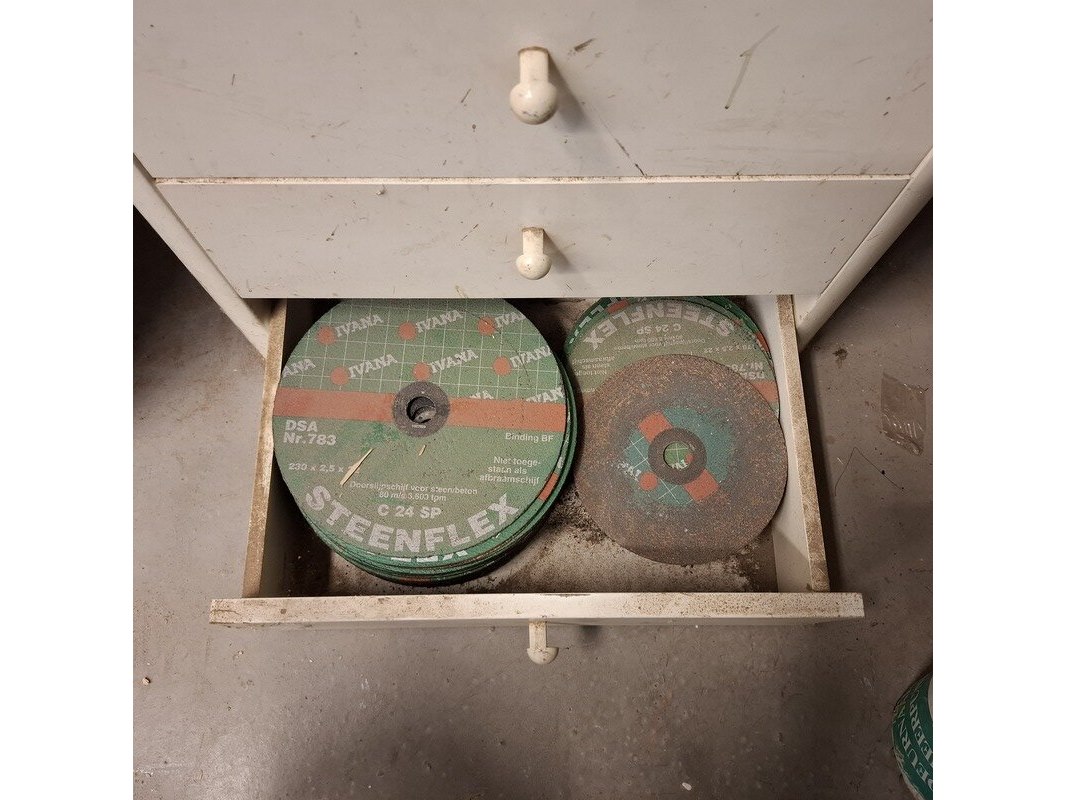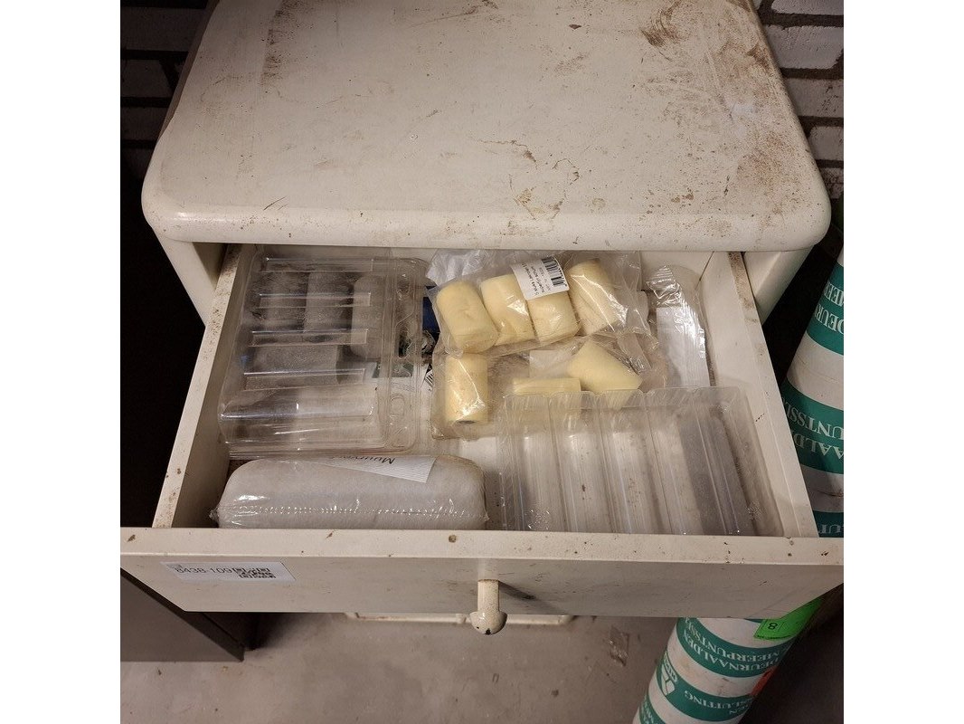 Product: Ladekast met inhoud Materiaal: hout Afmeting: hxbxd ca. 62x53x38cm Specificaties: inhoud: tape, verfrollen, doorslijpschijven, afbraamschijven etc.