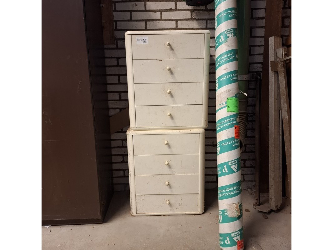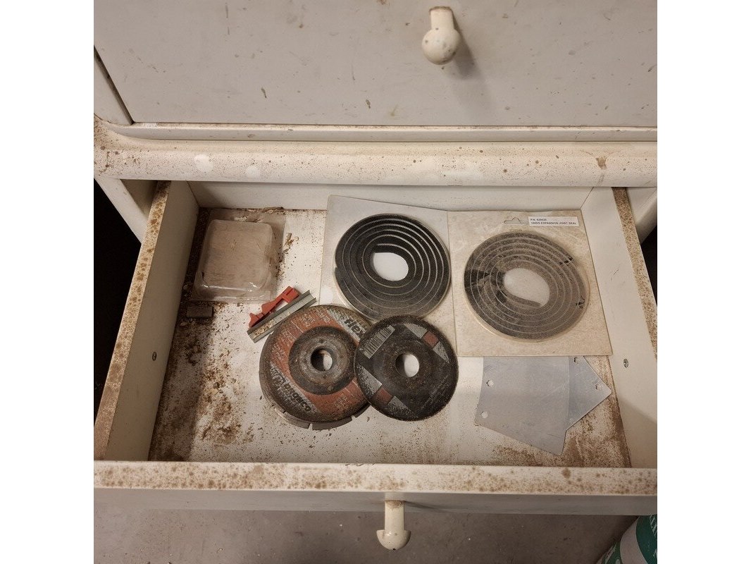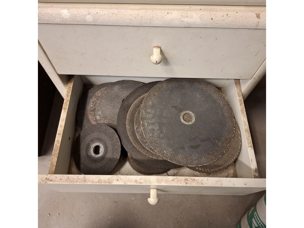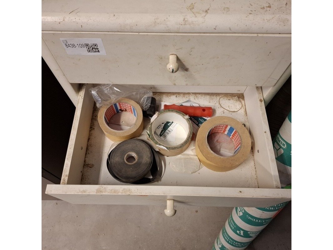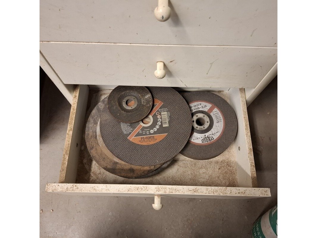 Product: Ladekast met inhoud Materiaal: hout Afmeting: hxbxd ca. 62x53x38cm Specificaties: inhoud: tape, verfrollen, doorslijpschijven, afbraamschijven etc.