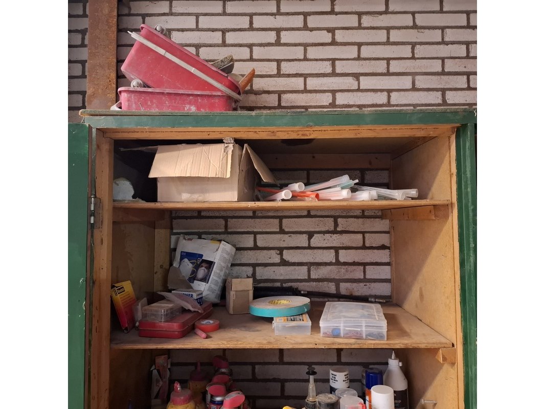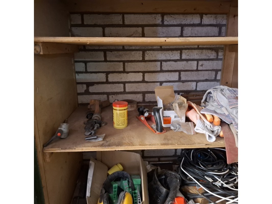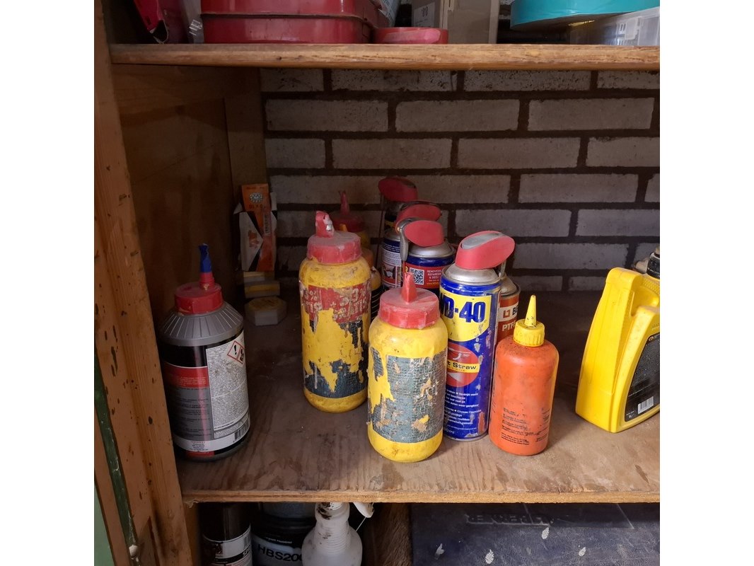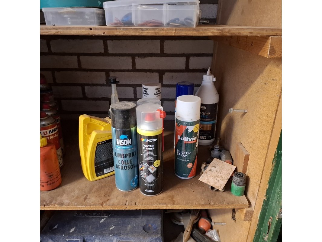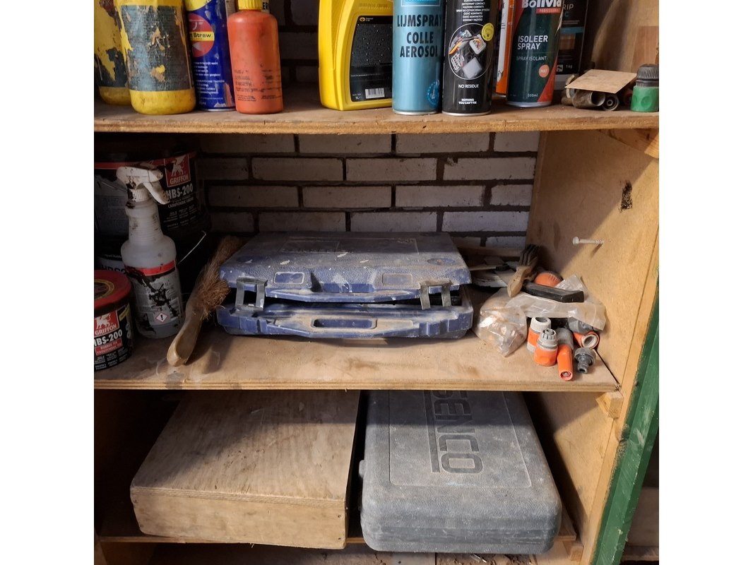 Product: Inhoud werkkast Specificaties: inhoud: diverse spuitbussen, assortiment dozen, afzetlint, kitpistool, chemische ankers, glasdragers, etc.