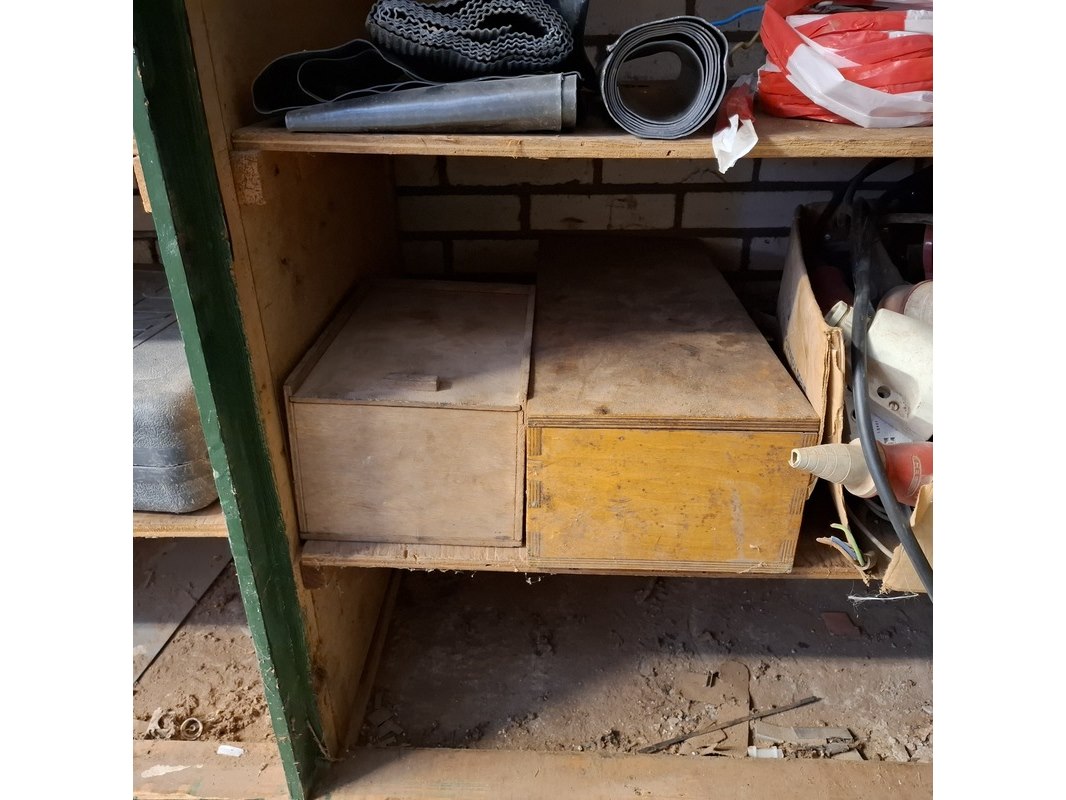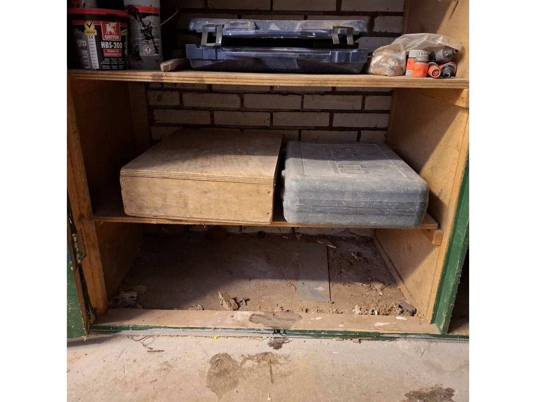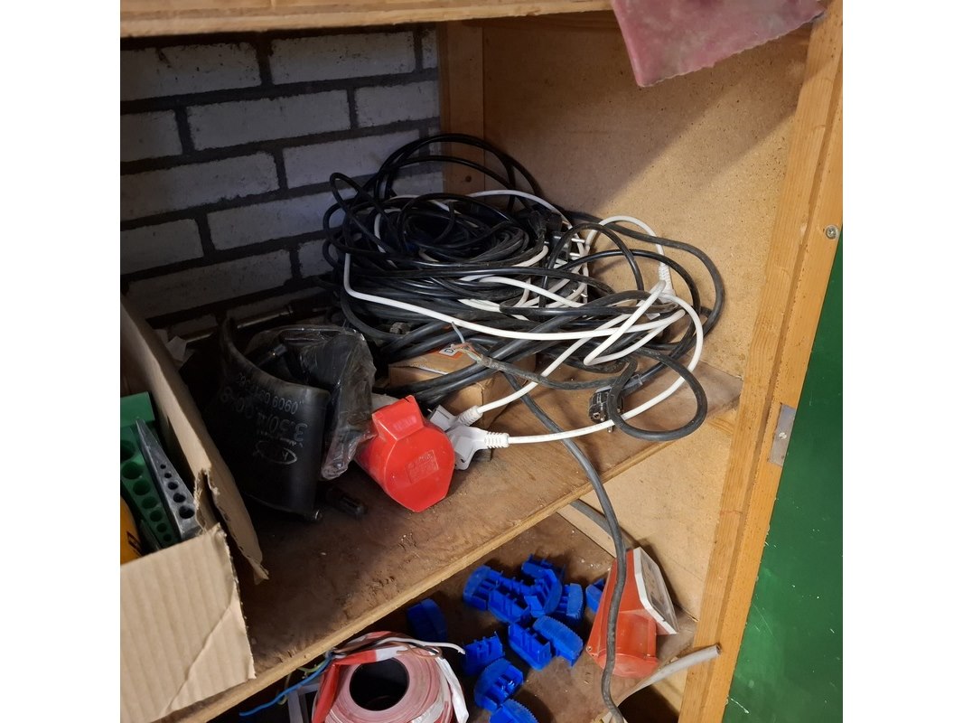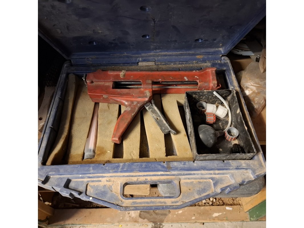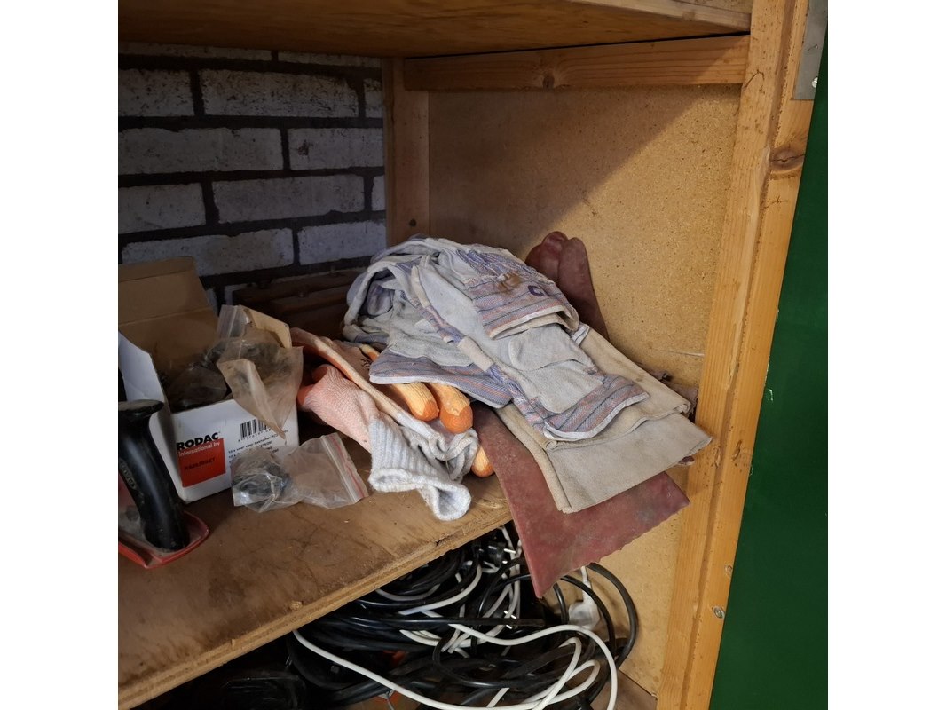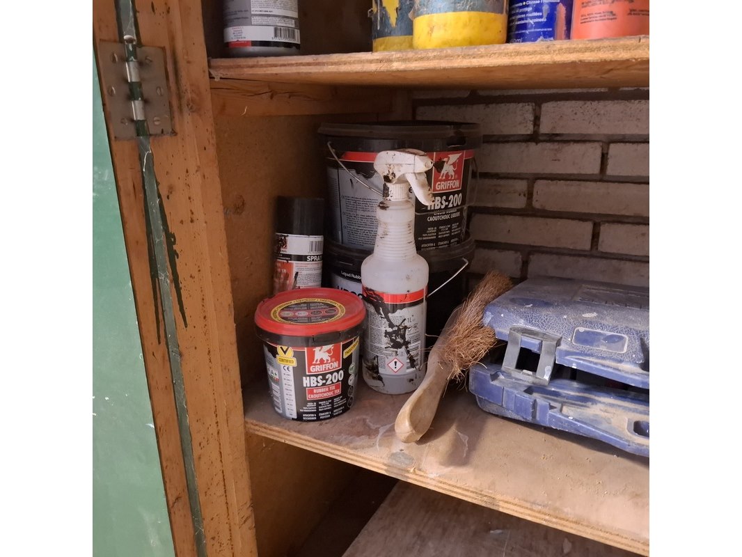 Product: Inhoud werkkast Specificaties: inhoud: diverse spuitbussen, assortiment dozen, afzetlint, kitpistool, chemische ankers, glasdragers, etc.