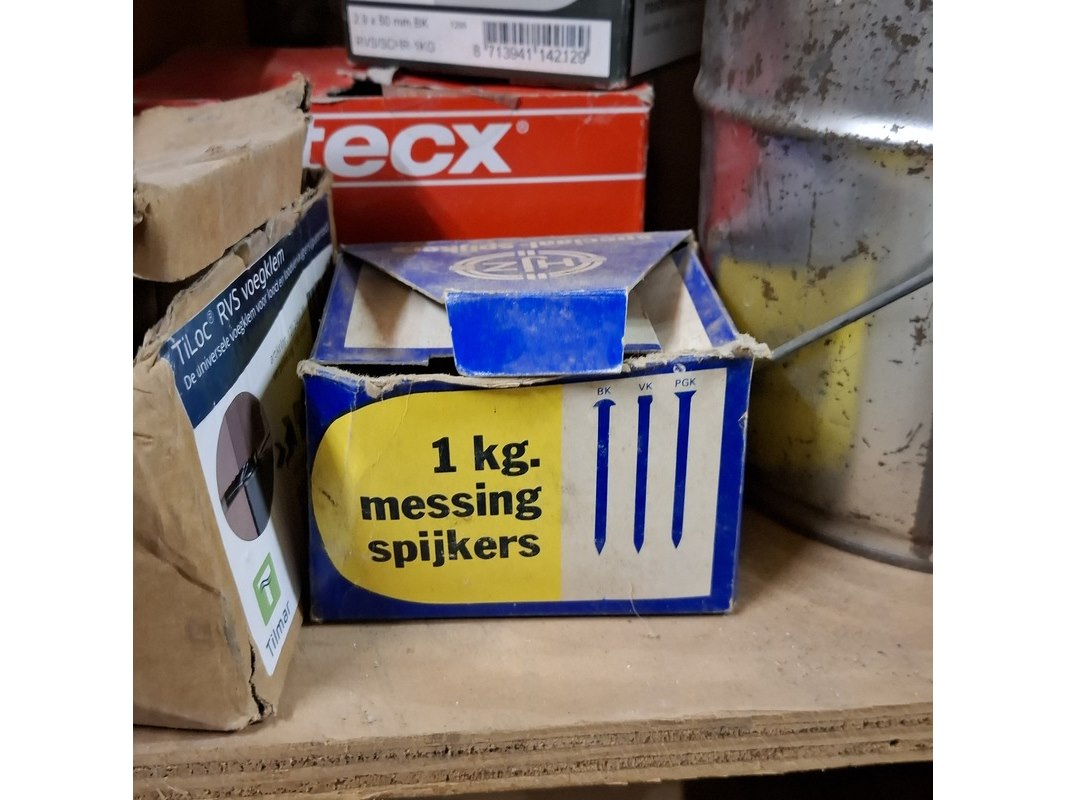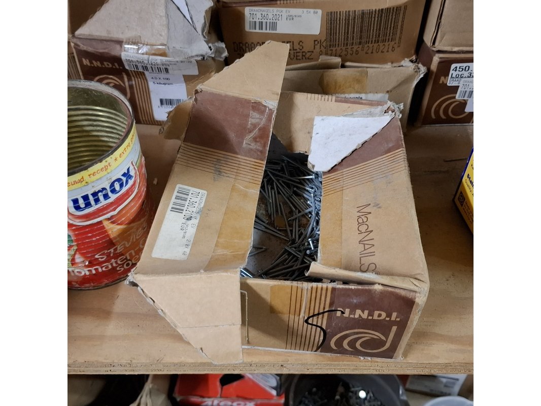 Product: Assortiment ijzerwaar in 3x stellingvak Specificaties: o.a.: ruitkopnagels, draadnagels, rvs nagels, kozijnankers etc.