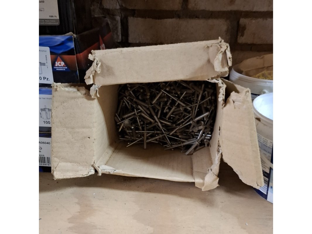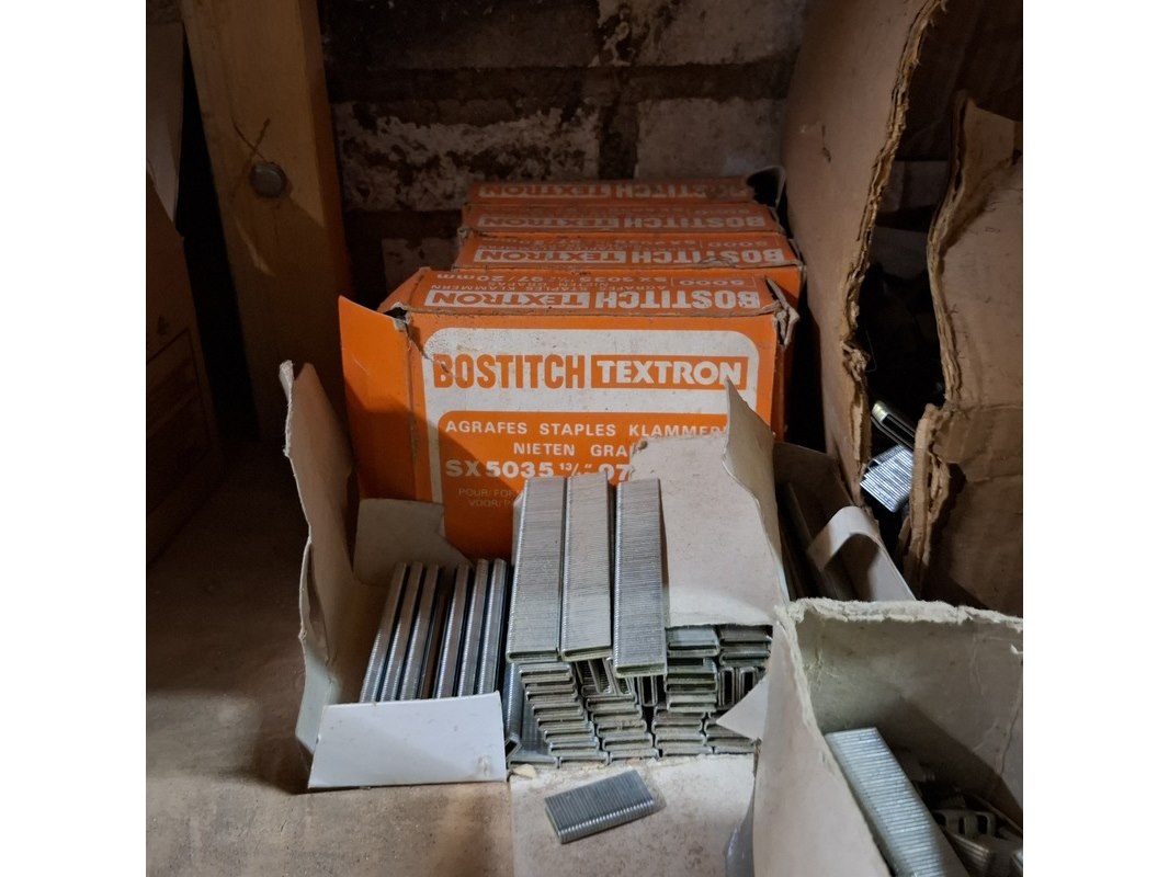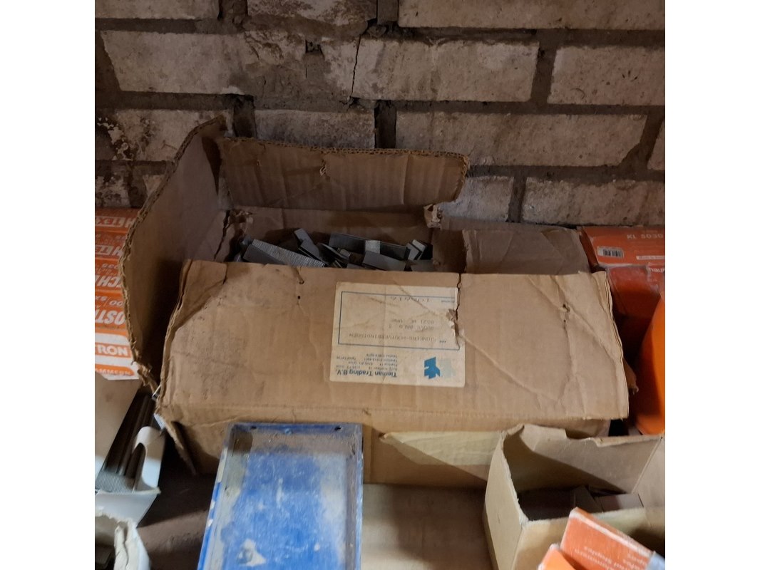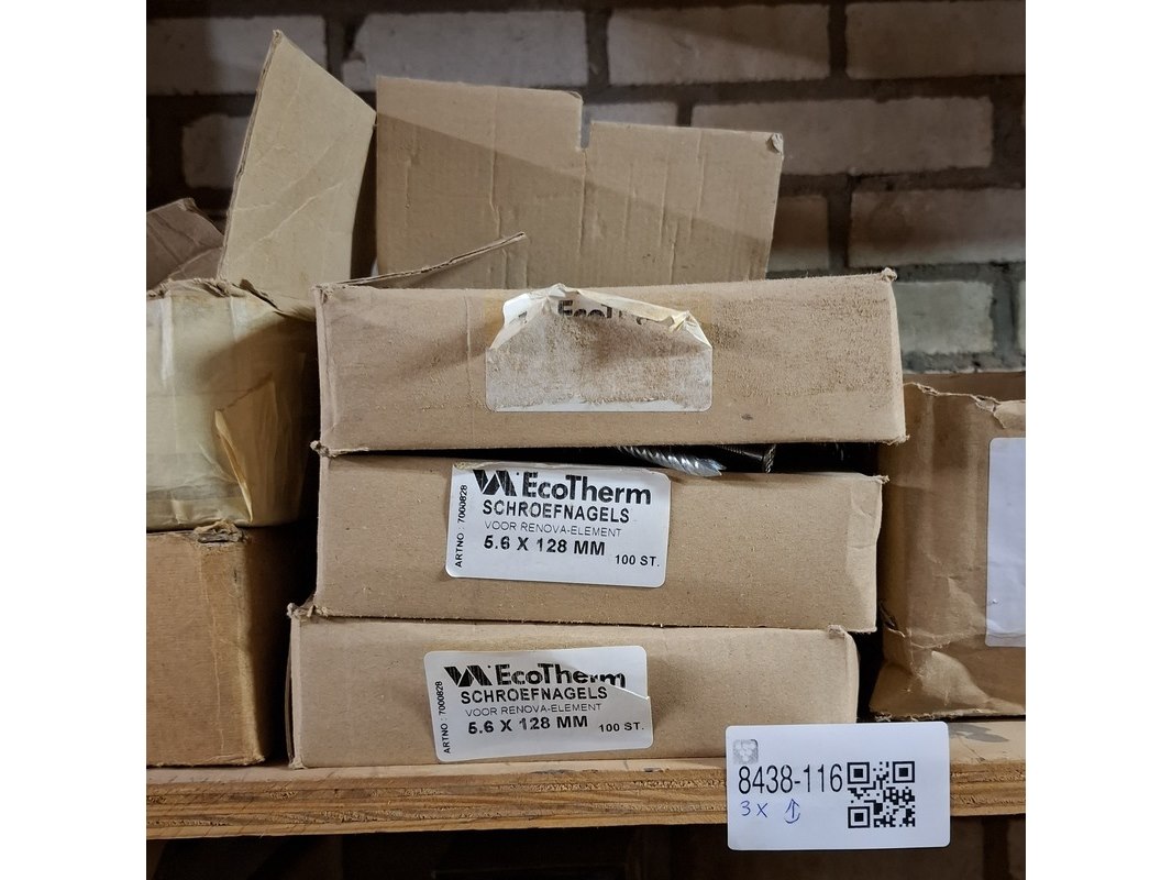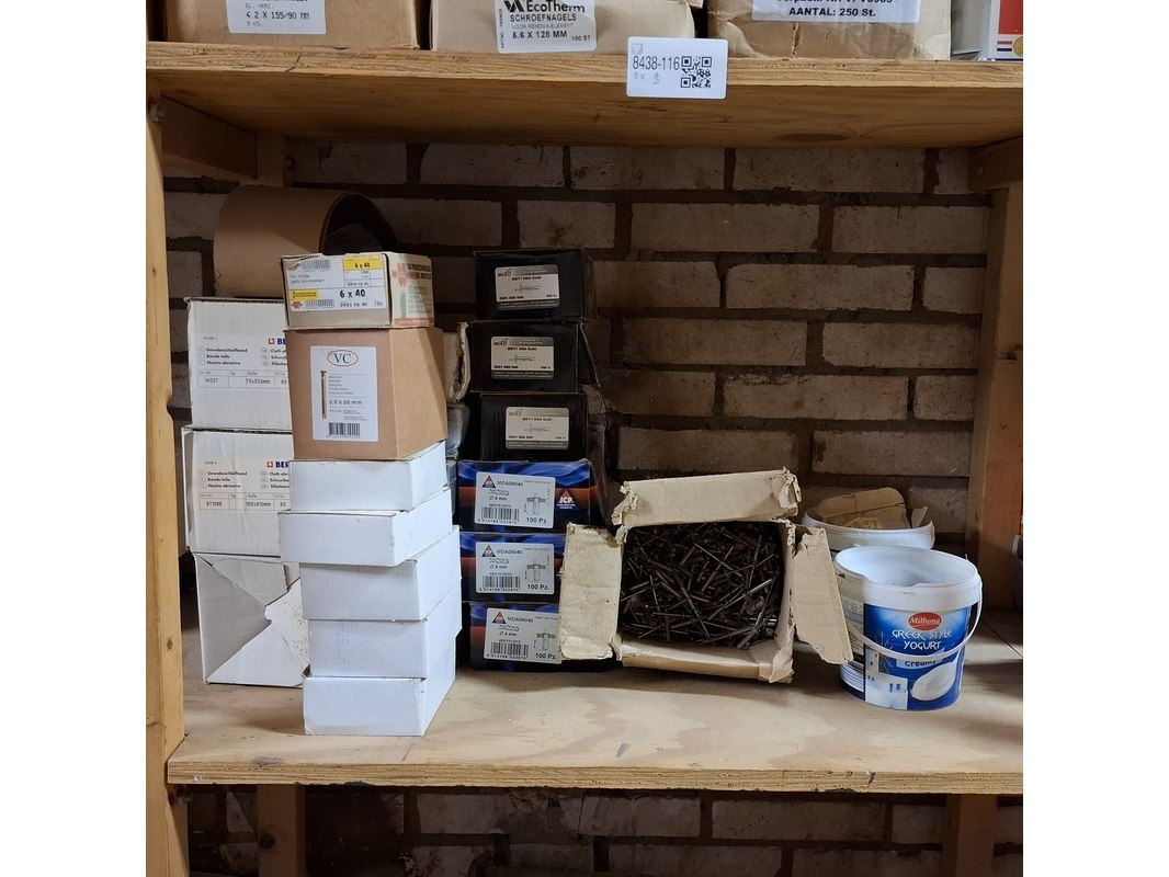 Product: Assortiment ijzerwaar in 3x stellingvak Specificaties: o.a.: schroefnagels, duplexnagels, popnagels, nieten, staalkabels etc.