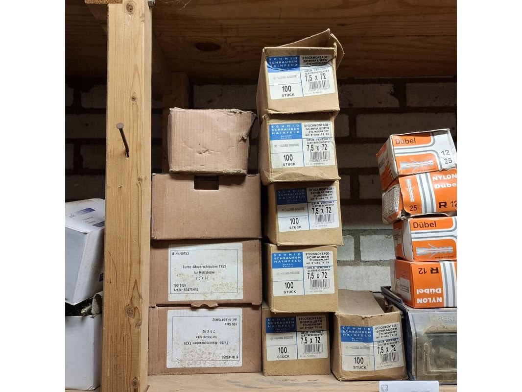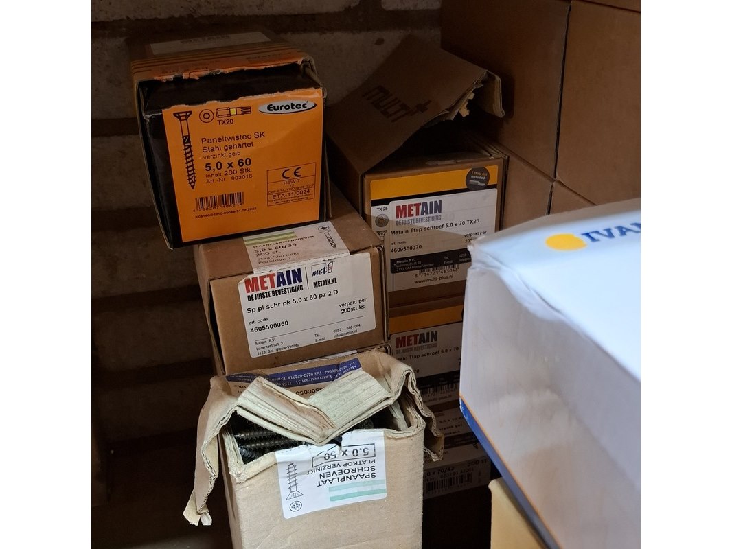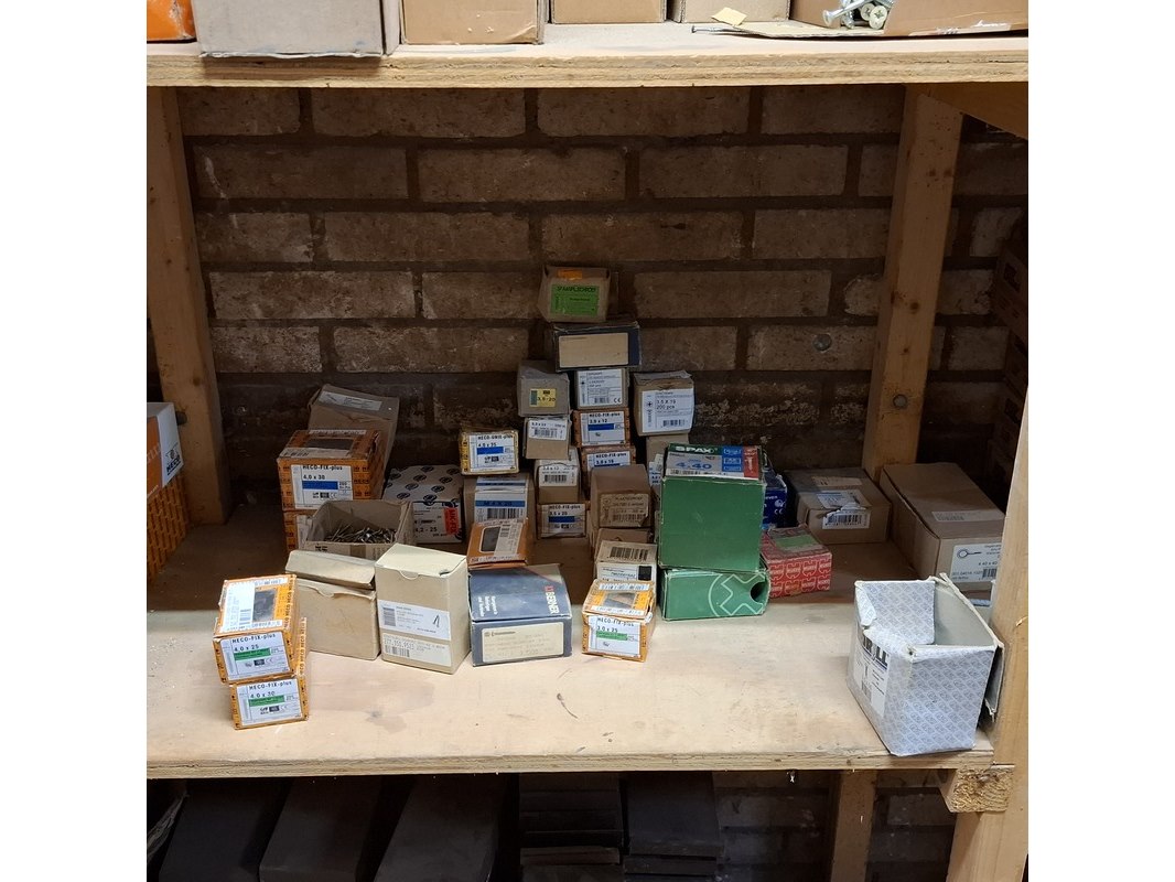 Product: Assortiment ijzerwaar in 3x stellingvak Specificaties: o.a.: pluggen, spaanplaatschroeven, rvs schroeven, kozijnschroeven etc.