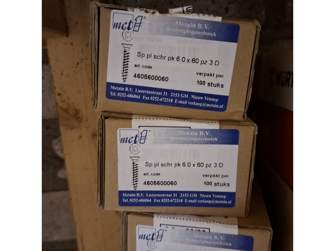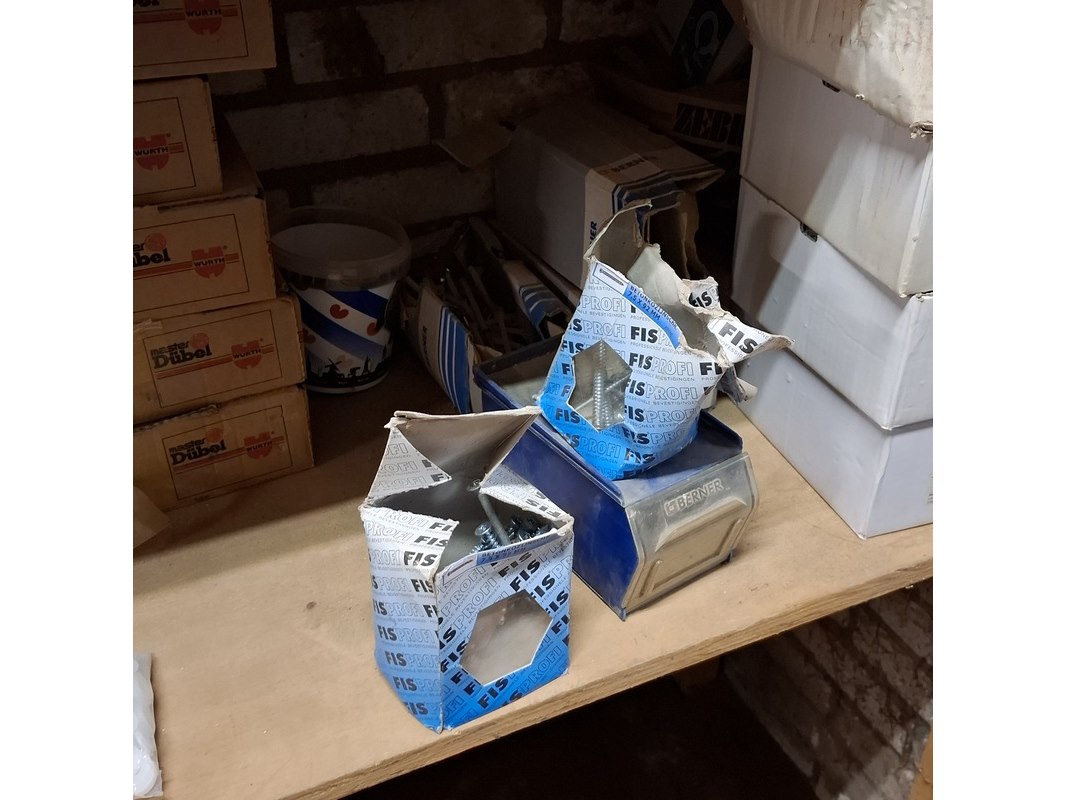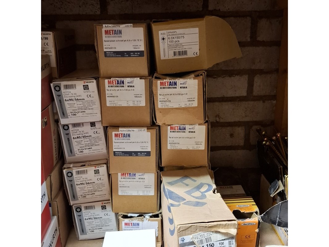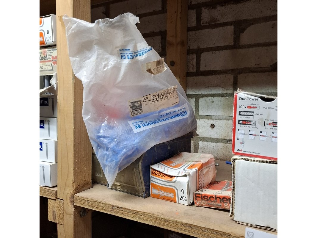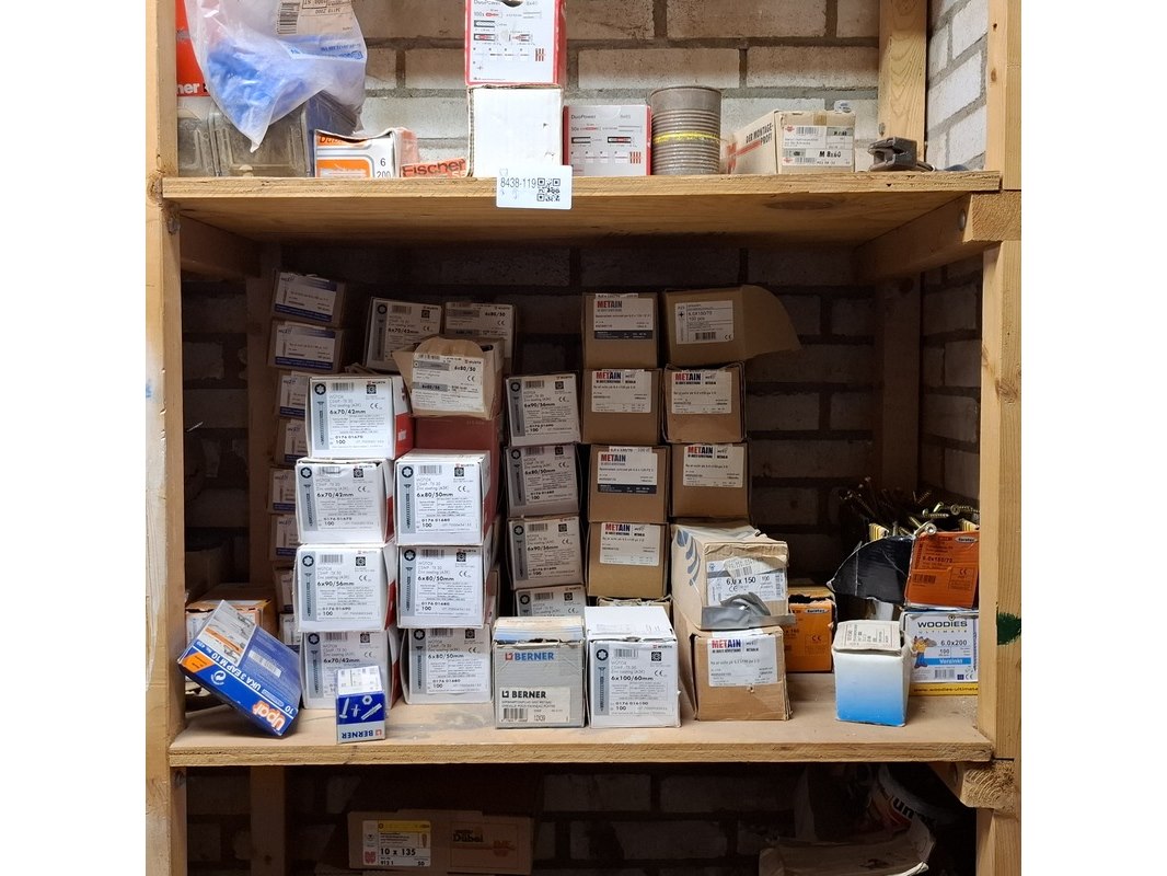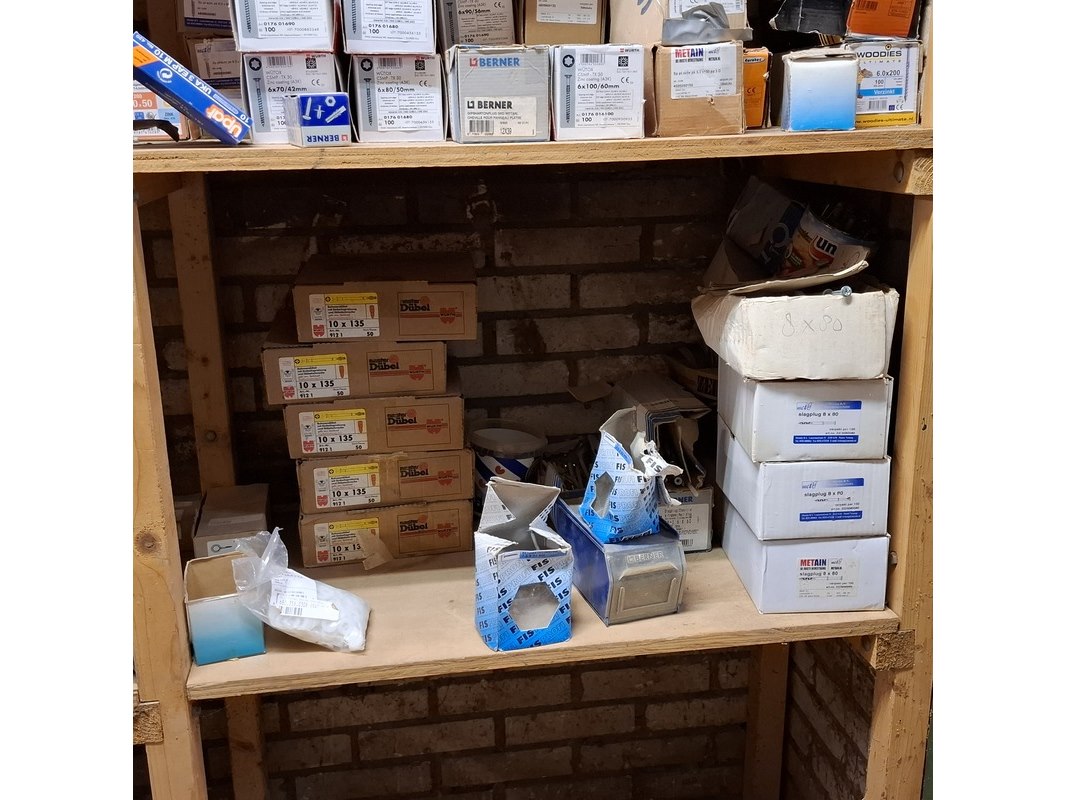 Product: Assortiment ijzerwaar in 3x stellingvak Specificaties: o.a.: pluggen, spaanplaatschroeven, kozijnpluggen, slagpluggen etc.