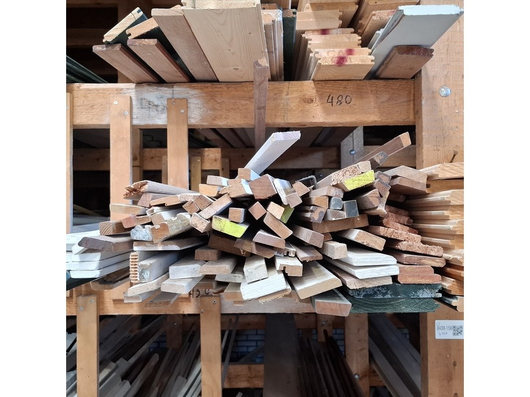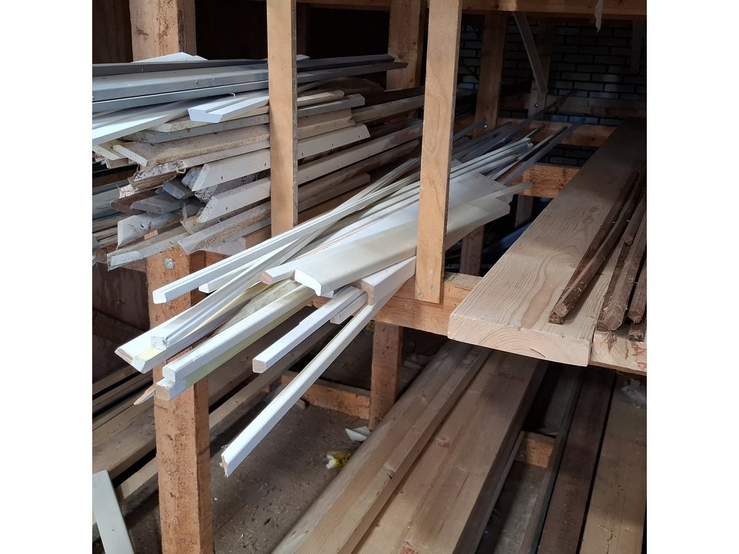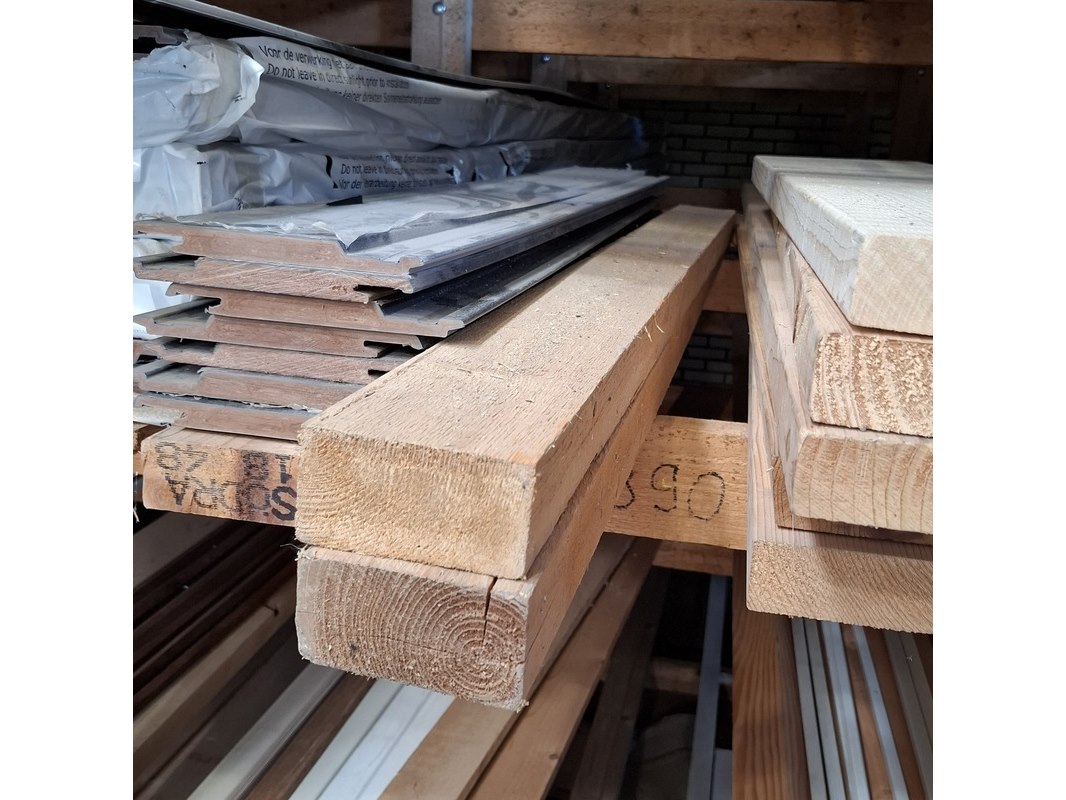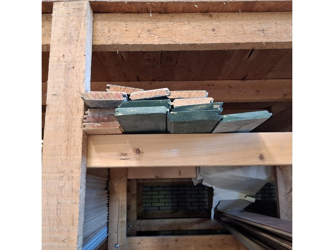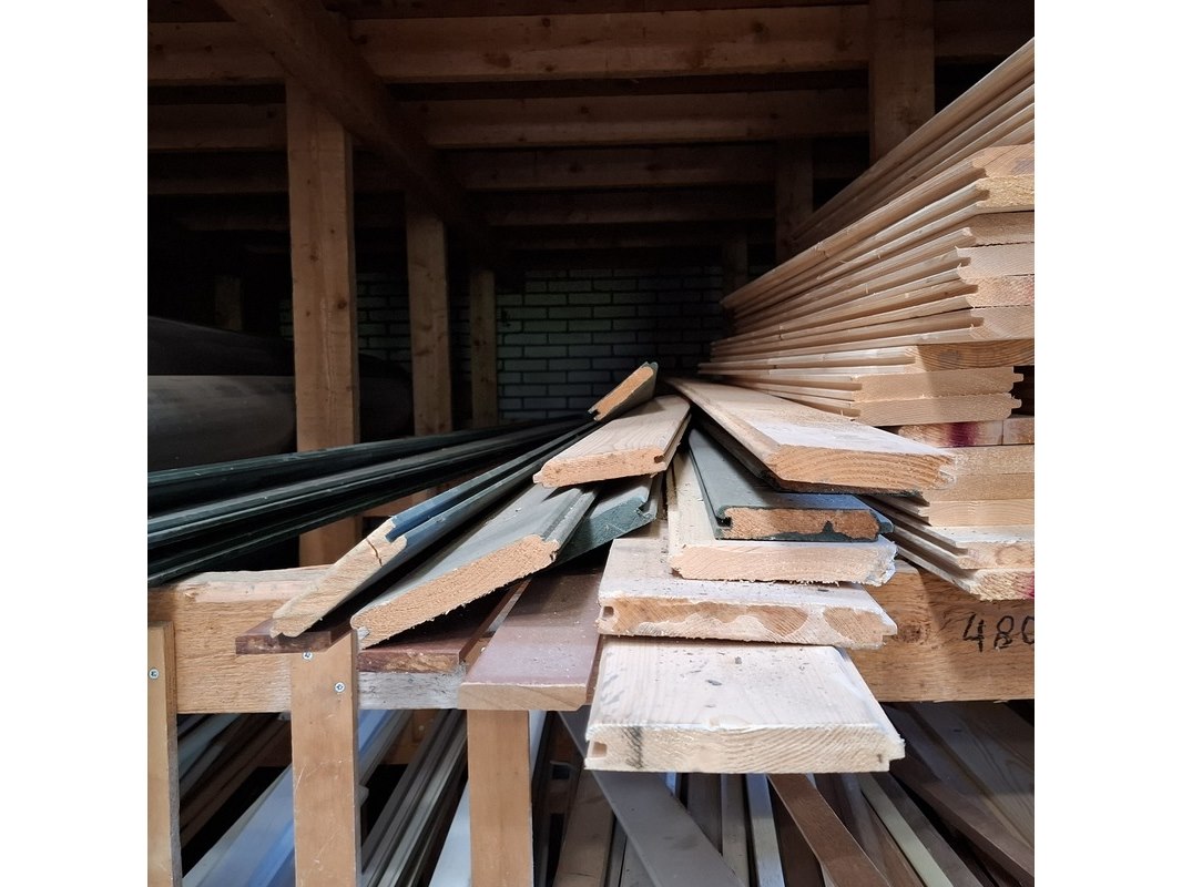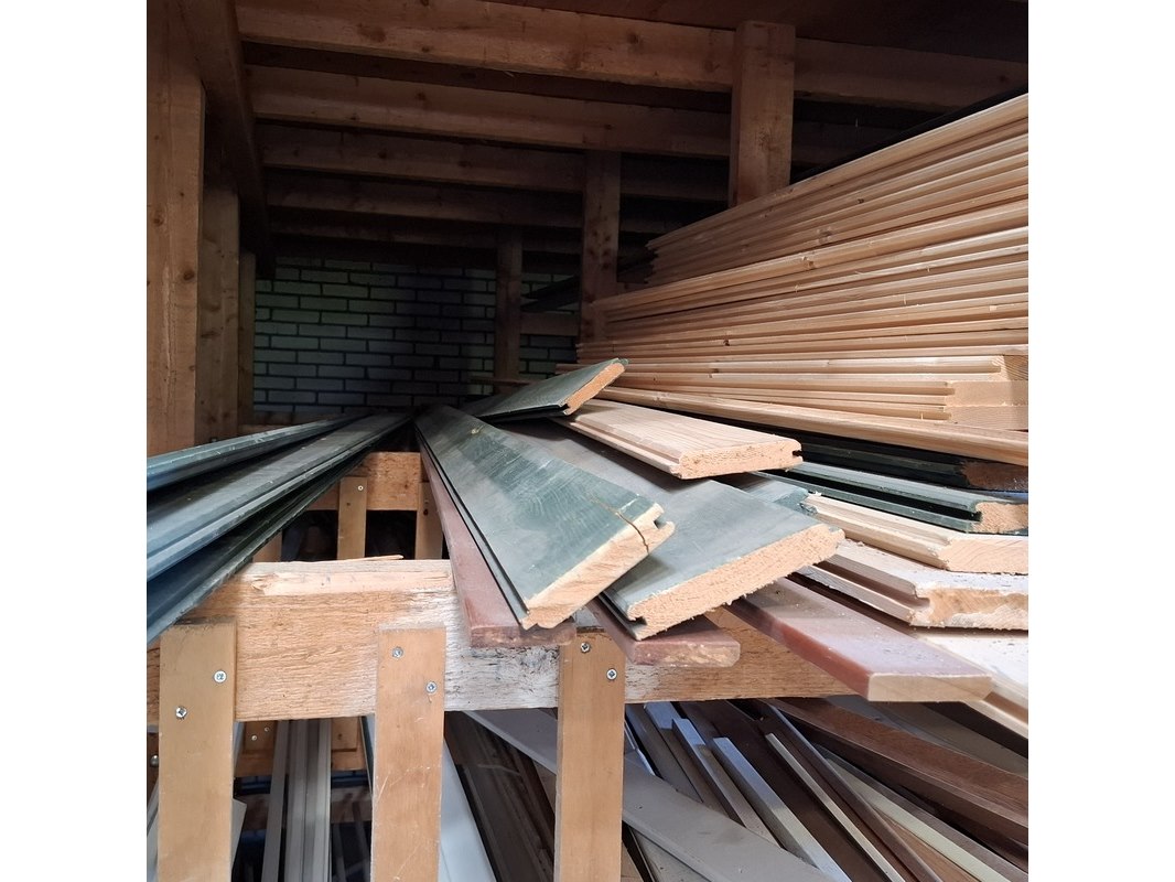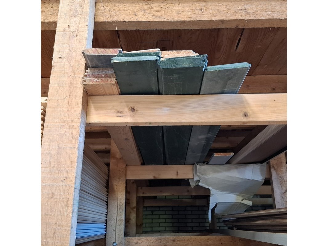Product: Partij houten planken en latten in 7x vak Afmeting: max lengte ca. 500cm