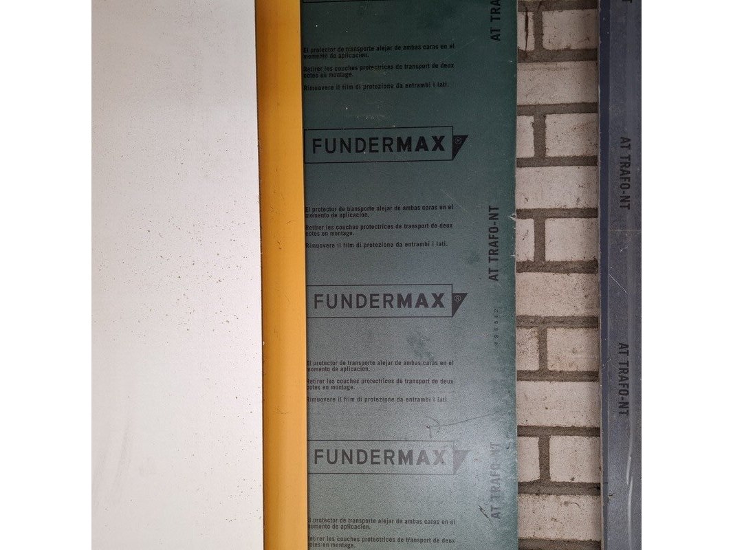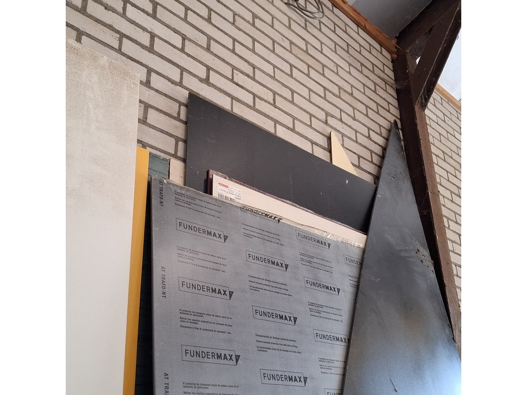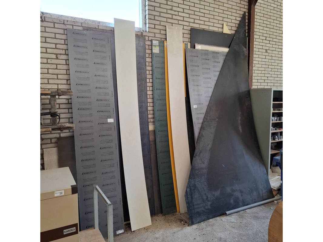 Product: Partij HPL en trespa plaatmateriaal Afmeting: max 300 cm