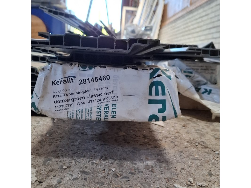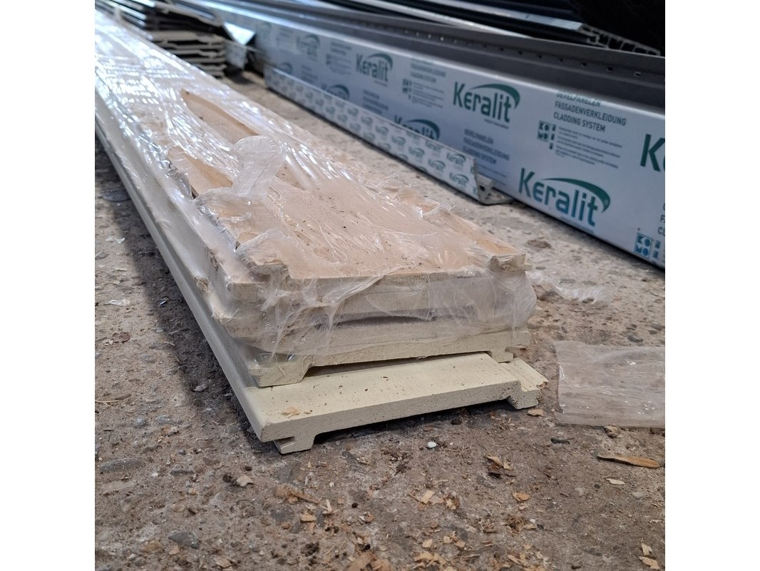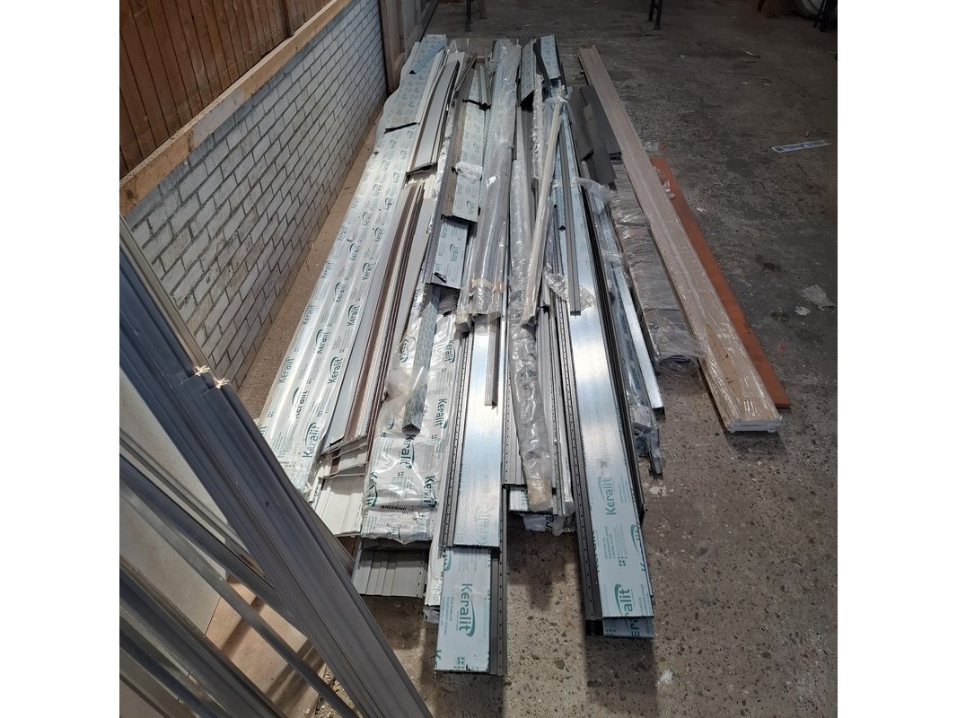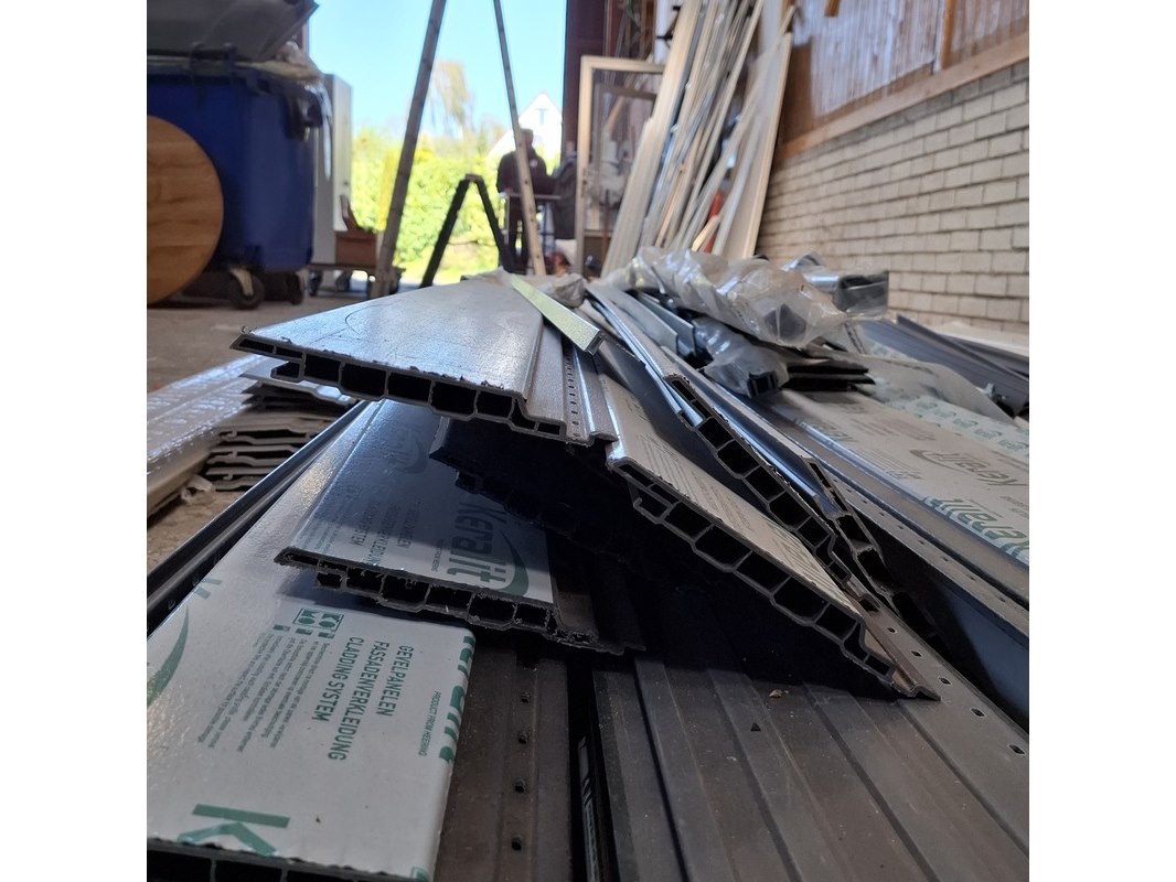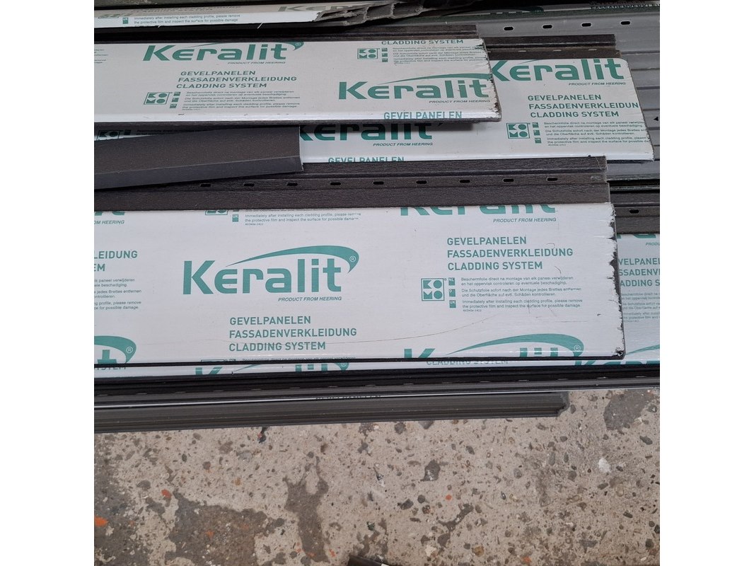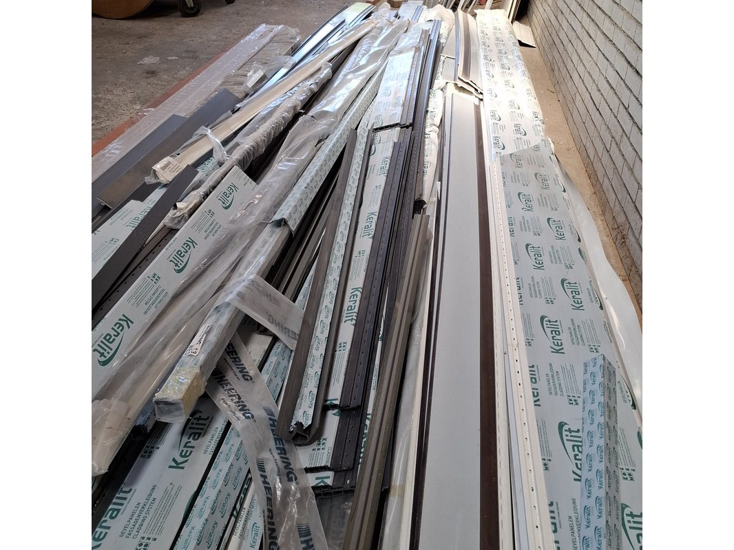 Product: Partij Keralit gevelpanelen Kleur: diverse kleuren Afmeting: diverse lengtes, max lengte ca. 600cm Specificaties: inclusief diverse aluminium profielen en kunststof afdekprofielen