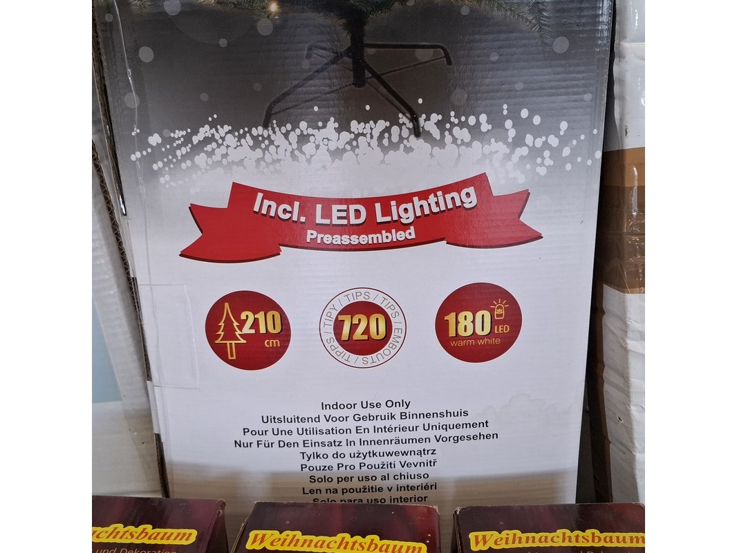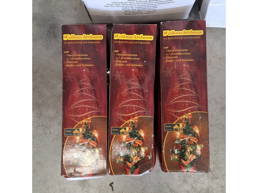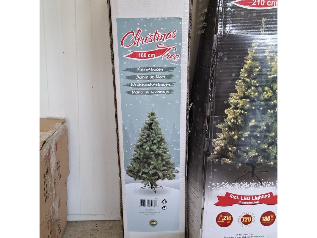 Product: Kerstboom Specificaties: Verschillende soorten, 3x mini met verlichting en decoratie, 1x roze 150cm, 1x groen 180 cm, 1x groen met verlichting, 210 cm en 1x 150 cm