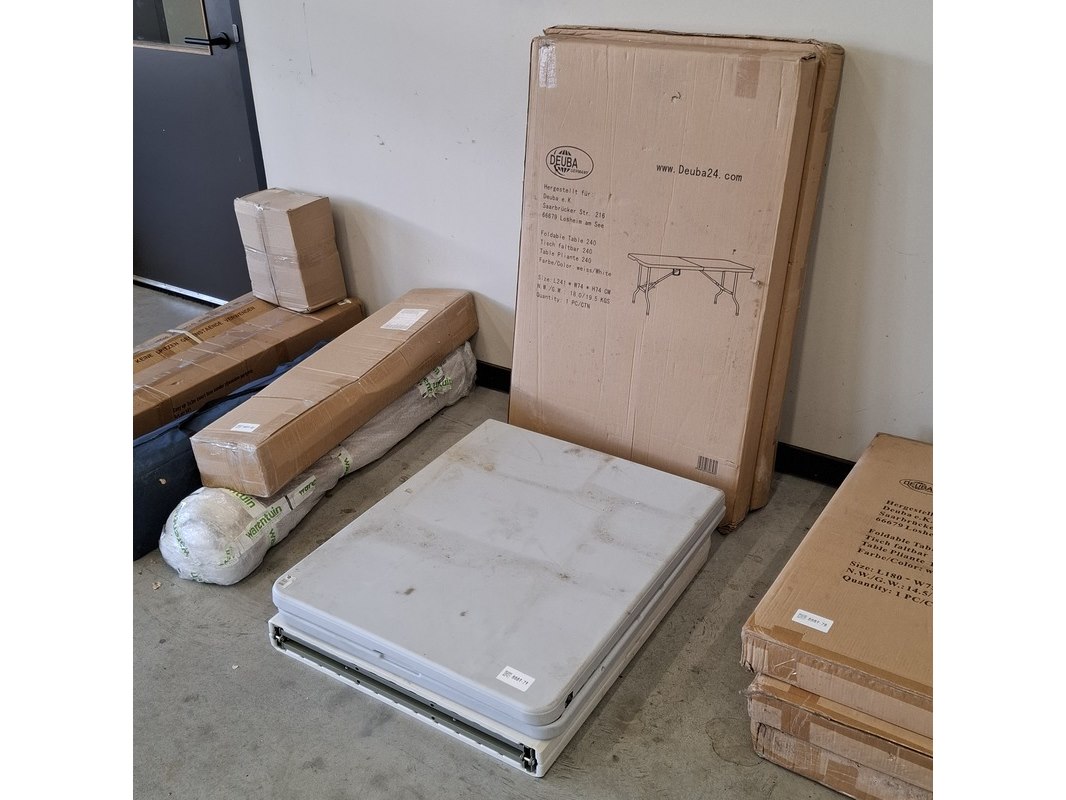 Merk: Deuba Product: Klaptafel Specificaties: 2x lxbxh ca. 241x74x74 cm, in doos en 2x lxbxh ca. 180x75x74 cm, gebruikt.