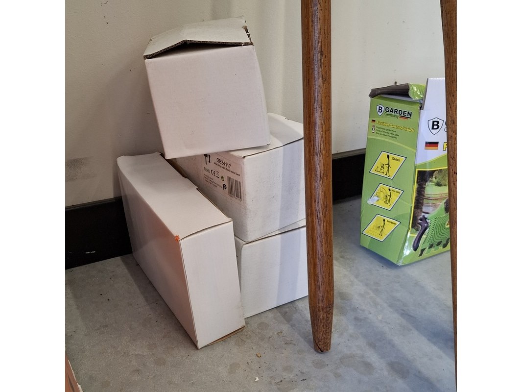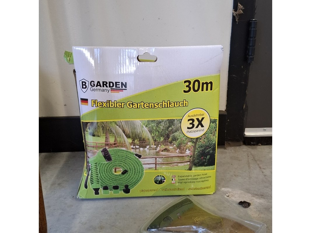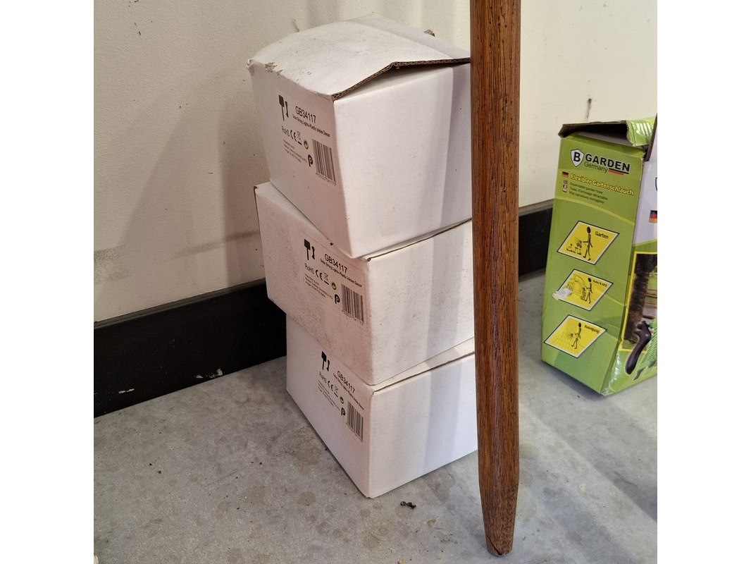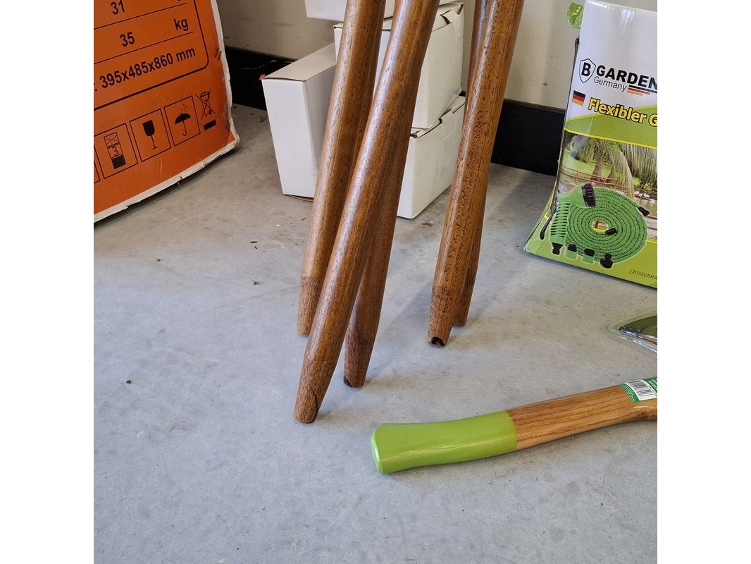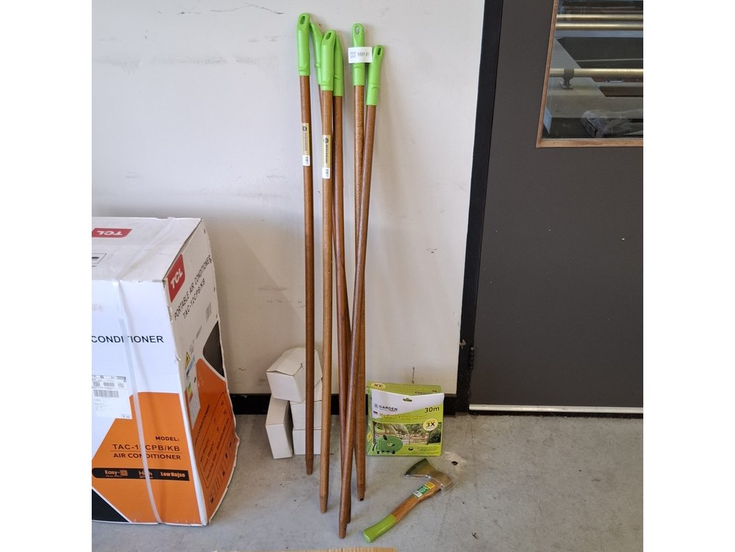 Product: Partij tuinbenodigdheden Specificaties: Bestaande uit: o.a. 6x steel met handvat, Werckmann, ca. 144 cm. Flexibele tuinslag a 30 meter, handbijl GreenBoots, 600 g, etc.