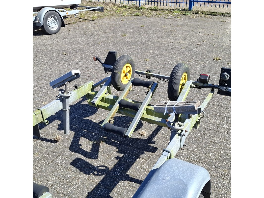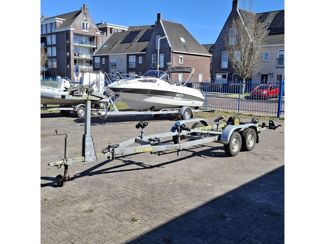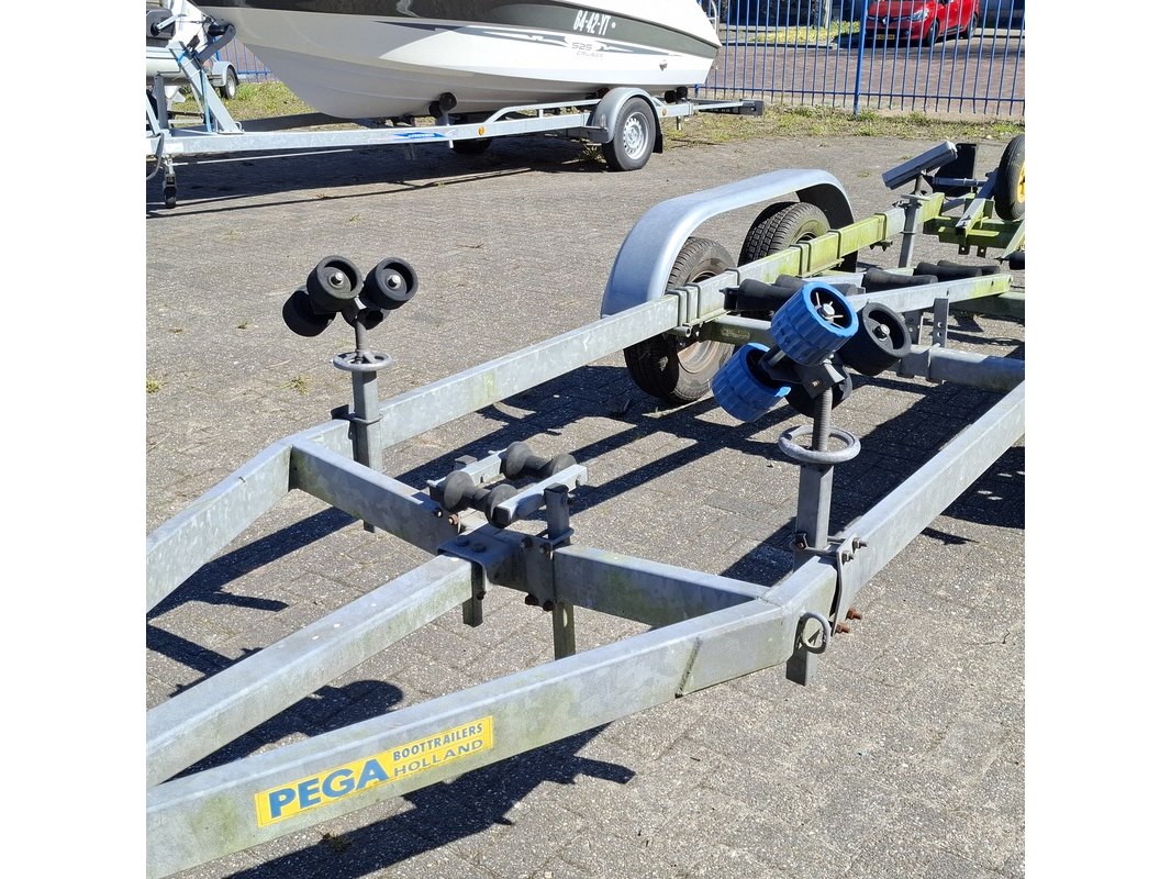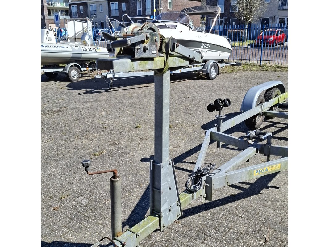 Merk: Pega Product: Boottrailer Materiaal: Gegalvaniseerd BouwJaar: 2006 Conditie: Gebruikt Specificaties: 2x 1350 kg assen van BPW, ongeremd. Lengte zonder uitschuifbalk ca. 600 cm Kantelbare centreer rollen en kielrollen 2 kimrollen en 2 achter steunen (het rubber op de achter steunen is oud) Verlichtingbalk aanwezig, niet getest, 1 buitenkap is beschadigt. Voorzien van lier, zelf inklappend neuswiel.