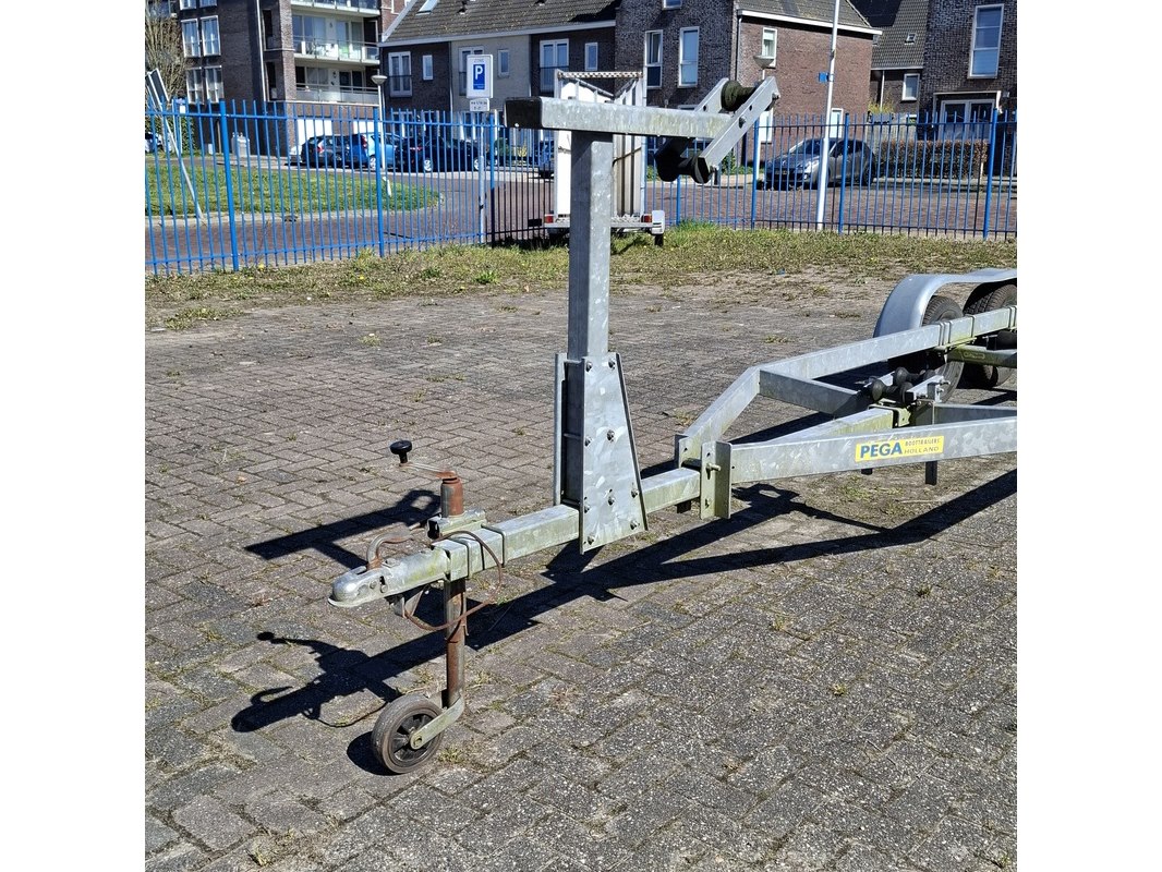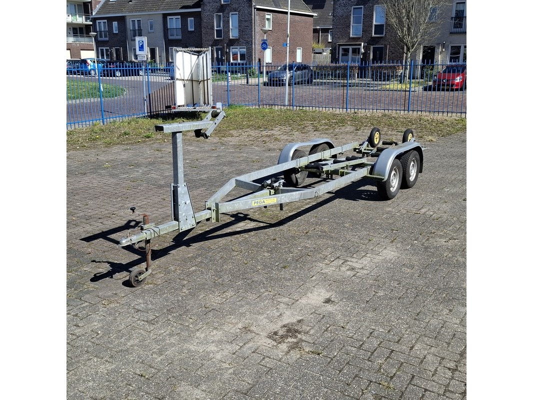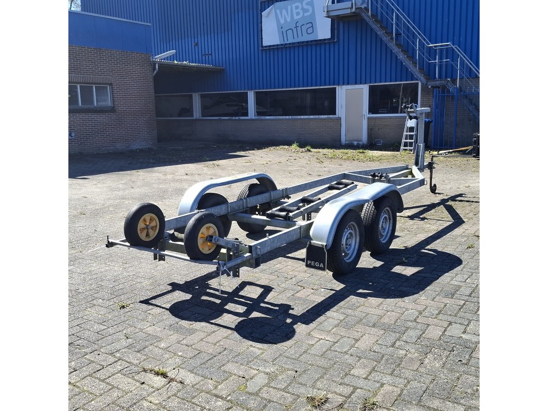 Merk: Pega Product: Boottrailer Materiaal: Gegalvaniseerd BouwJaar: 2006 Conditie: Gebruikt Specificaties: 2x 1350 kg assen van BPW, ongeremd Lengte zonder uitschuifbalk 600 cm Kantelbare centreer rollen en kielrollen geen verlichting aanwezig lichte beschadiging op wielkast