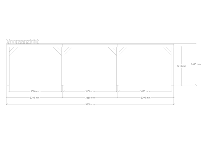 Merk: Verando Product: Douglas overkapping 407x986cm + wanden blank Materiaal: Douglas hout Conditie: nieuw Specificaties: De Douglas overkapping Living wordt geleverd als compleet bouwpakket, waarbij alle onderdelen op maat zijn gezaagd. Bij het pakket zit een duidelijke stap-voor-stap handleiding, evenals de benodigde schroeven voor de montage. Alle onderdelen zijn gemaakt uit fijnbezaagd Douglas hout van West-Europese kwaliteit. De constructie bestaat uit; palen van 15 x 15 cm, ringbalk van 5 x 20 cm, balklaag van 5 x 15 cm, dakbeschot van 1,8 cm dik en schoren van 5 x 15 cm. Bij deze overkapping zijn de zij- en achterwand(en) inbegrepen. De wand(en) bestaan uit de benodigde schroeven, Douglas houten regels en Zweeds rabatplanken. Ook voor de wandmontage is een duidelijke montagehandleiding inbegrepen. De overkapping is eenvoudig op te bouwen en daardoor geschikt voor doe-het-zelvers. De doorloophoogte is 224 cm en de totale hoogte is 245 cm. De overige maatvoering is terug te vinden op de 2e, 3e en 4e foto. De 5e en 6e foto geven een indruk van de houtkwaliteit.