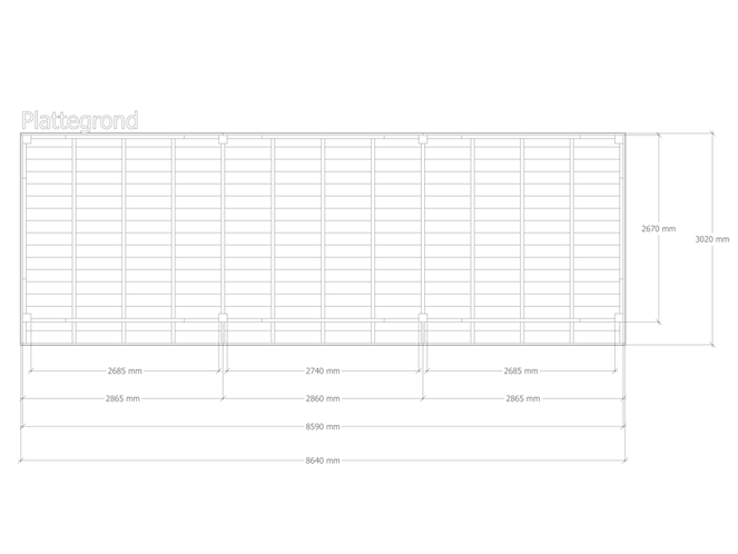 Merk: Verando Product: Douglas overkapping 302x864cm Materiaal: Douglas hout Conditie: nieuw Specificaties: De Douglas overkapping Pure wordt geleverd als compleet bouwpakket, waarbij alle onderdelen op maat zijn gezaagd. Bij het pakket zit een duidelijke stap-voor-stap handleiding, evenals de benodigde schroeven voor de montage. Alle onderdelen zijn gemaakt uit fijnbezaagd Douglas hout van West-Europese kwaliteit. De constructie bestaat uit; palen van 12 x 12 cm, ringbalk van 5 x 15 cm, balklaag van 5 x 15 cm, dakbeschot van 1,8 cm dik, schoren van 5 x 15 cm en boeiboorden van 2,2 x 20 cm. De overkapping is eenvoudig op te bouwen en daardoor geschikt voor doe-het-zelvers. De doorloophoogte is 224 cm en de totale hoogte is 260 cm. De overige maatvoering is terug te vinden op de 2e, 3e en 4e foto. De 5e en 6e foto geven een indruk van de houtkwaliteit.