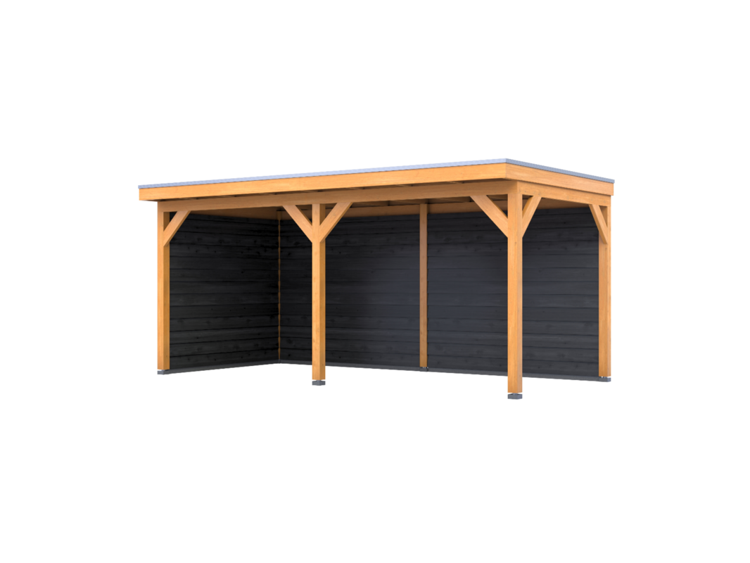 Merk: Verando Product: Douglas overkapping 402x578cm + wanden zwart Materiaal: Douglas hout Conditie: nieuw Specificaties: De Douglas overkapping Pure wordt geleverd als compleet bouwpakket, waarbij alle onderdelen op maat zijn gezaagd. Bij het pakket zit een duidelijke stap-voor-stap handleiding, evenals de benodigde schroeven voor de montage. Alle onderdelen zijn gemaakt uit fijnbezaagd Douglas hout van West-Europese kwaliteit. De constructie bestaat uit; palen van 12 x 12 cm, ringbalk van 5 x 15 cm, balklaag van 5 x 15 cm, dakbeschot van 1,8 cm dik, schoren van 5 x 15 cm en boeiboorden van 2,2 x 20 cm. Bij deze overkapping zijn de zij- en achterwand(en) inbegrepen. De wand(en) bestaan uit de benodigde schroeven, Douglas houten regels en zwart gedompelde Zweeds rabatplanken. Ook voor de wandmontage is een duidelijke montagehandleiding inbegrepen. De overkapping is eenvoudig op te bouwen en daardoor geschikt voor doe-het-zelvers. De doorloophoogte is 224 cm en de totale hoogte is 260 cm. De overige maatvoering is terug te vinden op de 2e, 3e en 4e foto. De 5e en 6e foto geven een indruk van de houtkwaliteit.