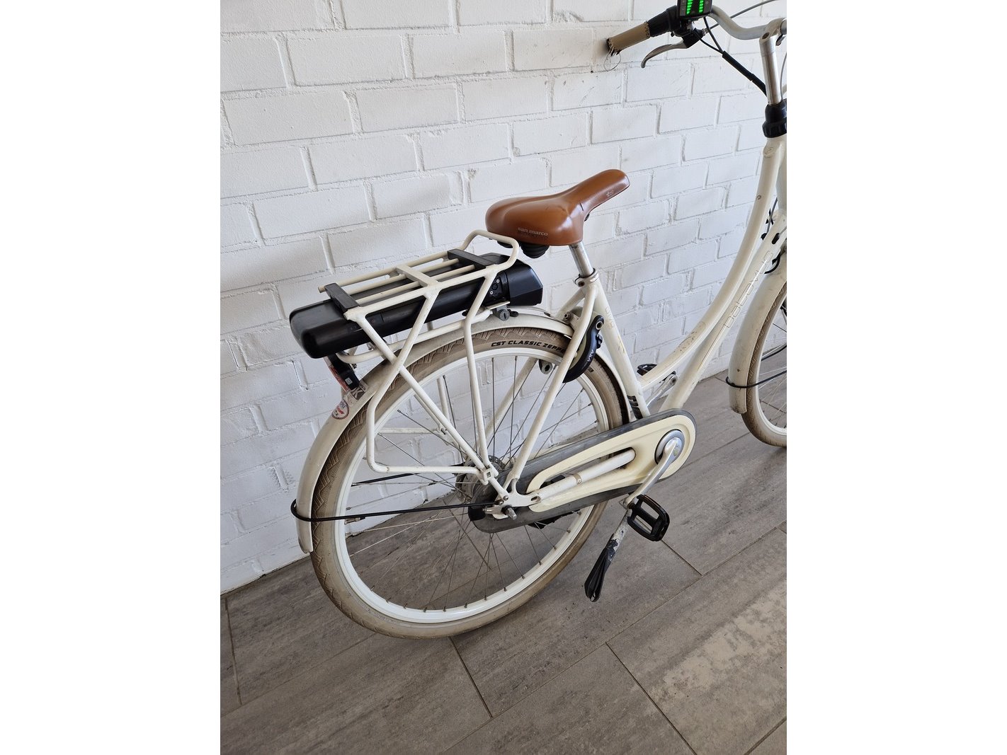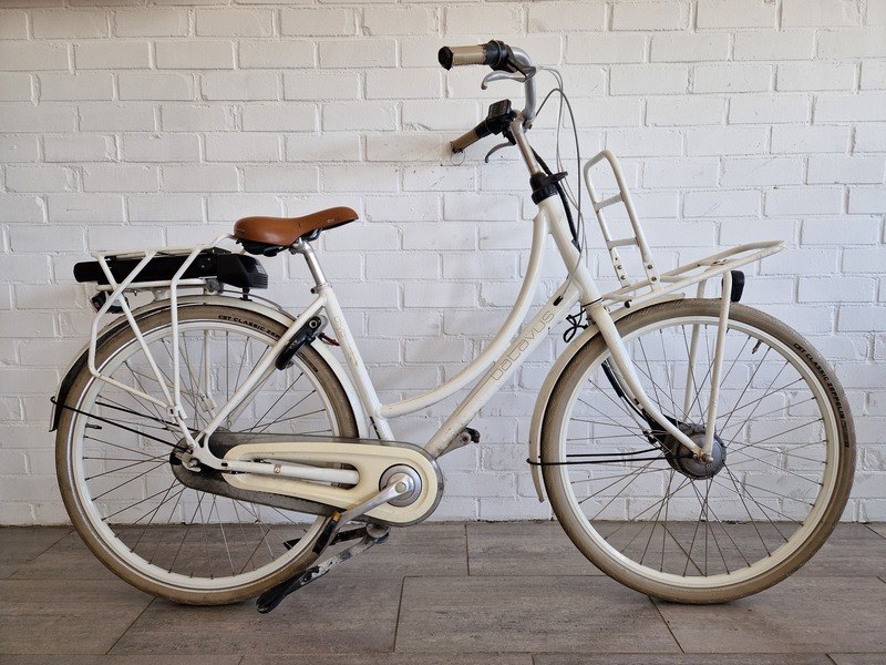 Merk: Batavus Product: Elektrische fiets Kleur: Wit Materiaal: Aluminium Afmeting: 28 inch Conditie: Gebruikt Specificaties: - Werkend weggezet - Nieuwe banden - Exclusief lader