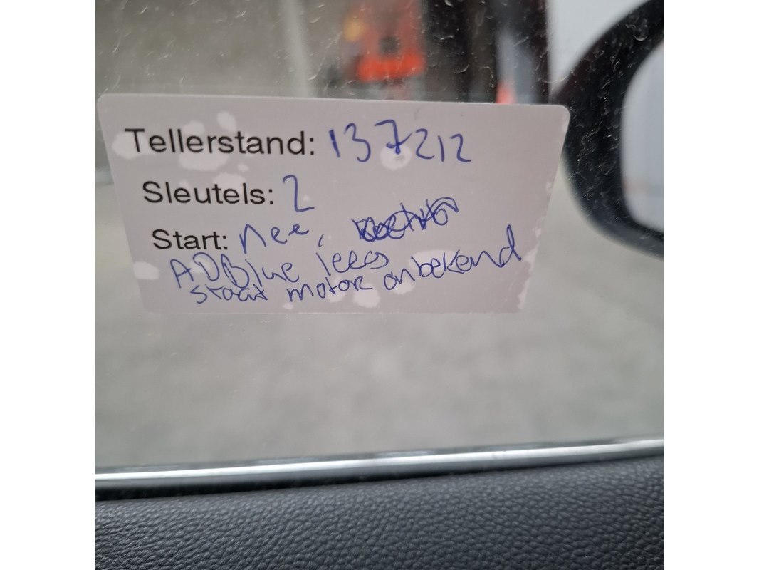 Merk: Renault Product: Personenauto Specificaties: Kenteken: Niet geregistreerd Eerste toelating nationaal: Niet geregistreerd APK vervaldatum: Niet van toepassing Brandstof: Diesel Transmissie: Handgeschakeld, 6 versnellingen Afgelezen tellerstand: Niet afleesbaar ivm geen / te weinig AdBlue Aantal sleutels: 2 + 1 handzender VIN nummer: Start: Onbekend ivm geen / te weinig AdBlue Opties e.d. Elektrische ramen en spiegels Airconditioning Cruisecontrol Navigatie Radio met display Parkeersensoren Waargenomen gebreken Geen / te weinig AdBlue. Starten is hierdoor niet mogelijk( status motor dus niet bekend) Gebruikssporen rondom. Achterbumper linksachter beschadigd.
