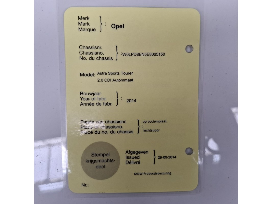 Merk: Opel Product: Personenauto BouwJaar: 2014 Specificaties: Kenteken: Niet geregistreerd Eerste toelating nationaal: Niet geregistreerd APK vervaldatum: Niet van toepassing Brandstof: Diesel Transmissie: Automaat Afgelezen tellerstand: 197.913 Aantal sleutels: 2 VIN nummer: W0LPD8EN5E8065150 Start: ja Opties e.d. Elektrische ramen en spiegels Airconditioning Cruisecontrol Navigatie Radio met display Parkeersensoren Voertuig is voorzien van stoelhoezen. Waargenomen gebreken Gebruikssporen rondom. Veel beschadigingen rondom portieren. Blauwe wrapfolie en afgeknipte bedrading / dichtgemaakte gaten op het dak. Gaten in dashboard. Voertuig is voorzien van stoelhoezen. Het Certificaat van Overeenstemming (CVO) is aanwezig bij het voertuig.