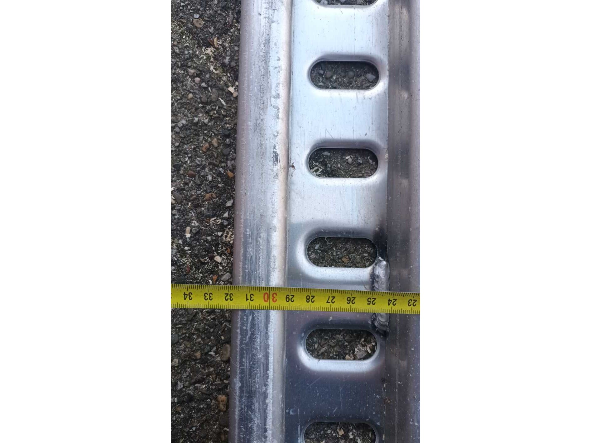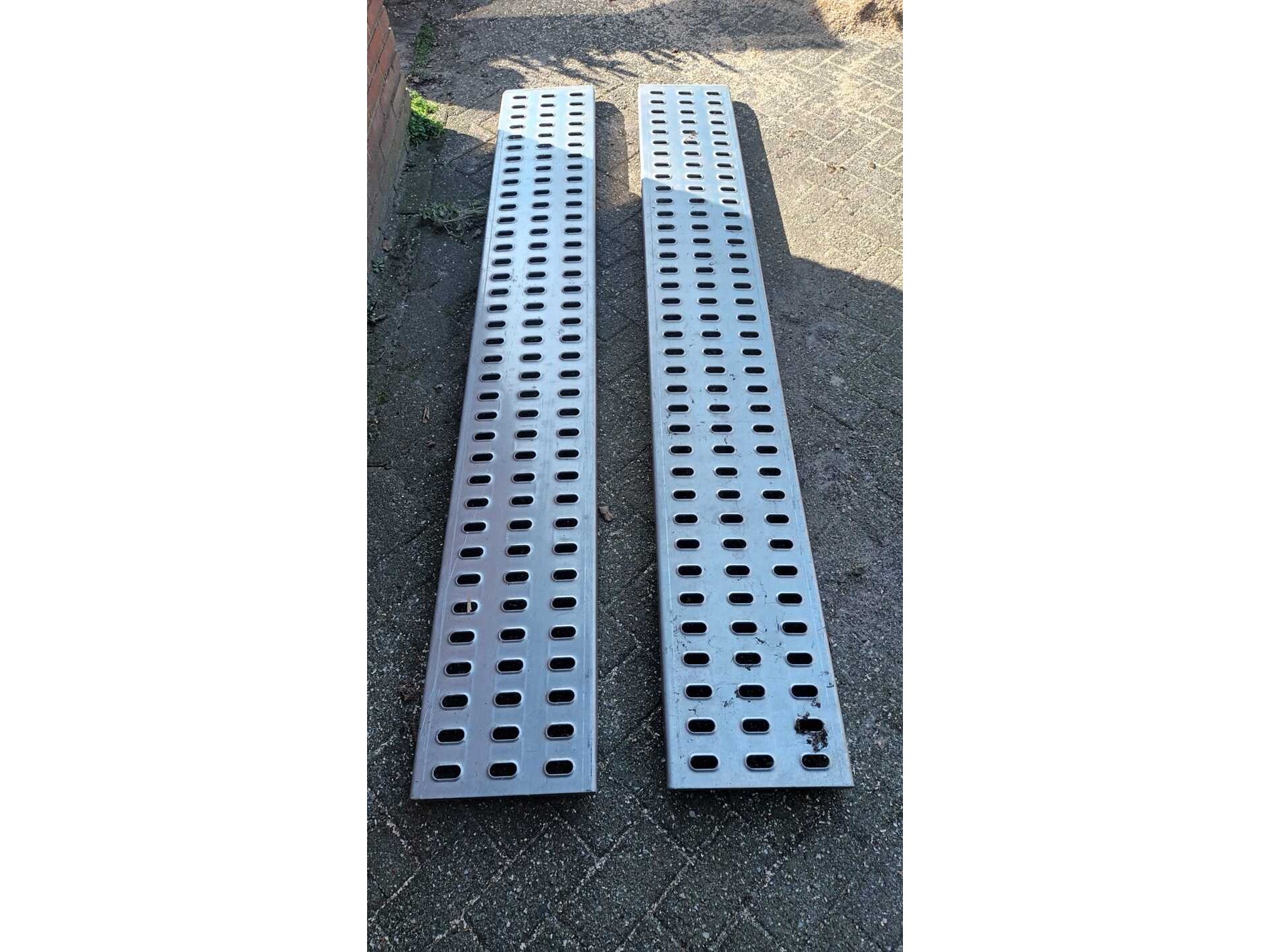 Product: Set Demo Oprijplaten Kleur: Grijs / Chroom Materiaal: Aluminium Afmeting: 230 cm x 32 cm x5,5 cm Conditie: Gebruikt Specificaties: Setje Demo Oprijplaten , ophanglip is verlengt Zaten onder een Renault auto transporter