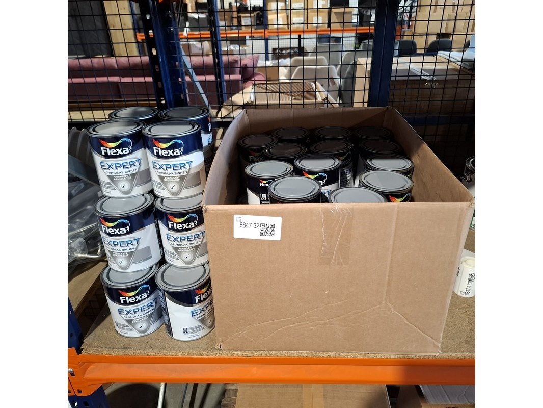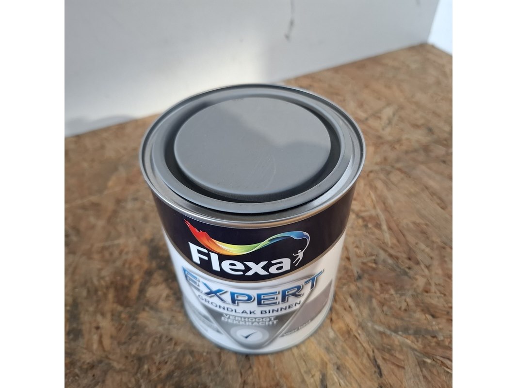 Merk: Flexa Product: Grondlak Kleur: Midden grijs Afmeting: 50 x 0,75 liter Conditie: Nieuw Specificaties: Partij van 50 blikken a 0,75 liter grondlak middenrgrijs.