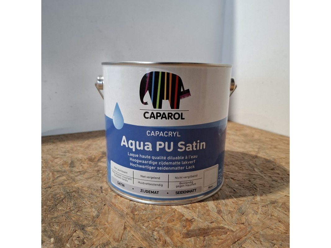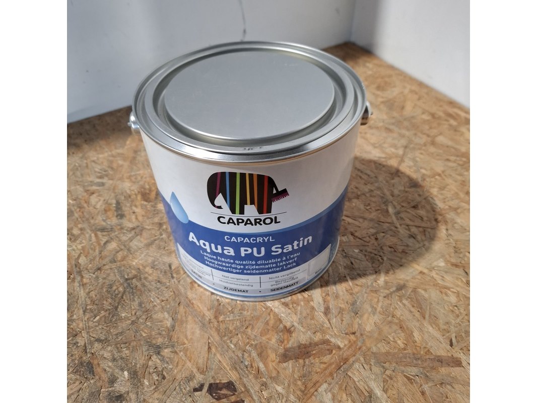 Product: Caparol PU Satin Kleur: Wit Afmeting: 4 x 2,5 liter Conditie: Nieuw Specificaties: Partij van 10 liter watergedragen zijdeglanslak wit.