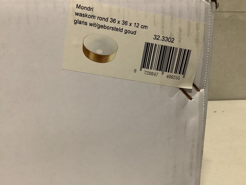 Merk: WB Product: Waskom 36x36x12 cm Kleur: Glans wit/Geb. Goud Materiaal: Keramiek Afmeting: 36x36x12 cm Conditie: Retourgoed