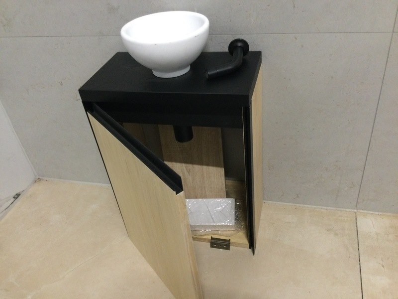Merk: WB Product: Meubel+ Waskom + kraan 55x40x22 cm Kleur: Bruin/zwart Conditie: Showmodel