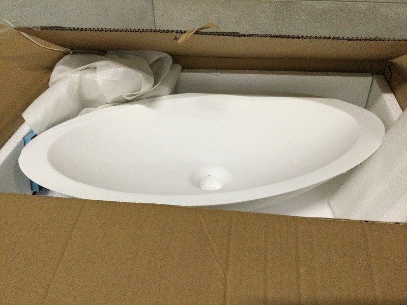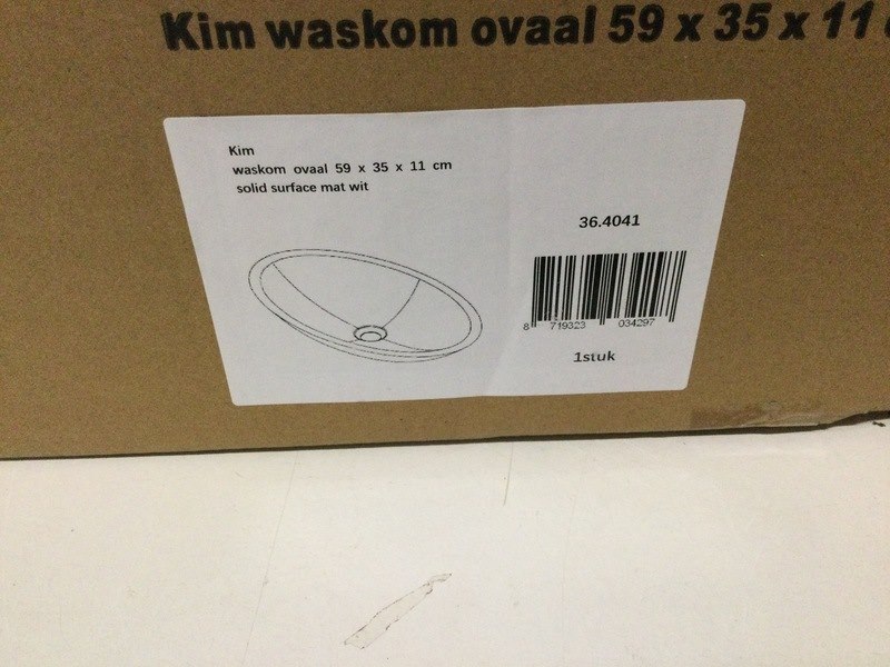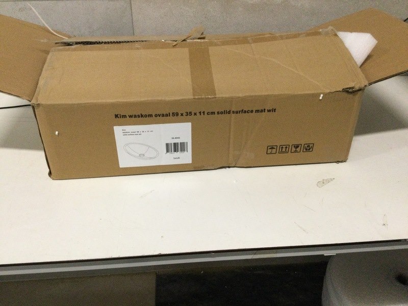 Merk: WB Product: Waskom ovaal 59x35x11 cm Kleur: Wit Materiaal: Solid Surface BouwJaar: Zonder kraan Conditie: Retourgoed Specificaties: Kleine beschadiging zie foto