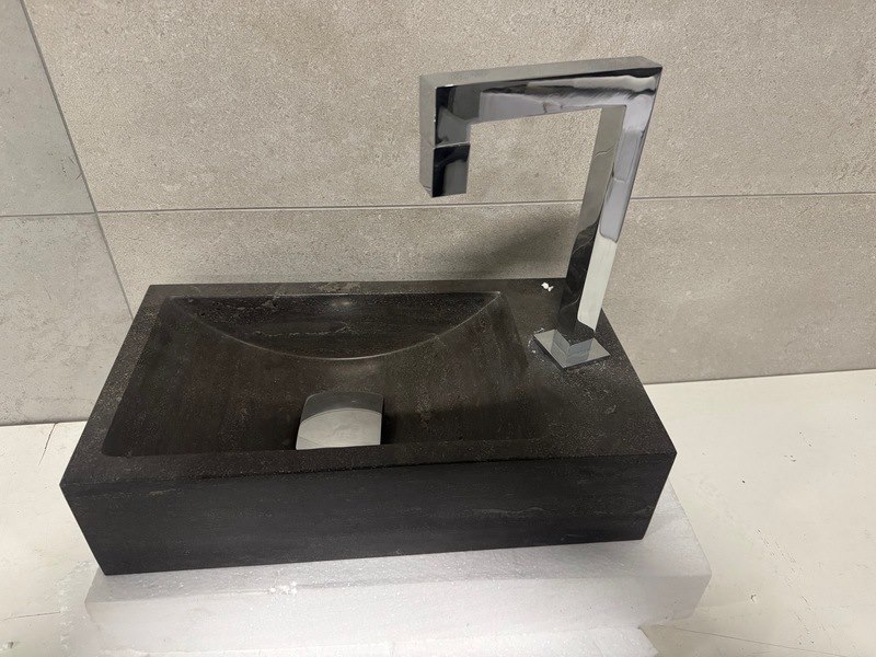 Merk: WB Product: Hardstenen fontein 40x22,3x10 cm + kraan Materiaal: Hardsteen Afmeting: 40x22,3x10 cm Conditie: Retourgoed