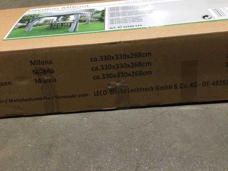 Merk: Leco Product: Paviljoentent 330x330x268 cm Kleur: Licht grijs Conditie: Nieuw Specificaties: Specificaties Hoogte: 268cm Lengte: 330cm Breedte: 330cm Diameter staanders (frame): 60mm Materiaal frame: Gepoedercoat staal Materiaal dakdoek: 100% Polyester, inclusief waterafstotende coating Materiaal zijdoeken: 100% Polyester, inclusief ritssluiting Kleur frame: Antraciet Kleur dakdoek: Grijs Kleur zijdoeken: Lichtgrijs
