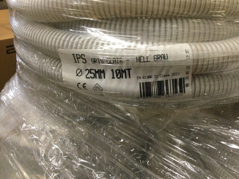 Merk: IPS Product: Pallet flexibele elektriciteits slangen Kleur: Lichtgrijs Afmeting: Rol 10 Meter lang Conditie: Nieuw Specificaties: Doorsnee slang 25 mm