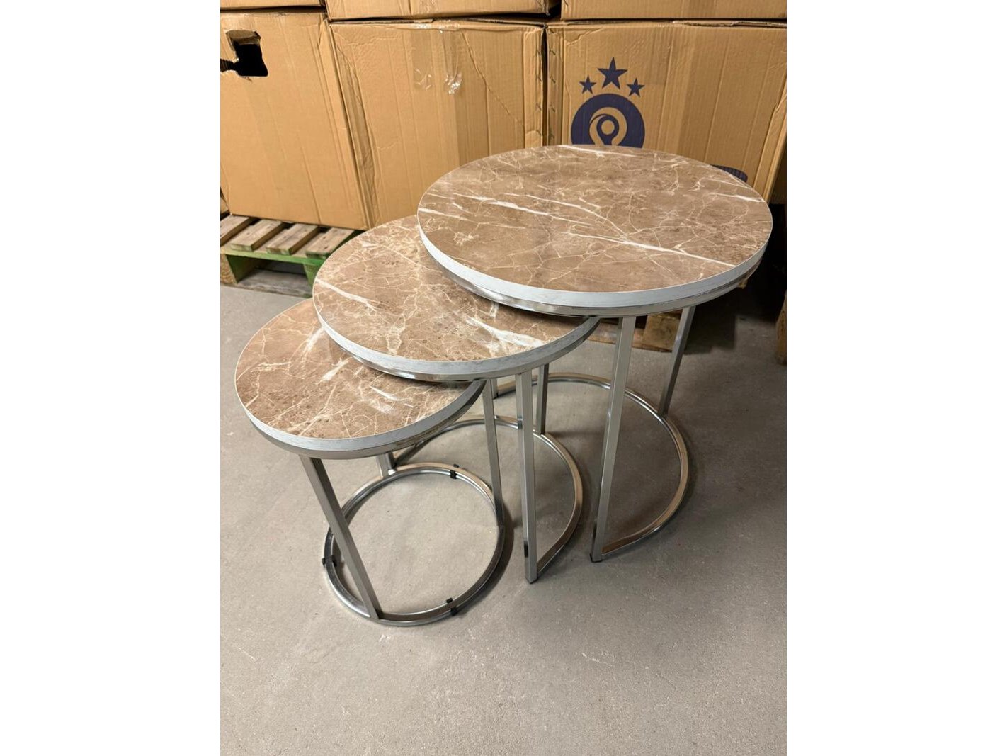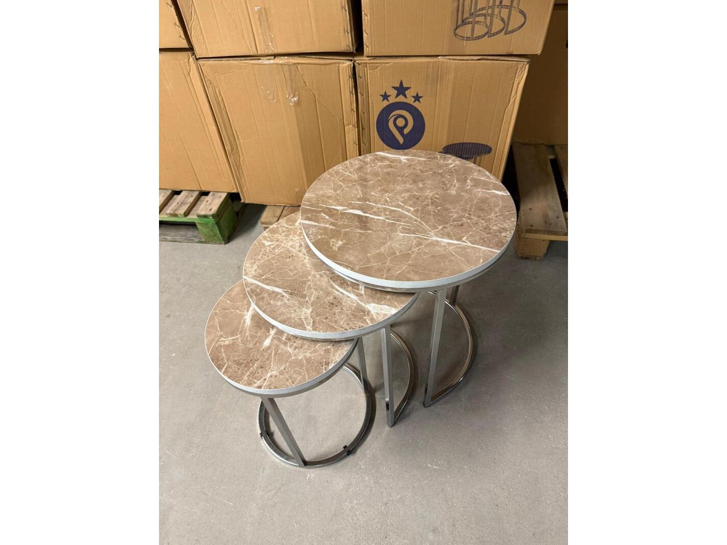 Product: 3-Delige bijzettafel Conditie: Nieuw Specificaties: Deze driedelige bijzettafel set combineert een verfijnd design met praktische veelzijdigheid. De tafels zijn ontworpen om perfect samen te gebruiken als speelse compositie, maar kunnen ook afzonderlijk worden geplaatst als stijlvolle bijzettafel, salontafel of decoratief element. Het elegante onderstel zorgt voor een luxe en luchtige uitstraling, terwijl het ronde blad een tijdloos karakter toevoegt. Dankzij de verschillende hoogtes en diameters schuiven de tafels moeiteloos onder elkaar, wat ruimtebesparend én visueel aantrekkelijk is. Ideaal voor de woonkamer, slaapkamer, hal of kantoor. De set past perfect in zowel moderne, minimalistische als klassieke interieurs en vormt een subtiele blikvanger in elke ruimte. Afmetingen Grote tafel Hoogte: 52 cm Diameter: 47 cm Middelgrote tafel Hoogte: 47 cm Diameter: 39 cm Kleine tafel Hoogte: 42 cm Diameter: 31 cm"