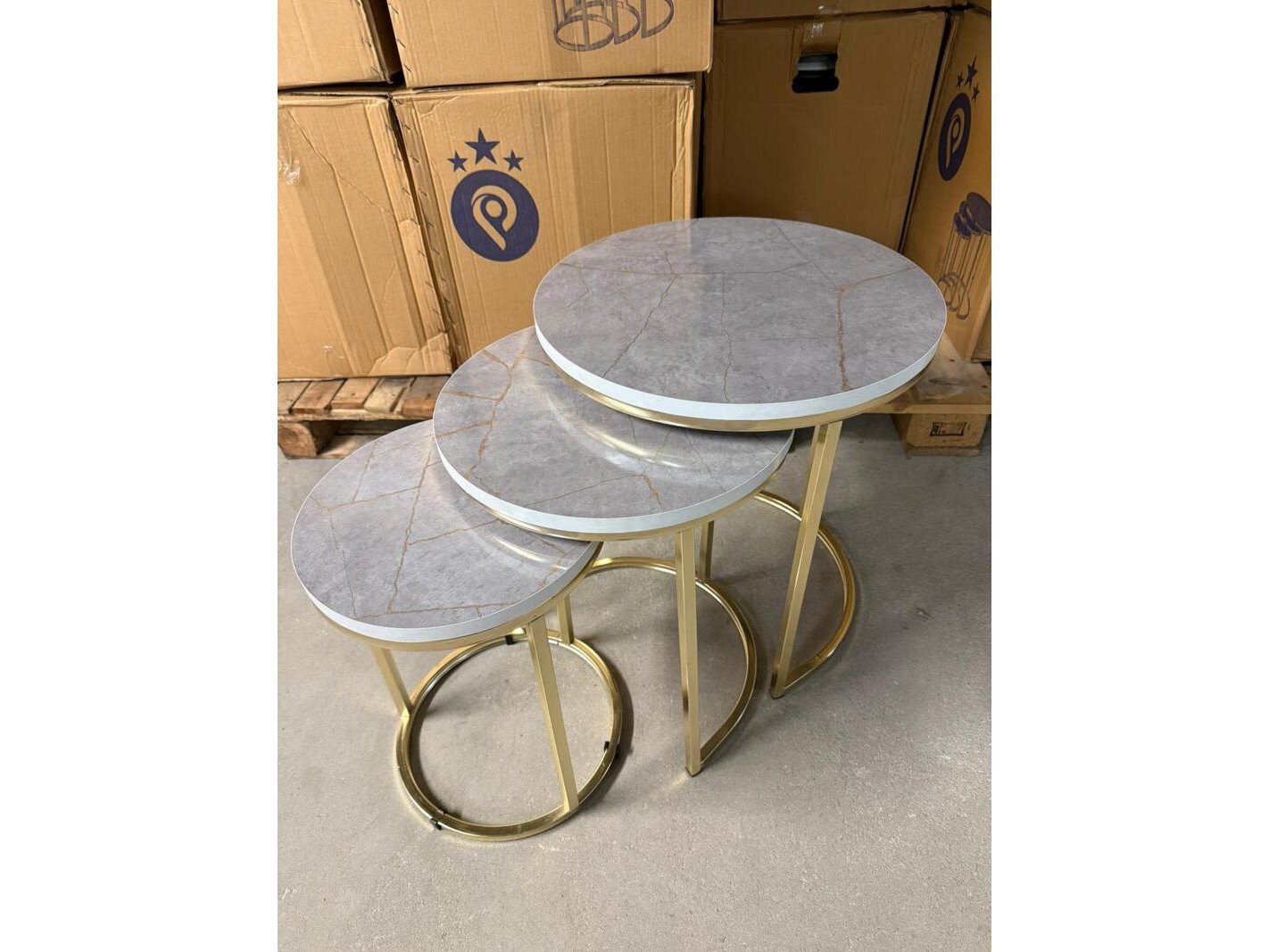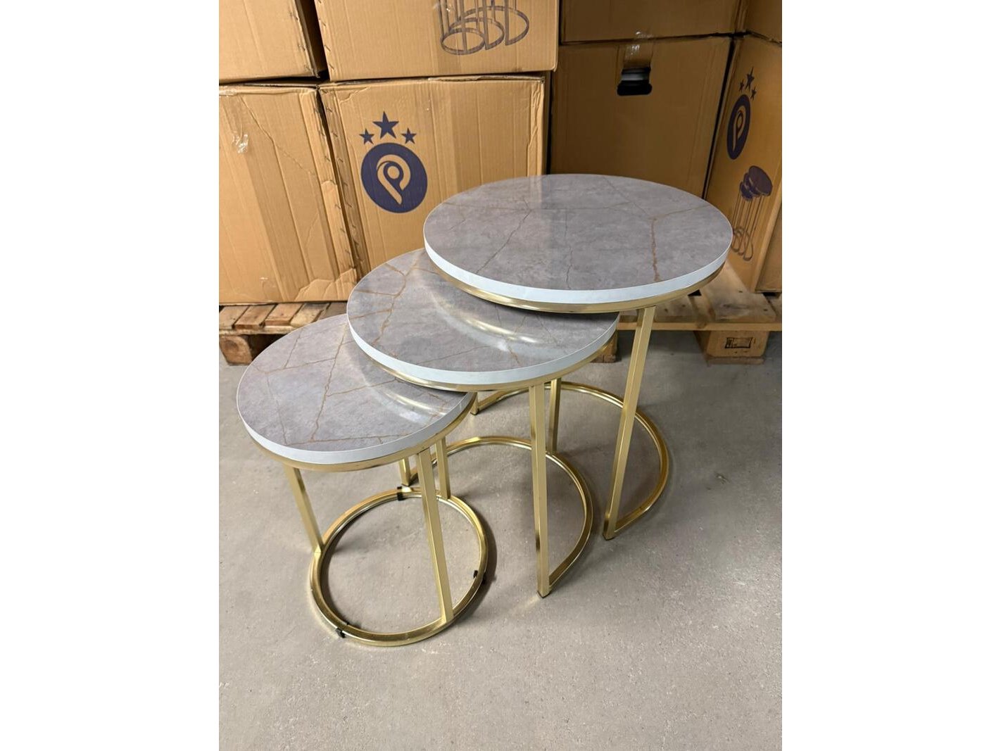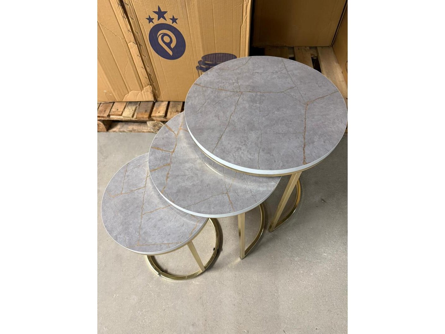 Product: 3-Delige bijzettafel Conditie: Nieuw Specificaties: Deze driedelige bijzettafel set combineert een verfijnd design met praktische veelzijdigheid. De tafels zijn ontworpen om perfect samen te gebruiken als speelse compositie, maar kunnen ook afzonderlijk worden geplaatst als stijlvolle bijzettafel, salontafel of decoratief element. Het elegante onderstel zorgt voor een luxe en luchtige uitstraling, terwijl het ronde blad een tijdloos karakter toevoegt. Dankzij de verschillende hoogtes en diameters schuiven de tafels moeiteloos onder elkaar, wat ruimtebesparend én visueel aantrekkelijk is. Ideaal voor de woonkamer, slaapkamer, hal of kantoor. De set past perfect in zowel moderne, minimalistische als klassieke interieurs en vormt een subtiele blikvanger in elke ruimte. Afmetingen Grote tafel Hoogte: 52 cm Diameter: 47 cm Middelgrote tafel Hoogte: 47 cm Diameter: 39 cm Kleine tafel Hoogte: 42 cm Diameter: 31 cm"