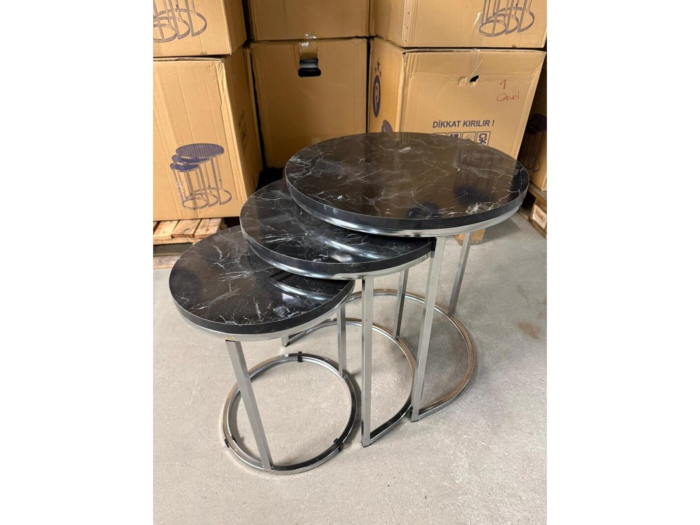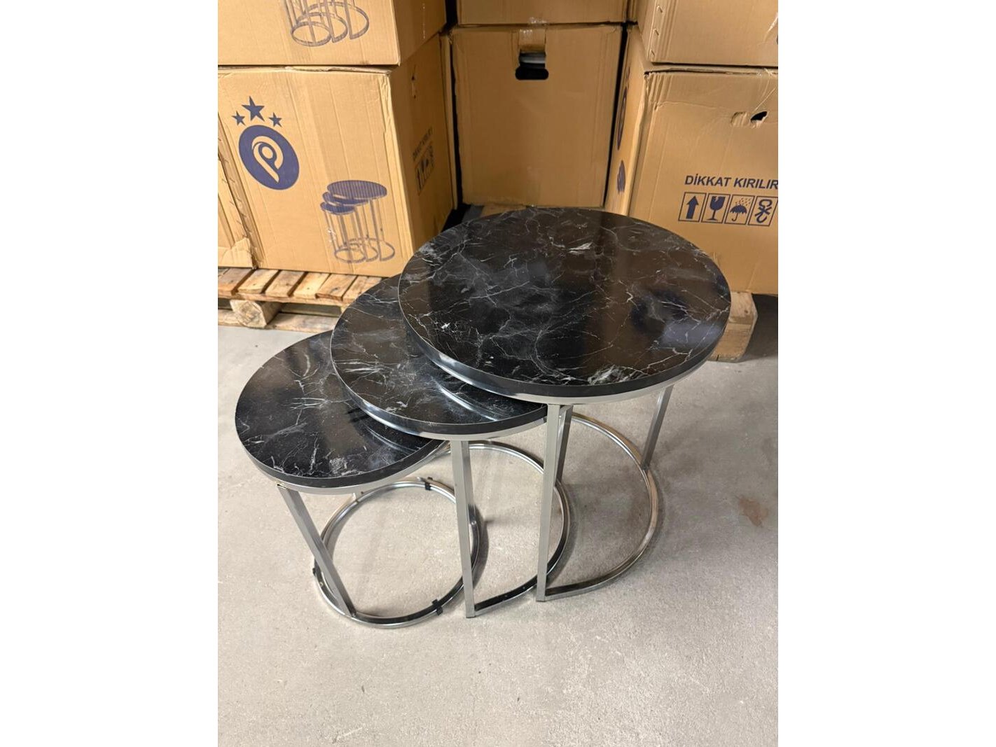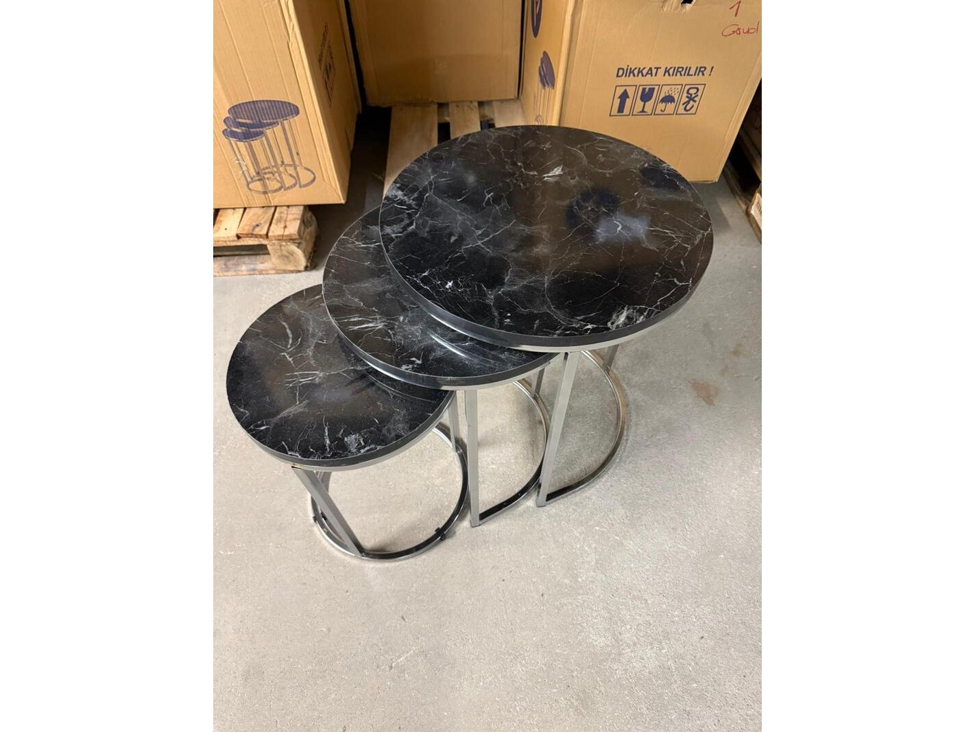 Product: 3-Delige bijzettafel Conditie: Nieuw Specificaties: Deze driedelige bijzettafel set combineert een verfijnd design met praktische veelzijdigheid. De tafels zijn ontworpen om perfect samen te gebruiken als speelse compositie, maar kunnen ook afzonderlijk worden geplaatst als stijlvolle bijzettafel, salontafel of decoratief element. Het elegante onderstel zorgt voor een luxe en luchtige uitstraling, terwijl het ronde blad een tijdloos karakter toevoegt. Dankzij de verschillende hoogtes en diameters schuiven de tafels moeiteloos onder elkaar, wat ruimtebesparend én visueel aantrekkelijk is. Ideaal voor de woonkamer, slaapkamer, hal of kantoor. De set past perfect in zowel moderne, minimalistische als klassieke interieurs en vormt een subtiele blikvanger in elke ruimte. Afmetingen Grote tafel Hoogte: 52 cm Diameter: 47 cm Middelgrote tafel Hoogte: 47 cm Diameter: 39 cm Kleine tafel Hoogte: 42 cm Diameter: 31 cm"