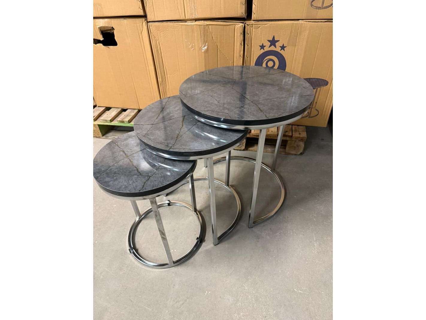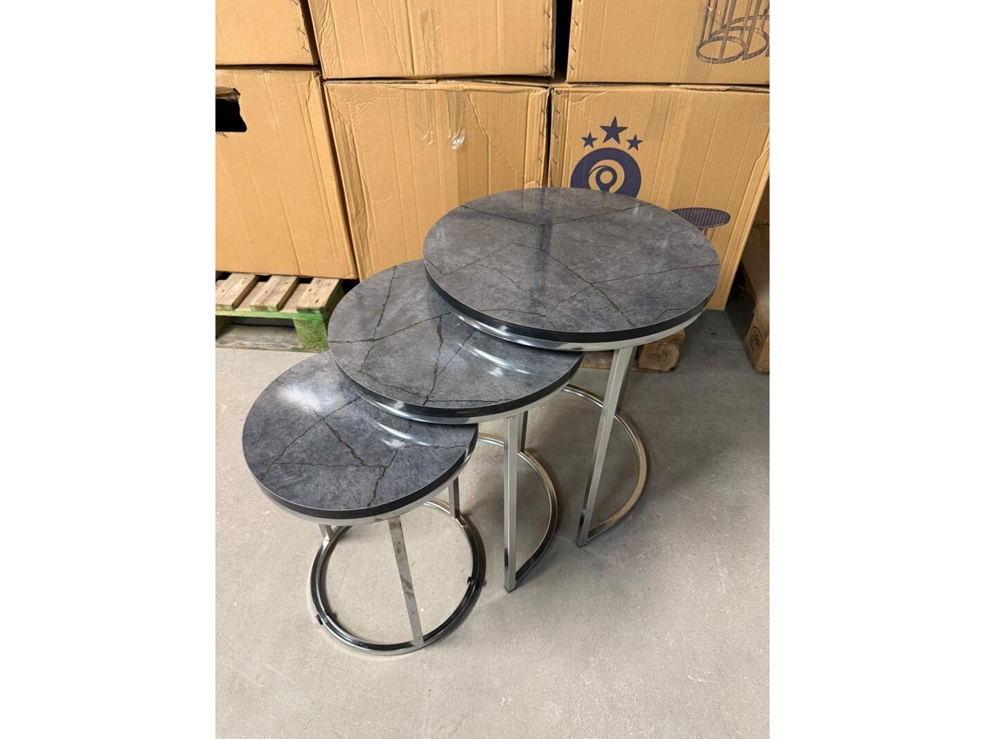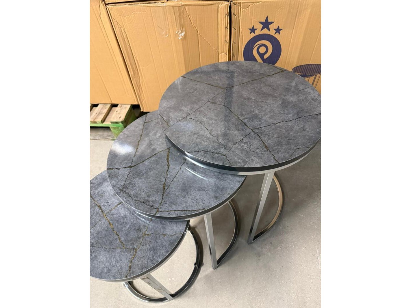 Product: 3-Delige bijzettafel Conditie: Nieuw Specificaties: Deze driedelige bijzettafel set combineert een verfijnd design met praktische veelzijdigheid. De tafels zijn ontworpen om perfect samen te gebruiken als speelse compositie, maar kunnen ook afzonderlijk worden geplaatst als stijlvolle bijzettafel, salontafel of decoratief element. Het elegante onderstel zorgt voor een luxe en luchtige uitstraling, terwijl het ronde blad een tijdloos karakter toevoegt. Dankzij de verschillende hoogtes en diameters schuiven de tafels moeiteloos onder elkaar, wat ruimtebesparend én visueel aantrekkelijk is. Ideaal voor de woonkamer, slaapkamer, hal of kantoor. De set past perfect in zowel moderne, minimalistische als klassieke interieurs en vormt een subtiele blikvanger in elke ruimte. Afmetingen Grote tafel Hoogte: 52 cm Diameter: 47 cm Middelgrote tafel Hoogte: 47 cm Diameter: 39 cm Kleine tafel Hoogte: 42 cm Diameter: 31 cm"