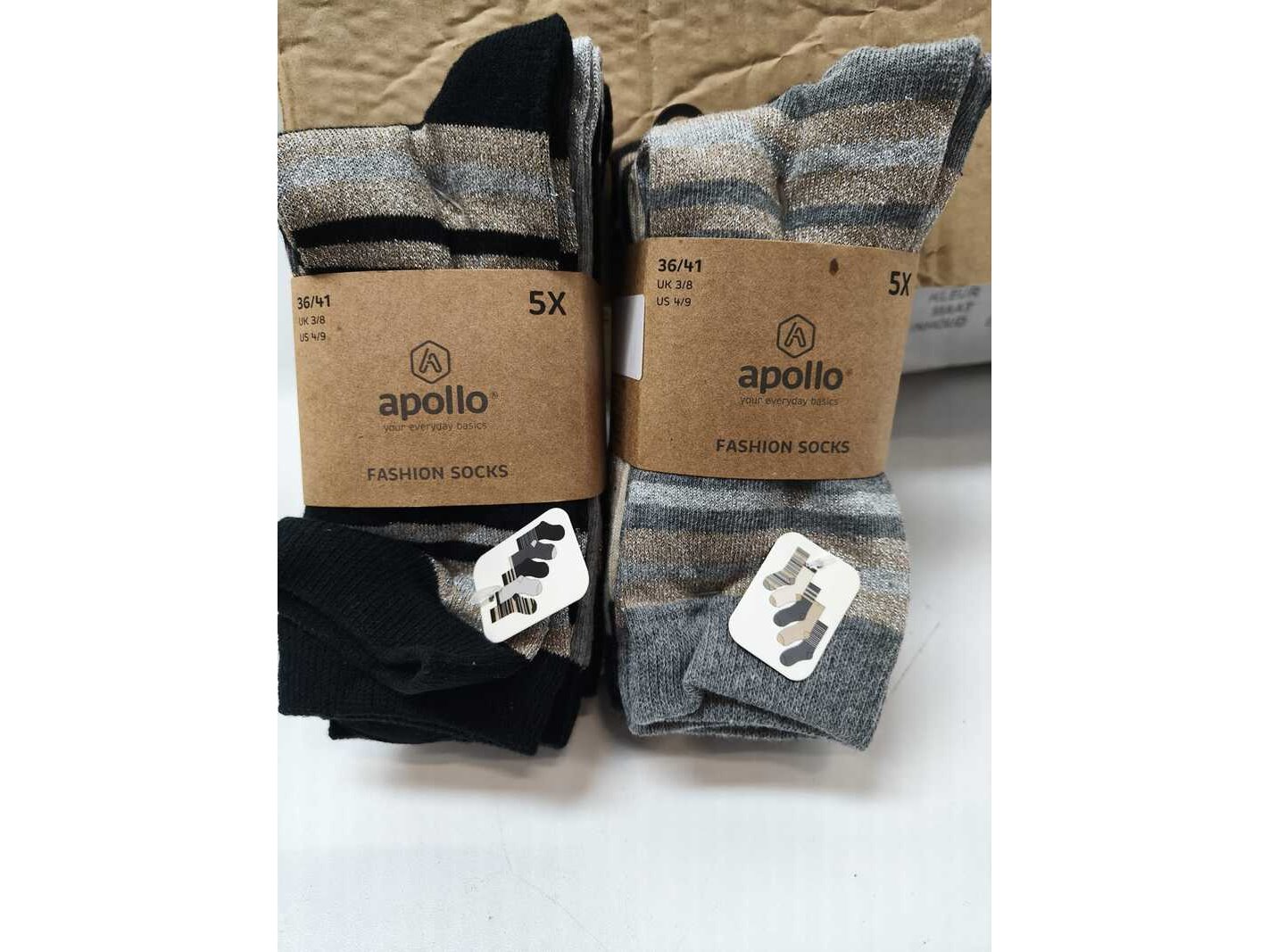 Merk: Apollo Product: Paar damessokken Kleur: Diverse kleuren Materiaal: 75 % Katoen Afmeting: Maat 36/41 Conditie: Nieuw