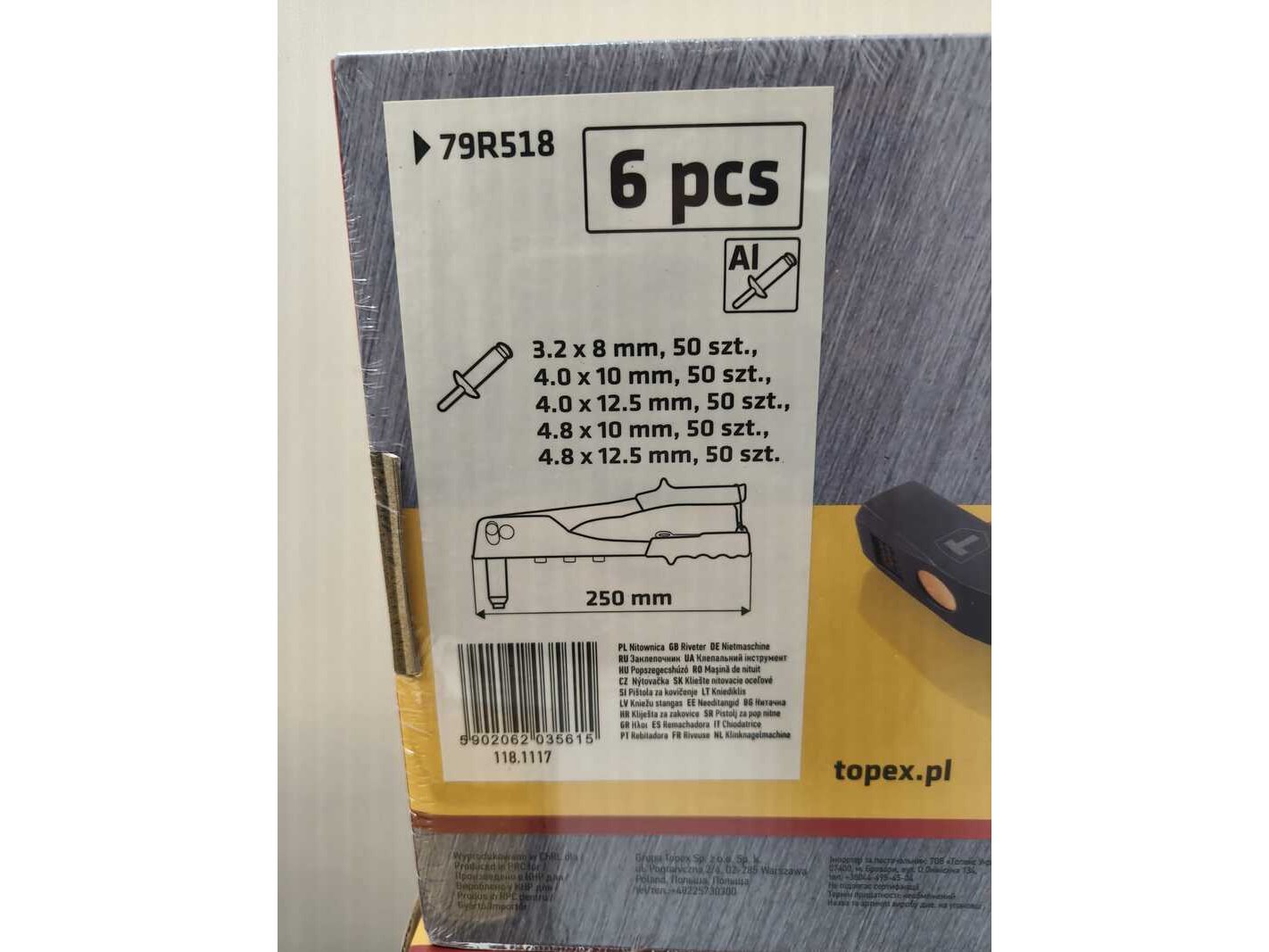 Merk: Topex Product: 6-Delige popnageltangen Kleur: Geel/chroom Afmeting: Diverse maten popnagels Conditie: Nieuw