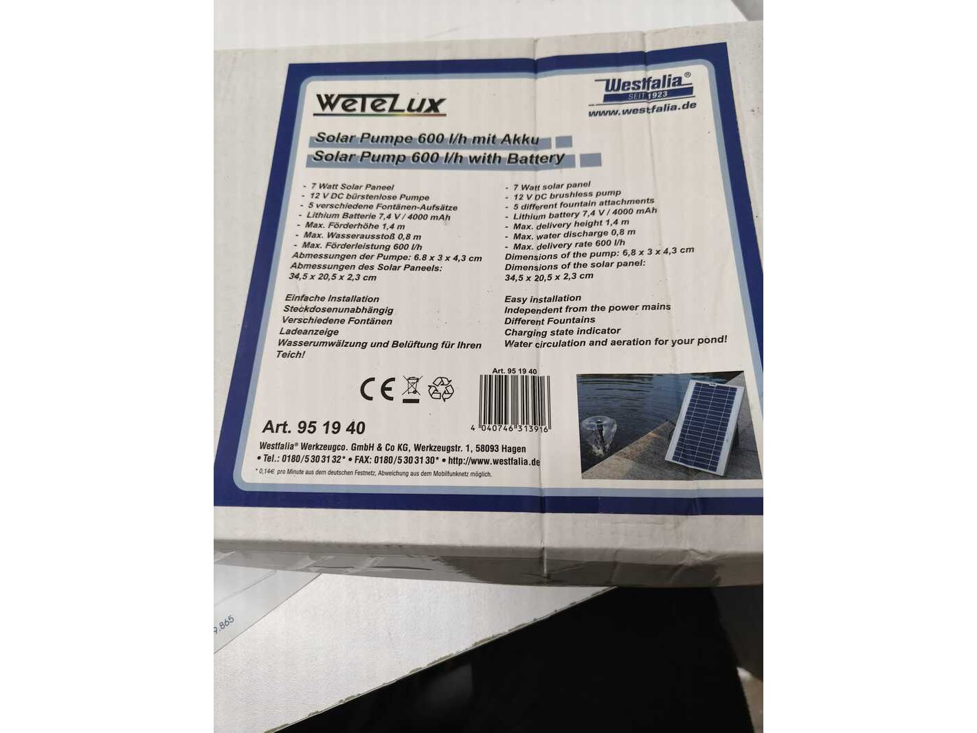 Merk: Westfalia Product: Vijverpomp Conditie: Nieuw Specificaties: 600 L/u op zonnenenergie
