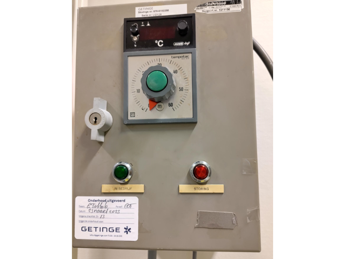 Merk: Ad. Lindeman Product: Autoclaaf Conditie: gebruikt Specificaties: Autoclaaf / sterilisator • Merk: Ad. Lindeman • Toepassing: Steriliseren met hitte en druk (bijvoorbeeld materialen, instrumenten of afval) Besturingskast • Servicepartij / fabrikant: Getinge • Temperatuurregeling: Zichtbaar via JUMO temperatuurregelaar (JUMO = fabrikant van meet- en regeltechniek voor temperatuur en procesbewaking) Onderhoud • Onderhoudssticker aanwezig o Onderhoud uitgevoerd door: Getinge o Datum onderhoud: 23 maart 2023 Gebruik • Deze autoclaaf is bedoeld voor sterilisatie met hitte en druk en is voorzien van een aparte besturingskast met goed afleesbare temperatuurregeling.