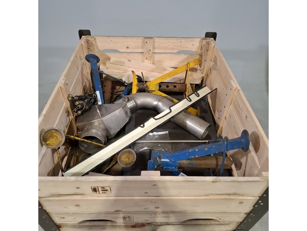 Product: Partij diversen Specificaties: Bestaande uit o.a. as steunen, rvs profiel, houten balkjes, autowas borstel steel, rubberen riem, etc Technische staat en compleetheid onbekend. Exclusief palletkist.
