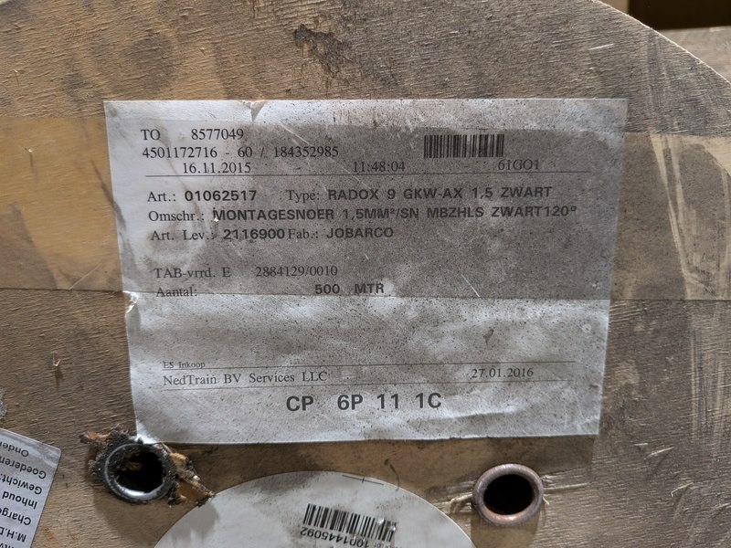 Merk: Huber+Suhner Product: (NS materiaal) Haspel met elektrische kabel Afmeting: Doorsnede: 1x 1,5 mm²