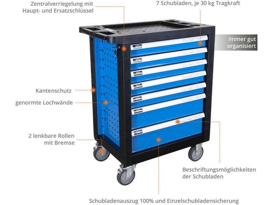 Merk: Gude Product: Gereedschap wagen gevuld Afmeting: 460x683x980 mm Conditie: nieuw Specificaties: 7 laden, 250-DLG, 67,6 Kg, afsluitbaar (2 sl)