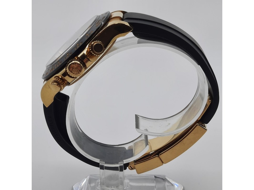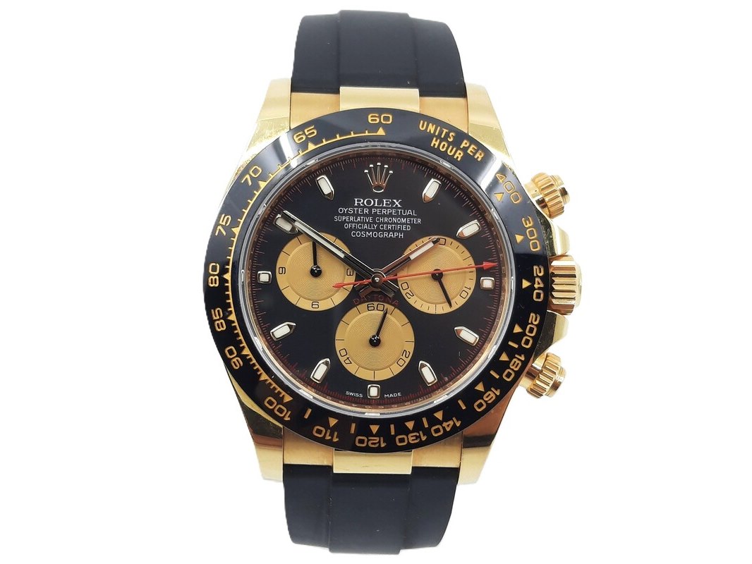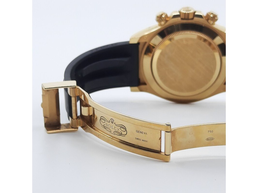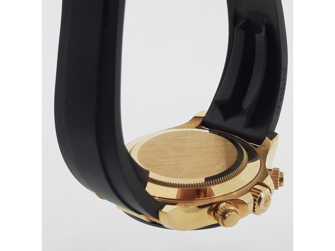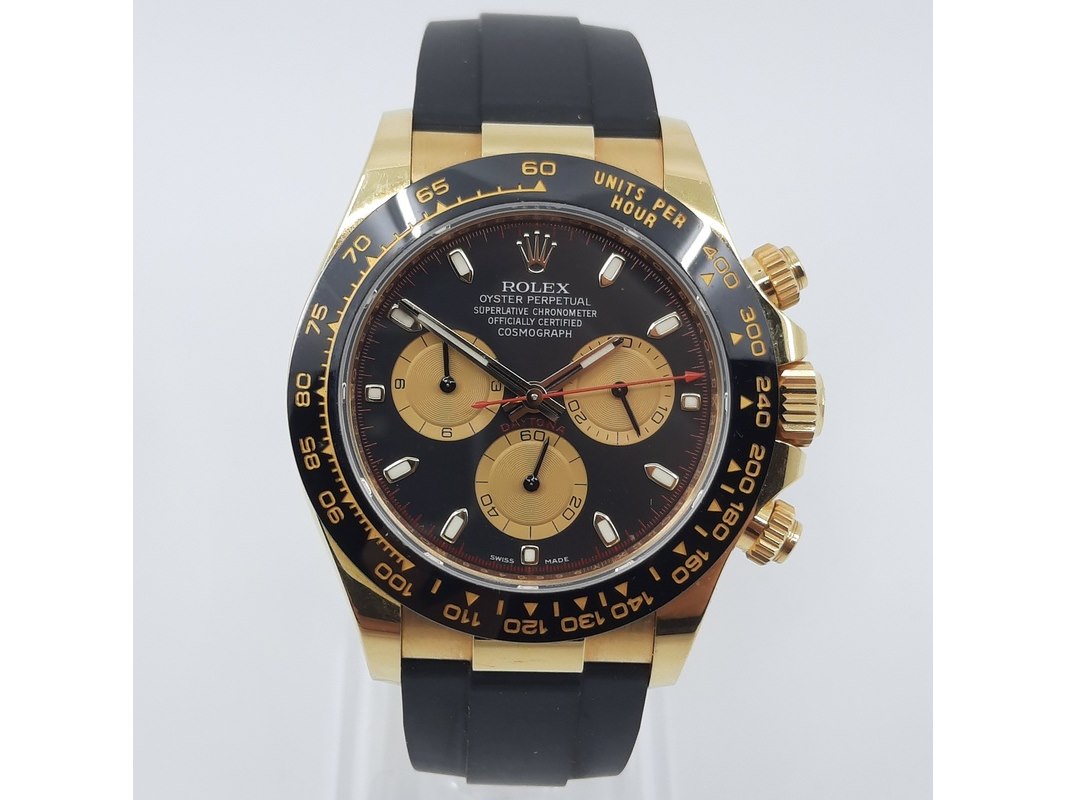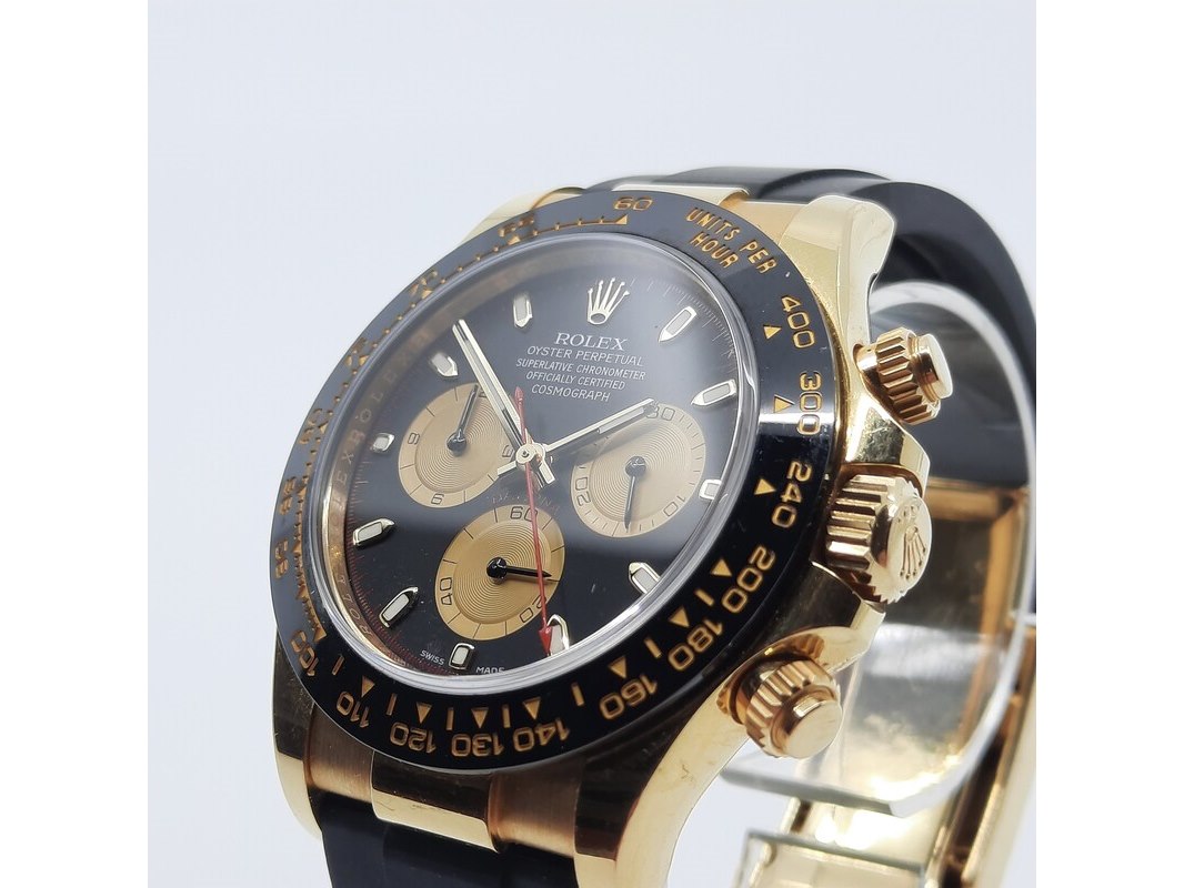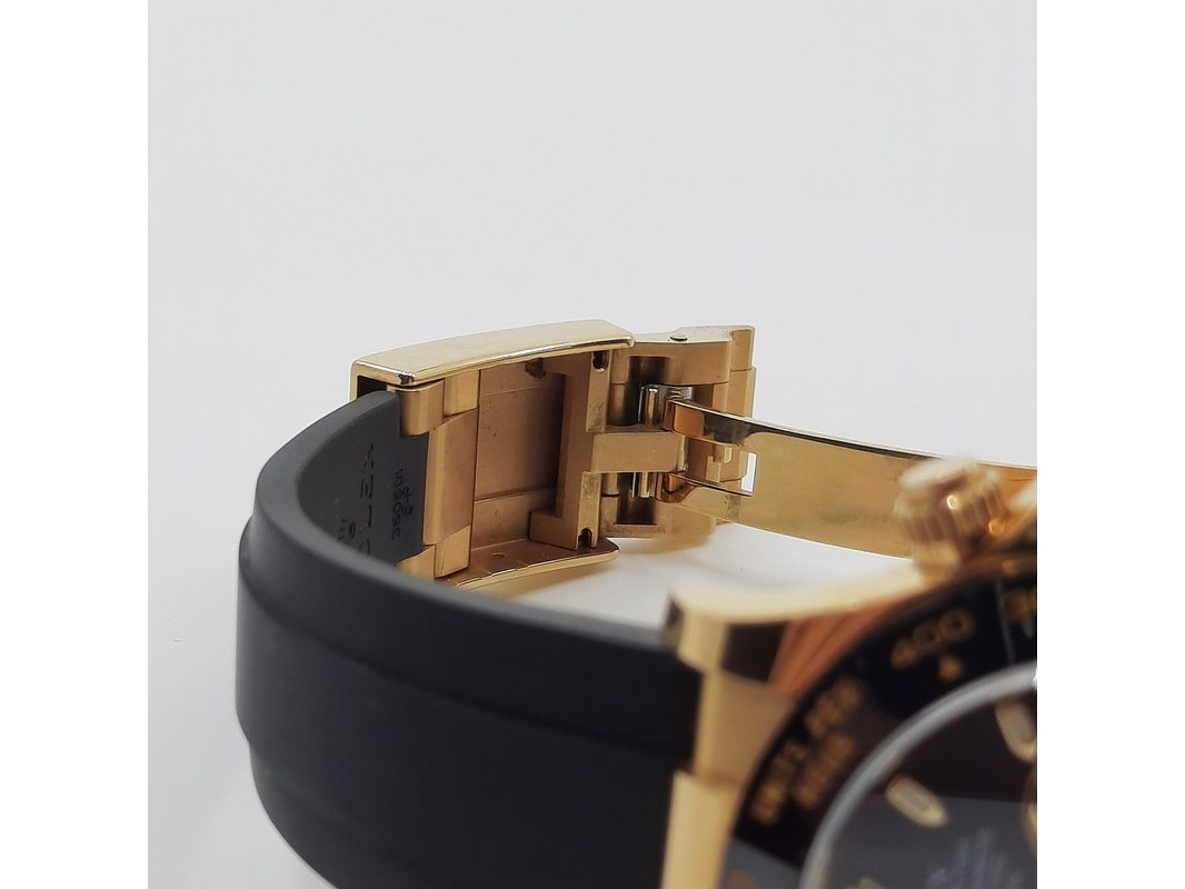 Merk: Rolex Product: Heren polshorloge Conditie: gebruikt Specificaties: Een 18 karaats geelgouden heren polshorloge, Rolex Daytona 116518LN. Met zwarte keramische lunet, tachymeterindex, zwarte wijzerplaat met drie doré registers, lijn index, rode secondewijzer, automatisch uurwerk, kaliber 4130 en rubber band met geelgouden sluiting. Inclusief doos en certificaat.