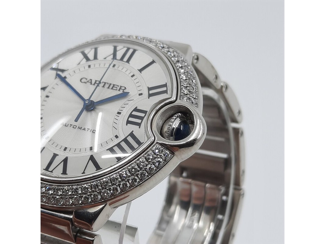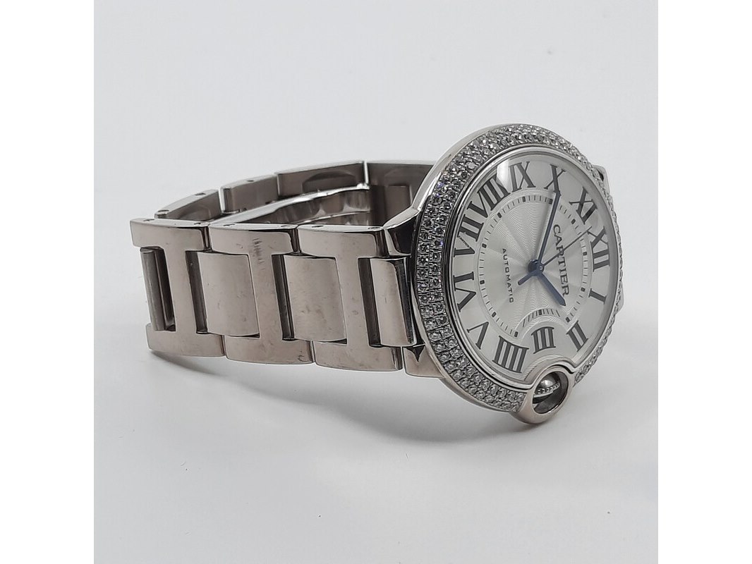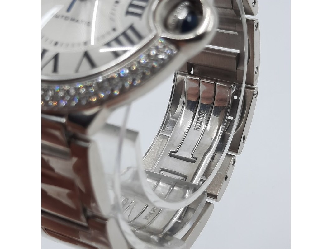 Merk: Cartier Product: Heren polshorloge Conditie: Gebruikt Specificaties: Een witgouden heren polshorloge, Cartier Ballon Bleu 3004. Met zilverwitte wijzerplaat, lunette bezet met twee rijen briljant geslepen diamanten en witgouden band. Gehalte ''750'' bruto gewicht ca. 143,6 gram. Geen doos en geen certificaat.