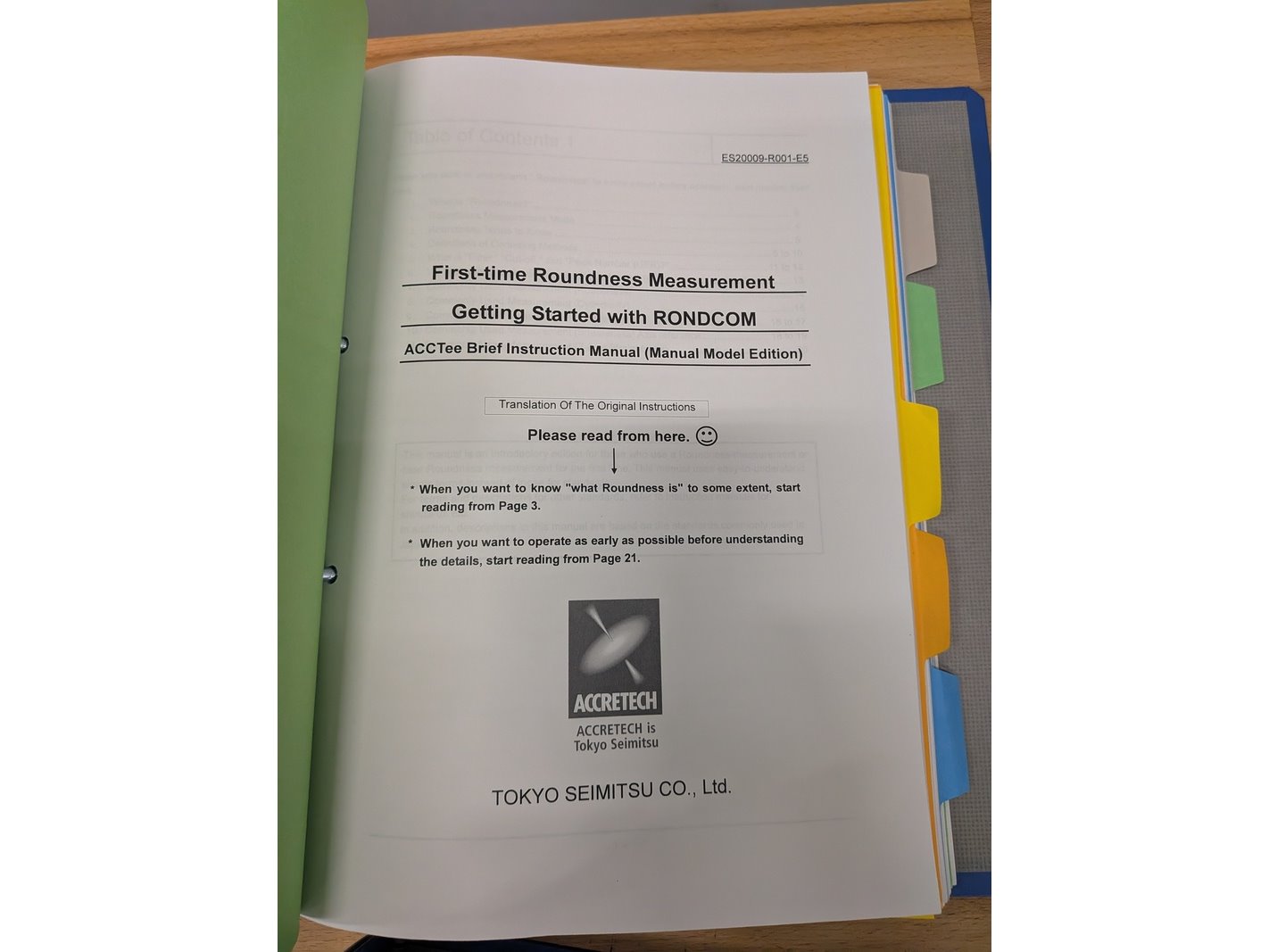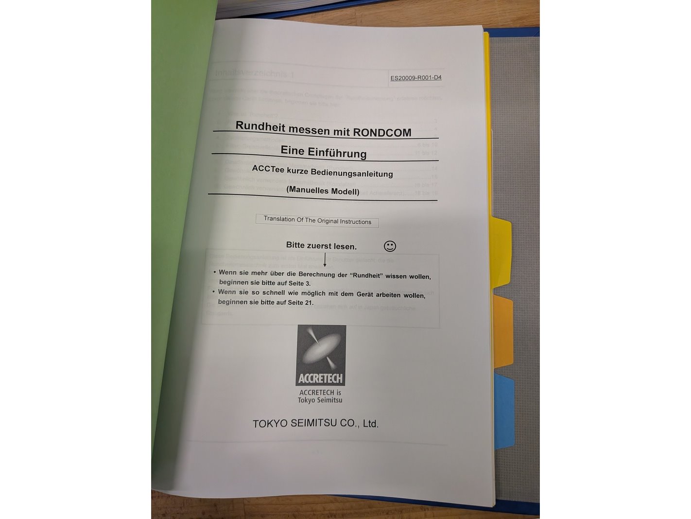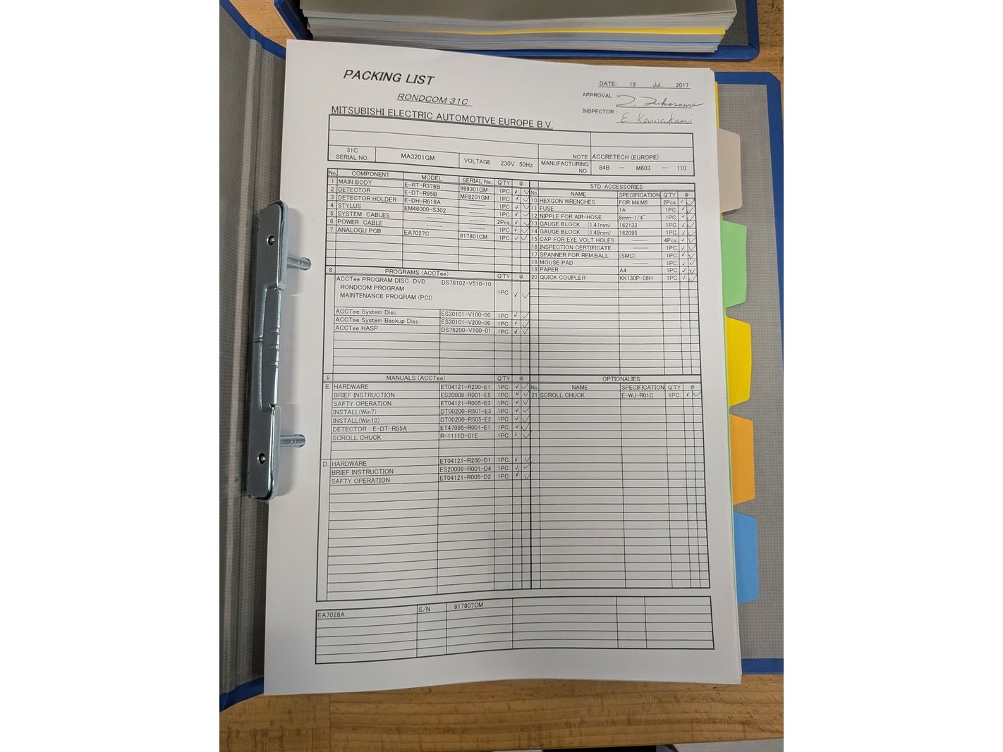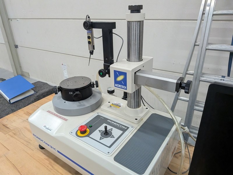 Merk: Tokyo Seimitsu Product: Rondheidsmeetinstrument met divers toebehoren BouwJaar: 2017 Specificaties: "RONDCOM 31C is een precisie‑meetmachine voor vorm- en rondheidsmetingen. Het wordt gebruikt gebruikt voor kwaliteitscontrole en metrologie van precisie‑onderdelen, vooral in een QA‑lab of productieomgeving. Typische metingen: Rondheid (Roundness) Excentriciteit Concentriciteit Coaxialiteit Radiale slingering (run‑out)" 230V, serienummer MA3201GM exclusief werkbank