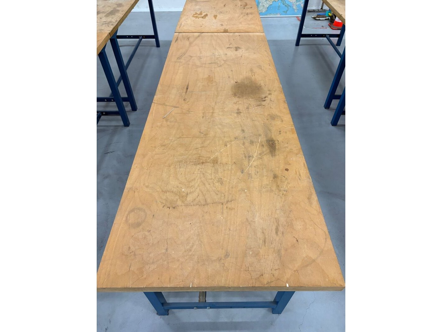 Product: Werkbank Materiaal: metalen frame, houten blad Afmeting: lxbxh ca. 200x75x86 Specificaties: Exclusief zichtbare randzaken